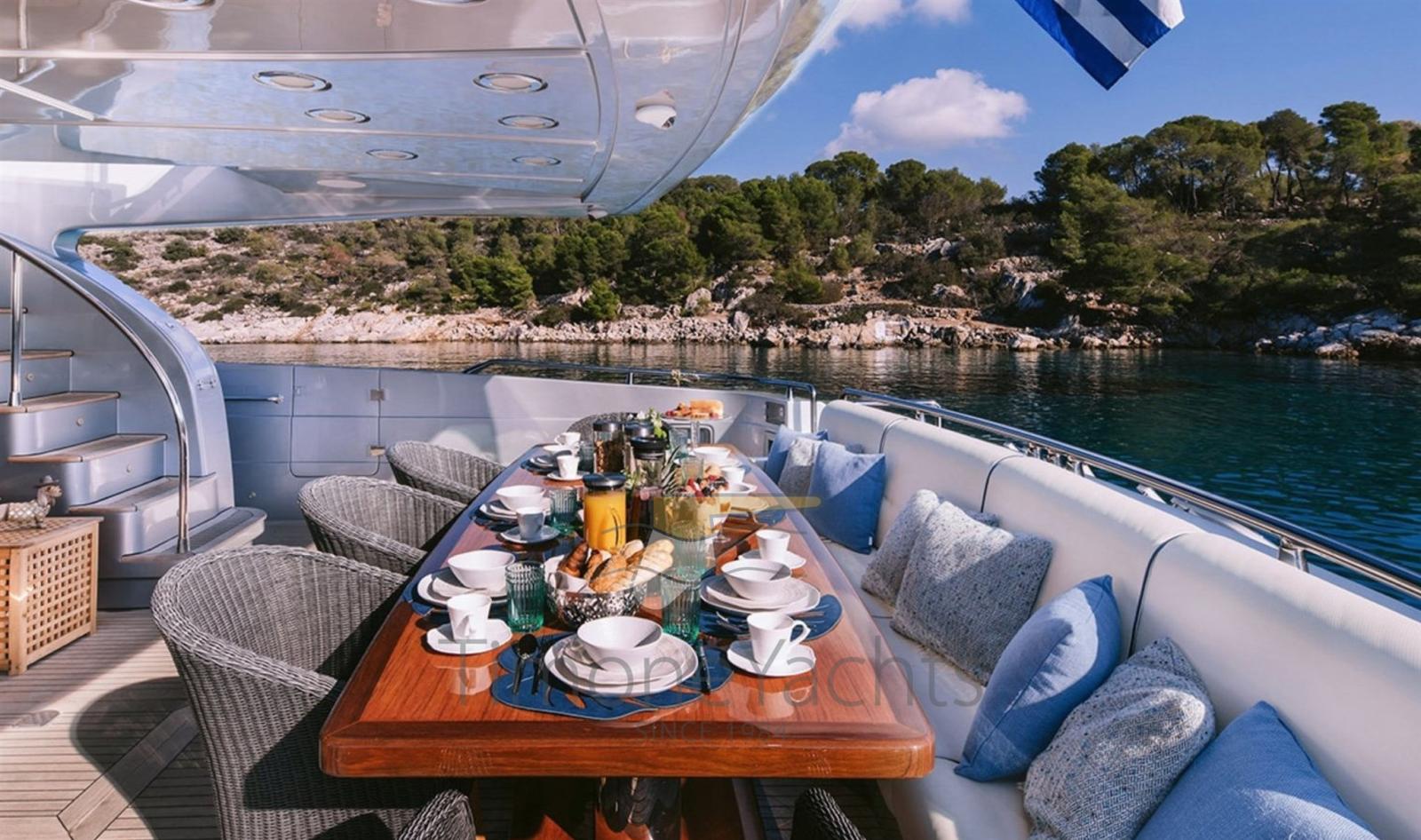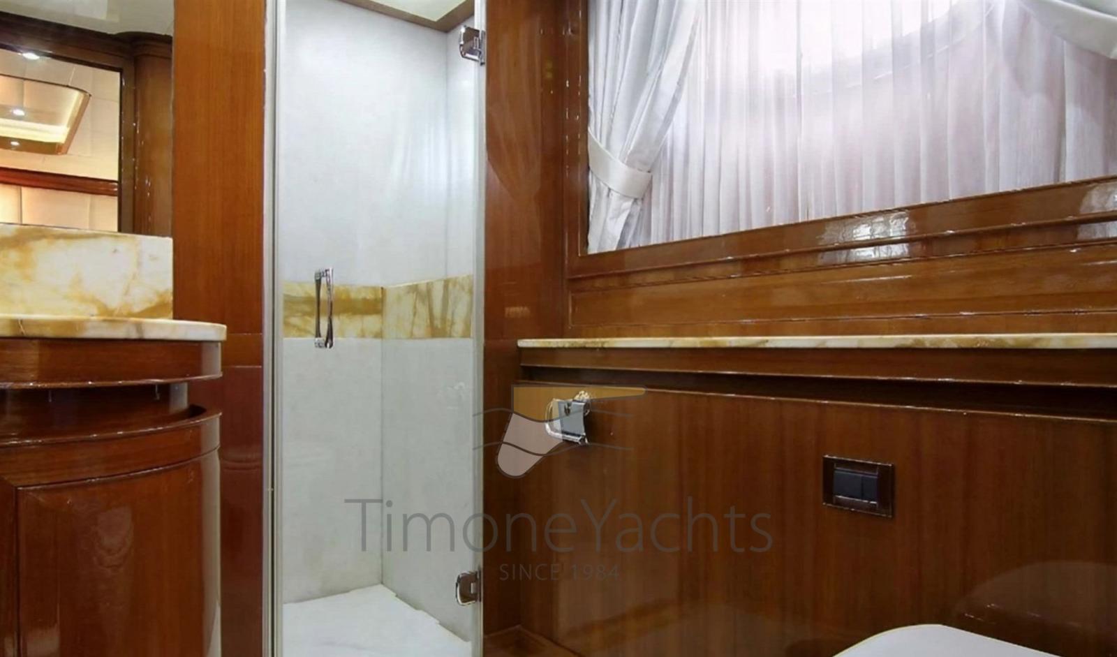 L’organisation de l’espace est l’un des points forts du 95S : l’aménagement comprend jusqu’à 5 cabines invités, dont une grande suite parentale au milieu du navire, assurant un maximum de confort pour 10 personnes. Le salon principal s’ouvre sur une salle à manger séparée, tandis que les grandes fenêtres offrent de la lumière naturelle et une vue magnifique sur la mer. Les espaces extérieurs sont généreux : le flybridge équipé, le cockpit et le bain de soleil avant offrent différents espaces de détente et de convivialité.