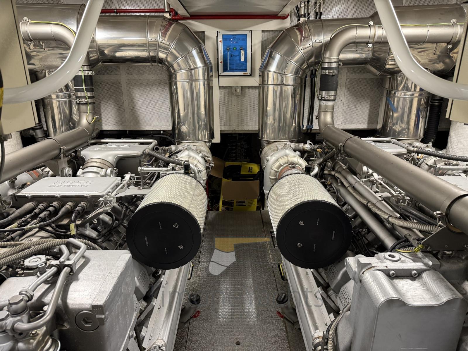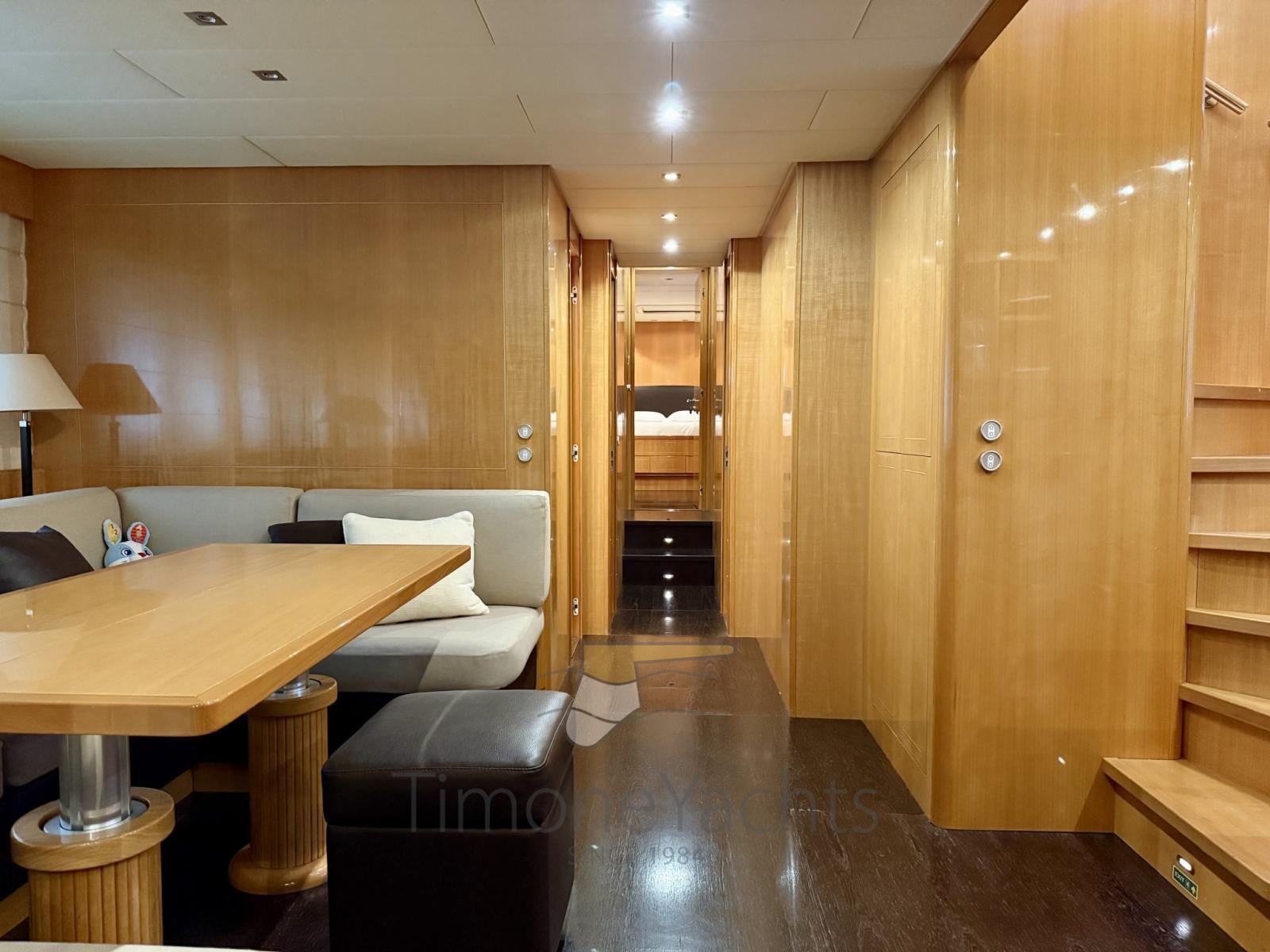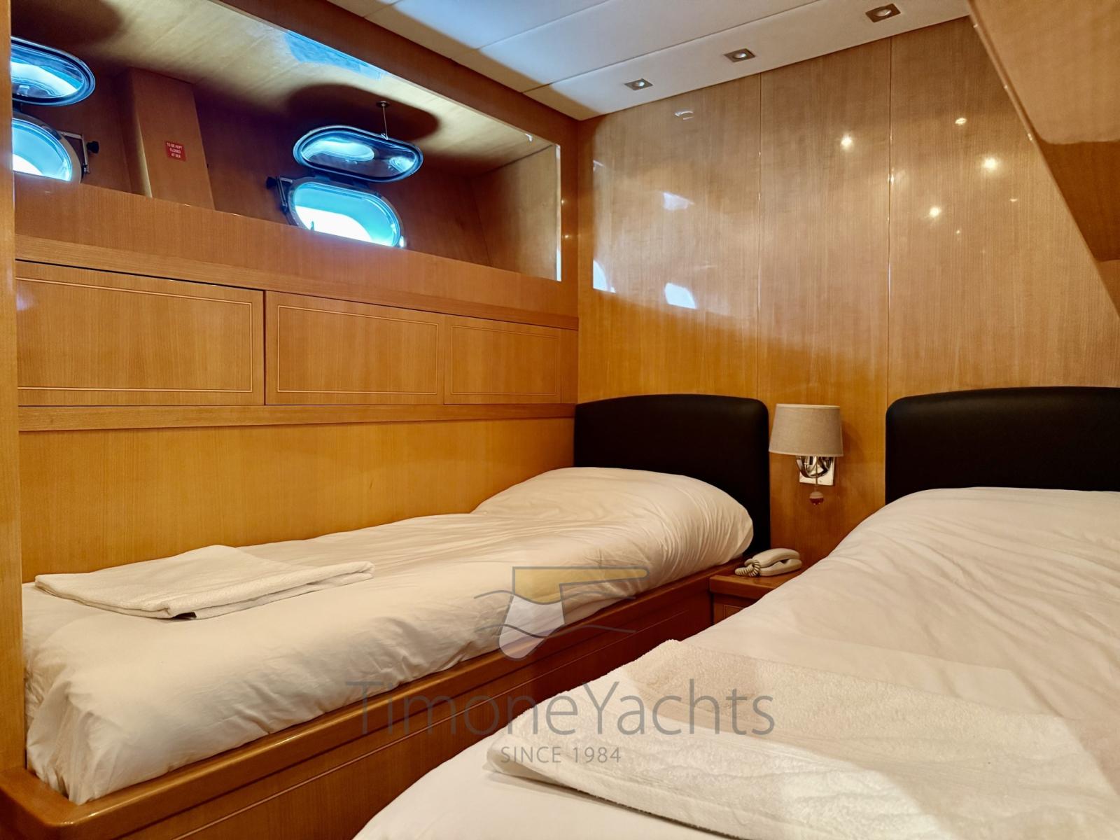 3 grandes cabines invités, cabine principale à l’avant avec lui et la sienne, grand compartiment d’équipage séparé avec cuisine, cabine double avec salle de bains et accès direct à la salle des machines.