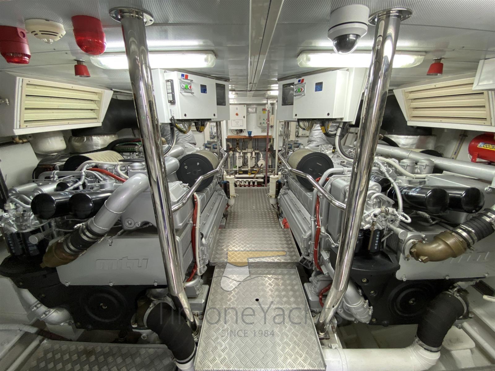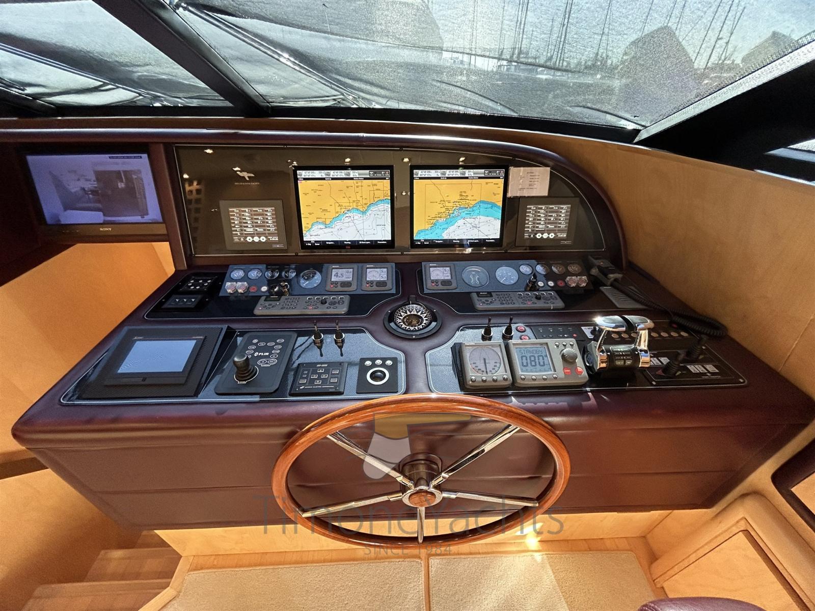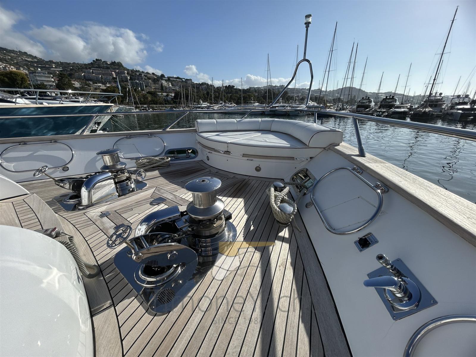 Alarme de pompe de cale, Eau sous pression, Passavant en teck, Douche de cockpit, Propulseur de poupe (Hydraulic), Propulseur d'étrave (Hydraulic), Phare de poursuite, Flaps hydrauliques, Garage à annexe, Bossoirs, Grue de flybridge (nel garage di prua, in the garage up front on main deck), Hard top, Extincteur(s) fixe(s), Indicateurs de flaps, Lavage de chaine, Éclairage de courtoisie, Passerelle, Plateforme arrière, Porte latérale, Cockpit en teck, Prise de quai, Connexion eau sous pression à quai, Onduleur, Guindeau électrique, Echelle de coupée, Echelle de bain, Stabilisateurs, table de cockpit, Annexe, Corne, Winch électrique arrière, Winch électrique avant.