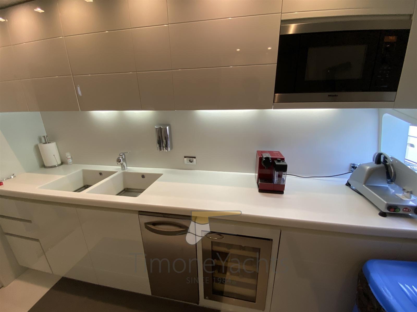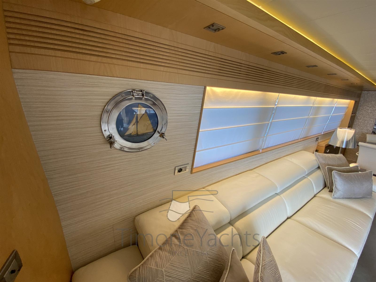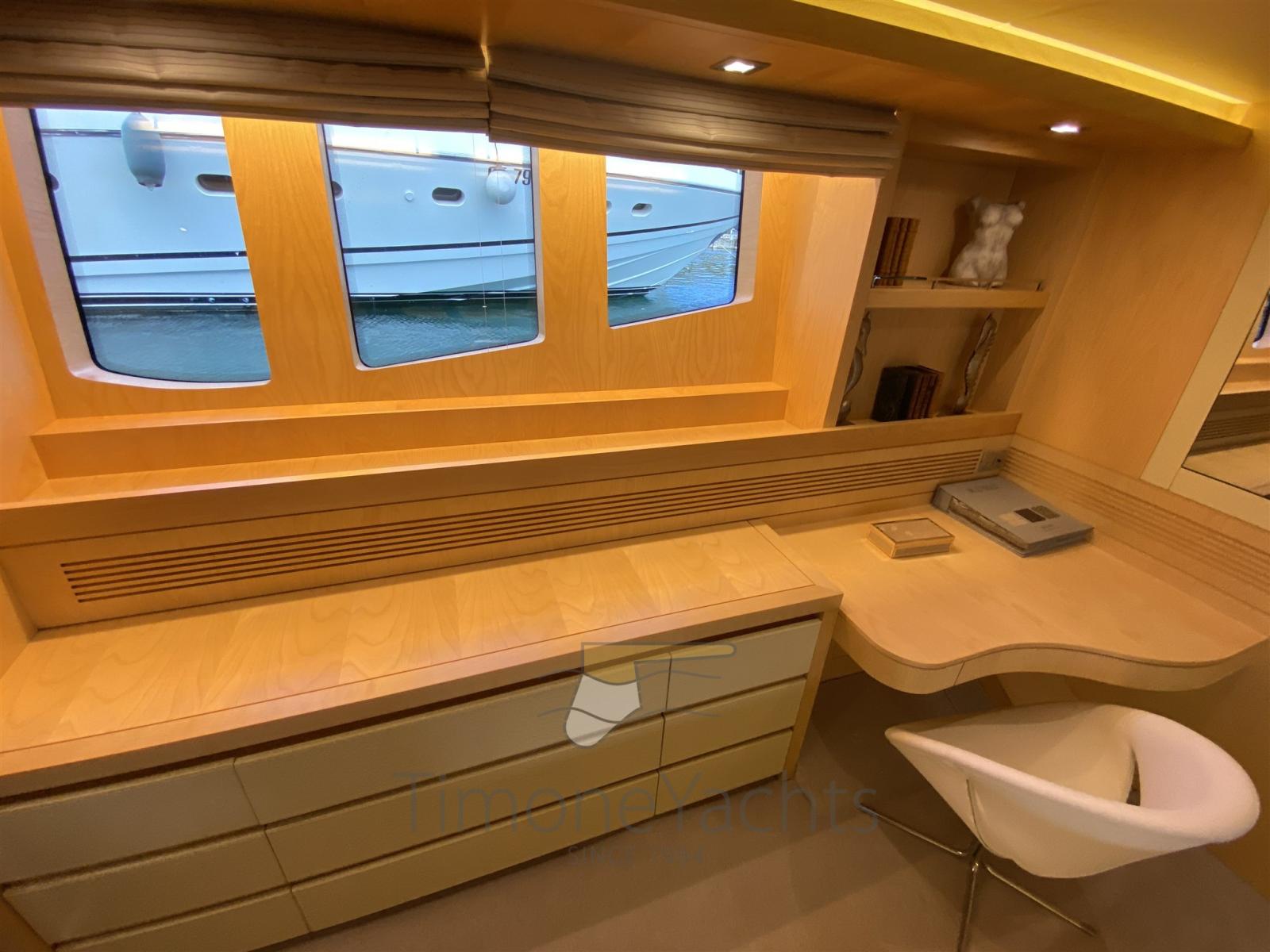 Alarme de pompe de cale, Eau sous pression, Passavant en teck, Douche de cockpit, Propulseur de poupe (Hydraulic), Propulseur d'étrave (Hydraulic), Phare de poursuite, Flaps hydrauliques, Garage à annexe, Bossoirs, Grue de flybridge (nel garage di prua, in the garage up front on main deck), Hard top, Extincteur(s) fixe(s), Indicateurs de flaps, Lavage de chaine, Éclairage de courtoisie, Passerelle, Plateforme arrière, Porte latérale, Cockpit en teck, Prise de quai, Connexion eau sous pression à quai, Onduleur, Guindeau électrique, Echelle de coupée, Echelle de bain, Stabilisateurs, table de cockpit, Annexe, Corne, Winch électrique arrière, Winch électrique avant.