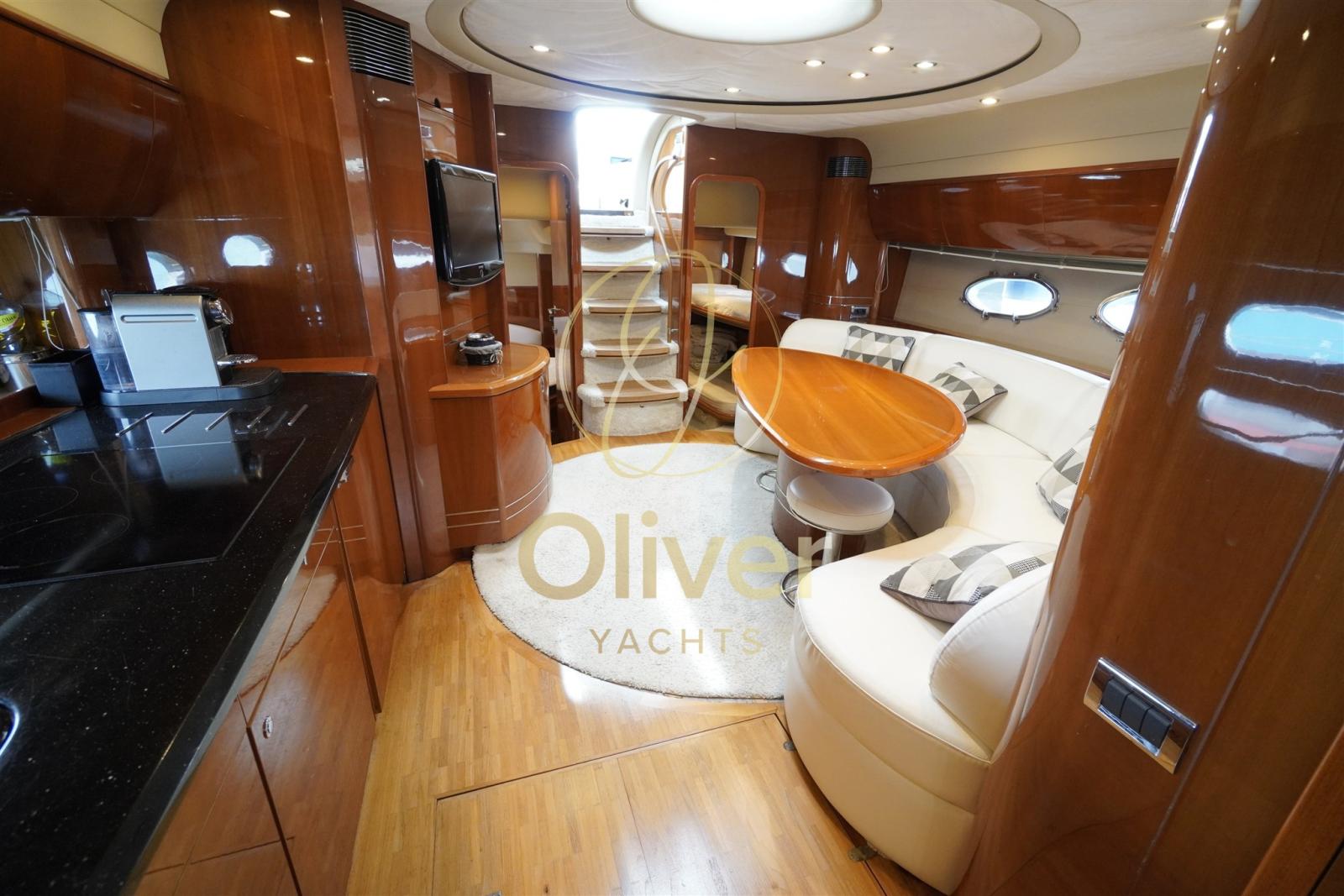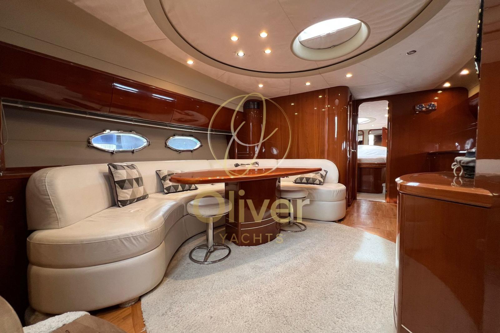 Le cockpit est l’un des points forts : grand pont soleil au-dessus du garage du tender, dinette en forme de L avec table pour 6/8 personnes, bar humide équipé et poste de pilotage sportif sous le toit rigide. Des espaces extérieurs bien répartis, qui peuvent vraiment être exploités aussi bien à l’ancre qu’en mer. À la proue se trouve un grand pont ouvrier en retrait.