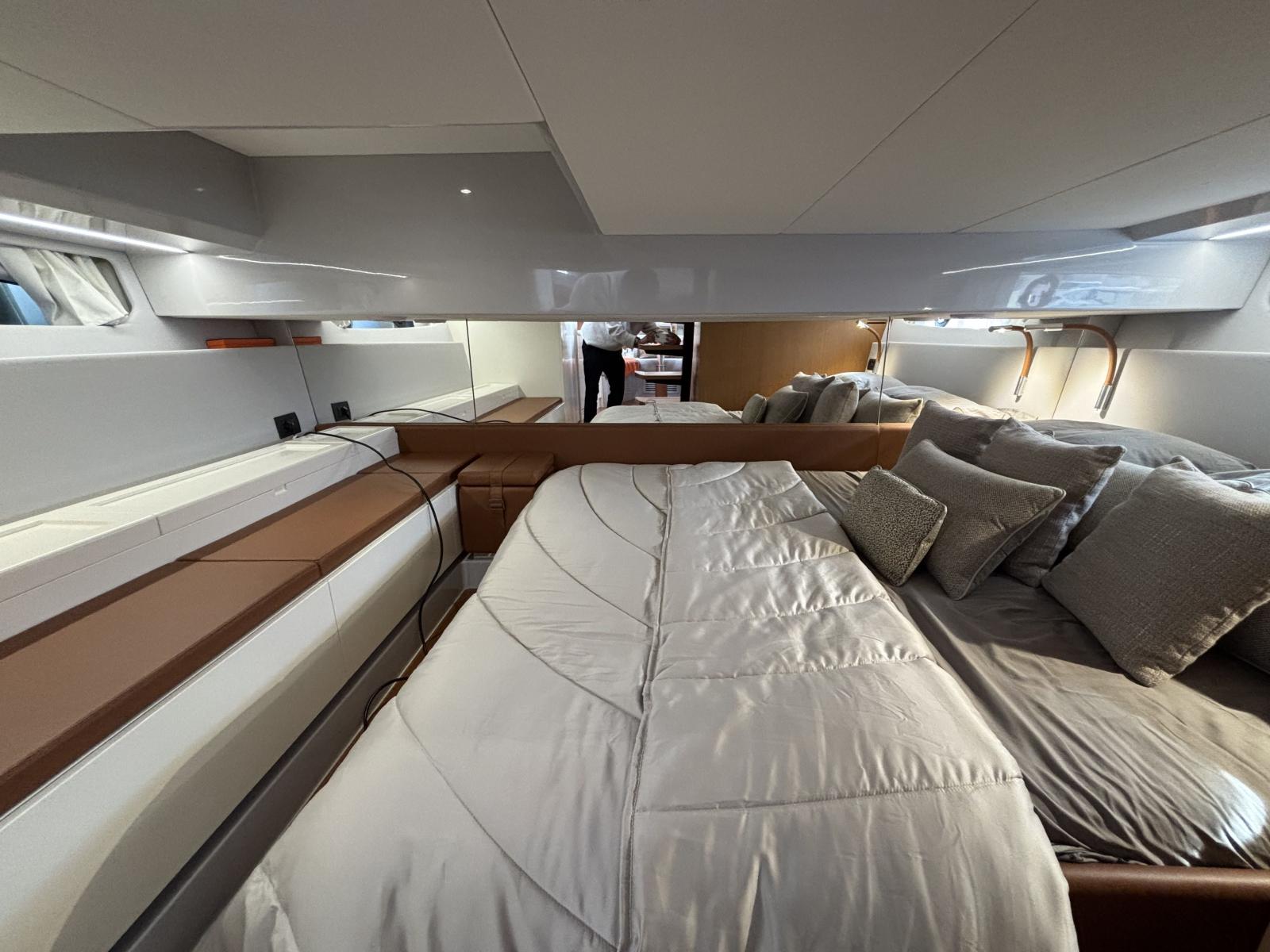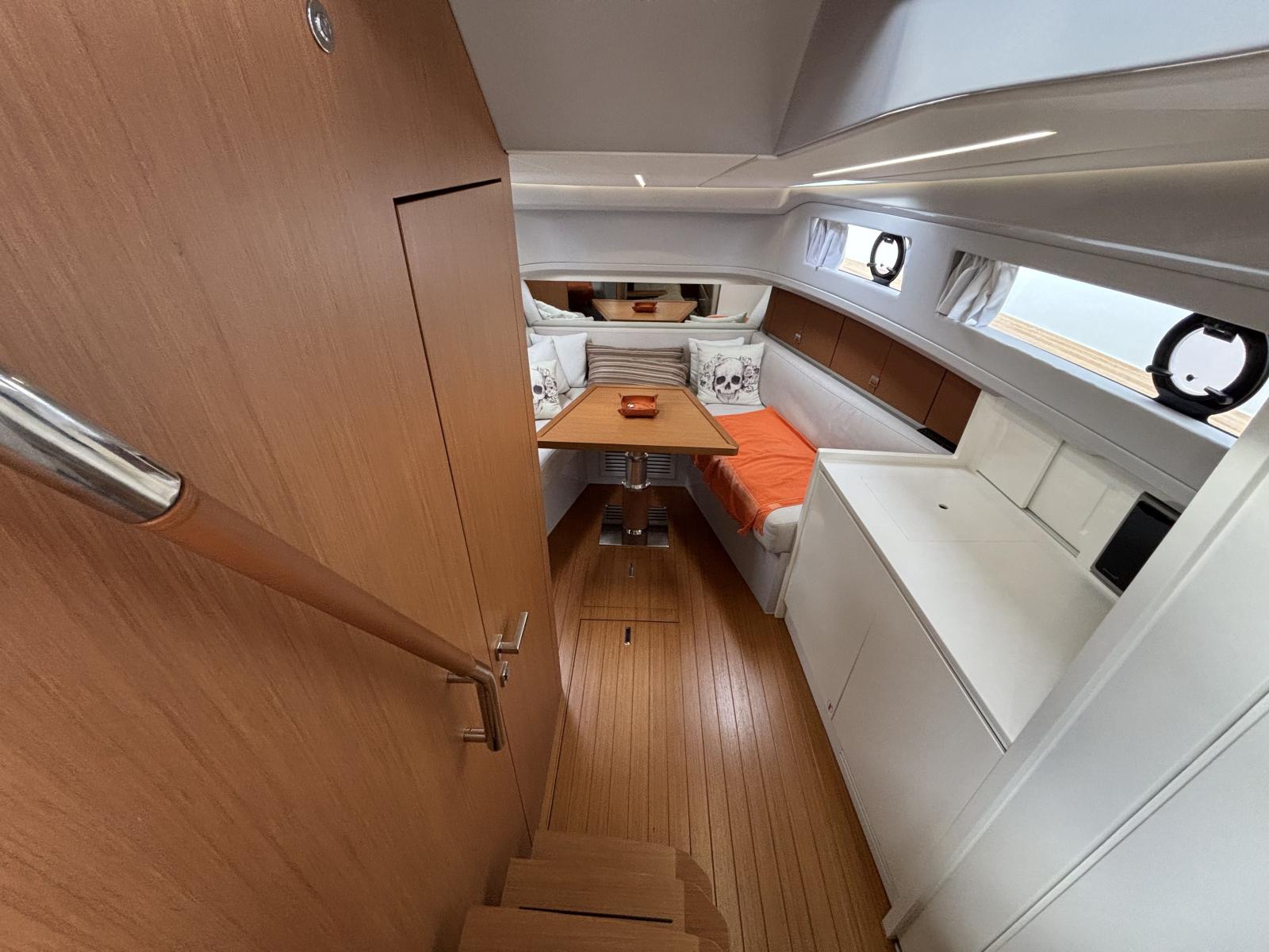 CAP MED a le plaisir de vous proposer ce superbe Bluegame BG42 de 2021, unité premium du chantier italien Bluegame (groupe Sanlorenzo), dessinée par Zuccon International Project. Véritable référence du segment open haut de gamme, le BG42 se distingue par son concept walkaround à circulation 360°, son cockpit protégé et ses volumes extérieurs exceptionnels, offrant un confort remarquable en Méditerranée comme en croisière côtière (CE Catégorie B). Propulsé par 2 x Volvo Penta D6 IPS 650 développant 480 CV chacun et totalisant seulement 130 heures, ce modèle combine puissance, rendement et stabilité. La transmission IPS associée au joystick Volvo assure des manœuvres d’une précision remarquable, complétée par un propulseur d’étrave Side Power 75 pour une maîtrise totale au port. Le système Interceptor optimise automatiquement l’assiette et améliore le confort dynamique en navigation, tandis que les moteurs bénéficient d’un suivi rigoureux avec révision tous les ans et mise à jour récente. L’autonomie énergétique constitue un véritable atout avec un groupe électrogène 7 kW permettant une alimentation 220V indépendante au mouillage comme en navigation, faisant fonctionner climatisation, froid et équipements sans dépendre du quai, Climatisation BTU 16000. L’installation est renforcée par 2 panneaux solaires de 220W (2024), un régulateur Victron SmartSolar Bluetooth, un shunt Victron Bluetooth et un chargeur Victron Skylla 24V 80A trois sorties (2025) garantissant une gestion et une recharge optimales du parc batteries. Un dessalinisateur Idromar 130L/h (2025) assure une autonomie totale en eau douce pour les longues escales. Le nouveau boîtier Dometic (2025) gère automatiquement l’alimentation des trois réfrigérateurs en 220V ou 24V selon la source disponible, complété par un congélateur extérieur inox Frigonautica (2024). Le pont est entièrement optimisé pour la vie en extérieur avec passerelle hydraulique et plateforme arrière immergeable commandées par tableaux inox Opacmare (2025), fermeture complète du cockpit par bâches Crystal transparentes (2024) et toiles d’ombrage latérales, chauffage extérieur Webasto 5 kW pour un confort toutes saisons, télécommande sans fil Lewmar pour compteur de chaîne facilitant les manœuvres de mouillage, ainsi que winchs électriques à l’avant et à l’arrière pour des opérations d’amarrage précises et sans effort. L’intérieur, repensé par Studio Souchon — cabinet de design collaborant également avec Sanlorenzo — offre une atmosphère raffinée avec finitions soignées, table de carré amovible électrique, éclairage adaptatif, cabine optimisée pour réduire la sensation de roulis grâce à son orientation, et détails en alcantara apportant une touche yacht de luxe. Unité parfaitement entretenue, prête à naviguer, configurée pour la grande croisière avec autonomie renforcée et niveau d’équipement rarement proposé sur le marché.