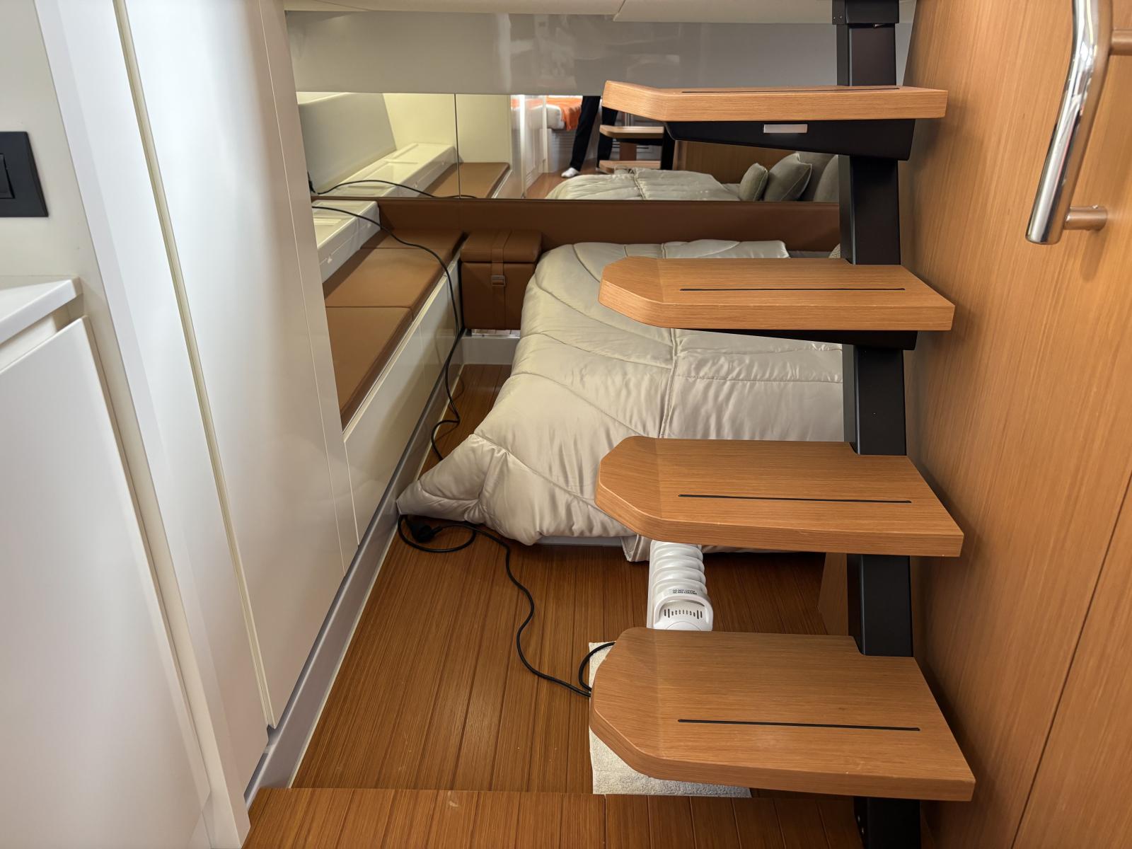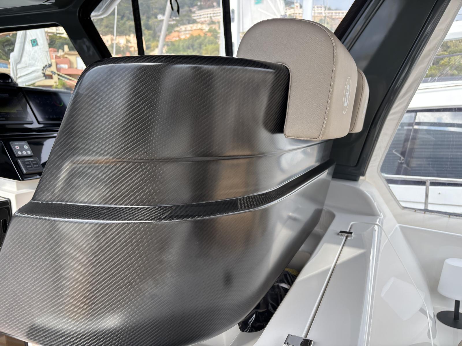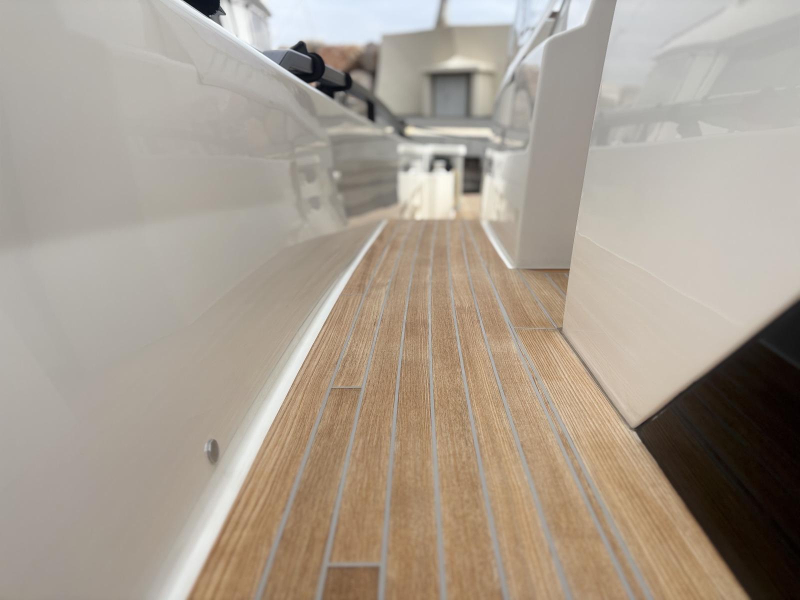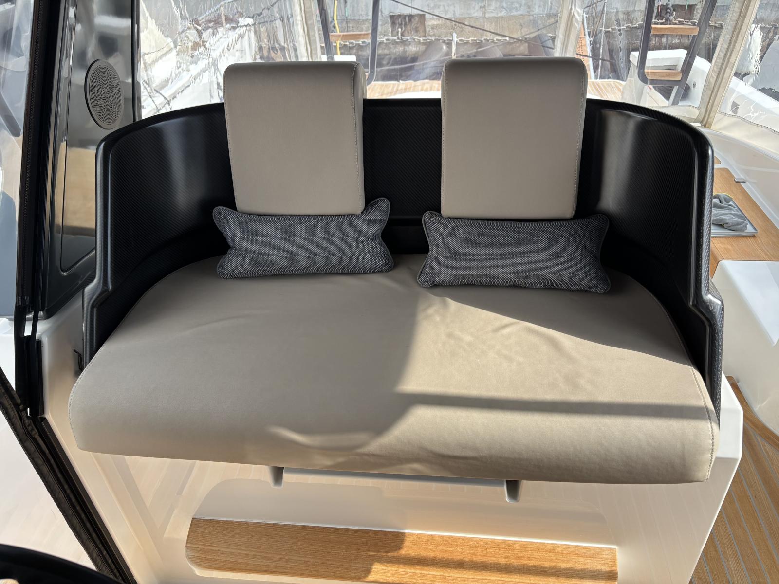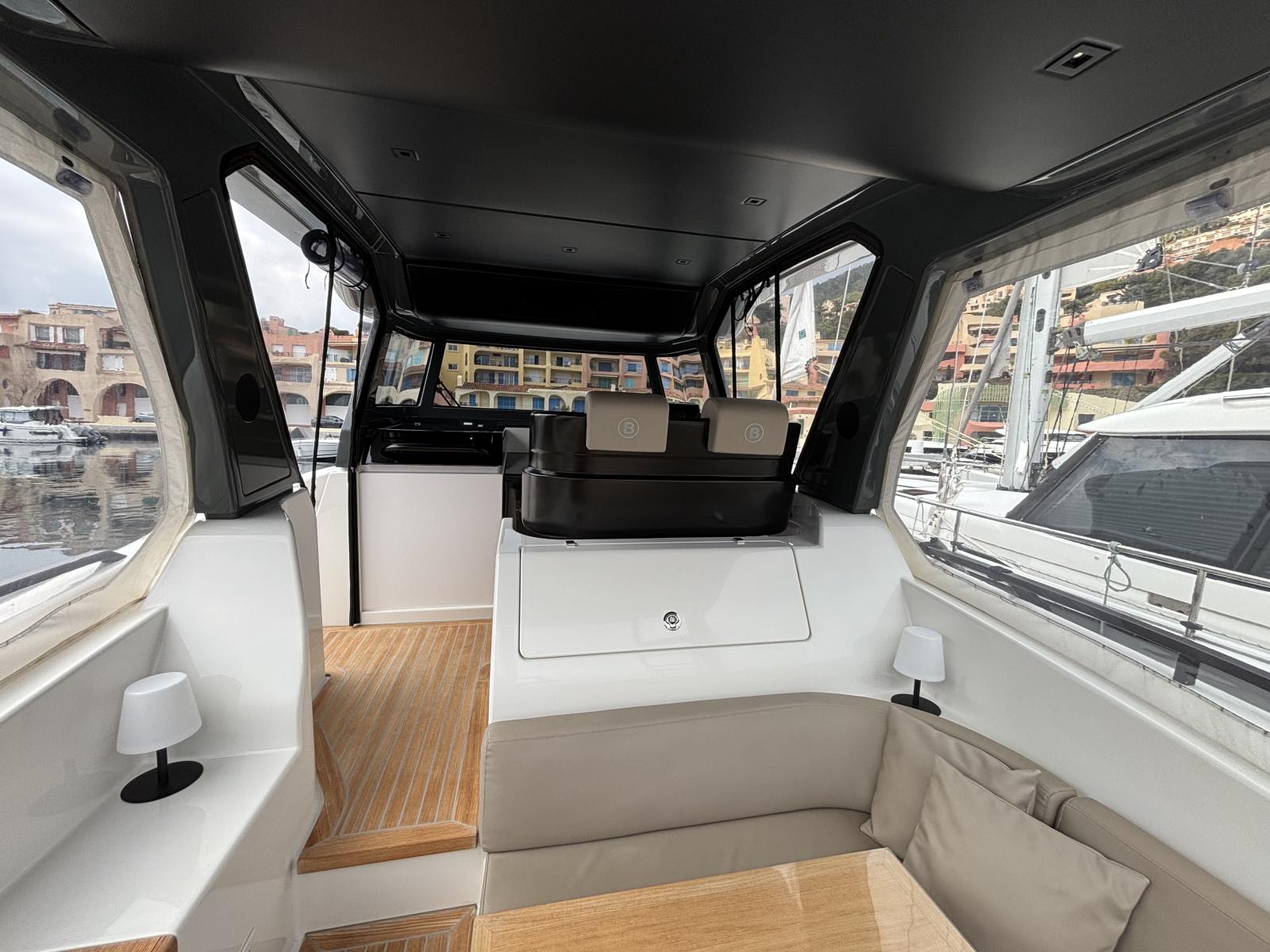 Pont premium orienté autonomie et facilité d’usage : passerelle hydraulique et plateforme hydraulique pilotées via tableaux de commande inox Opacmare (2025), offrant précision, fiabilité et ergonomie. Bâches Crystal de fermeture du carré extérieur (2024) + toiles d’ombrage latérales (2024) pour protection complète. Bimini avec toiles d’ombrage montées sur pôles carbone couvrant les zones avant et arrière
