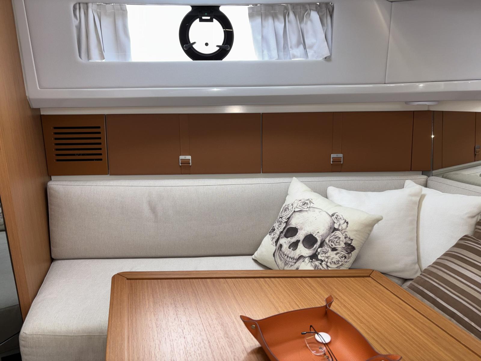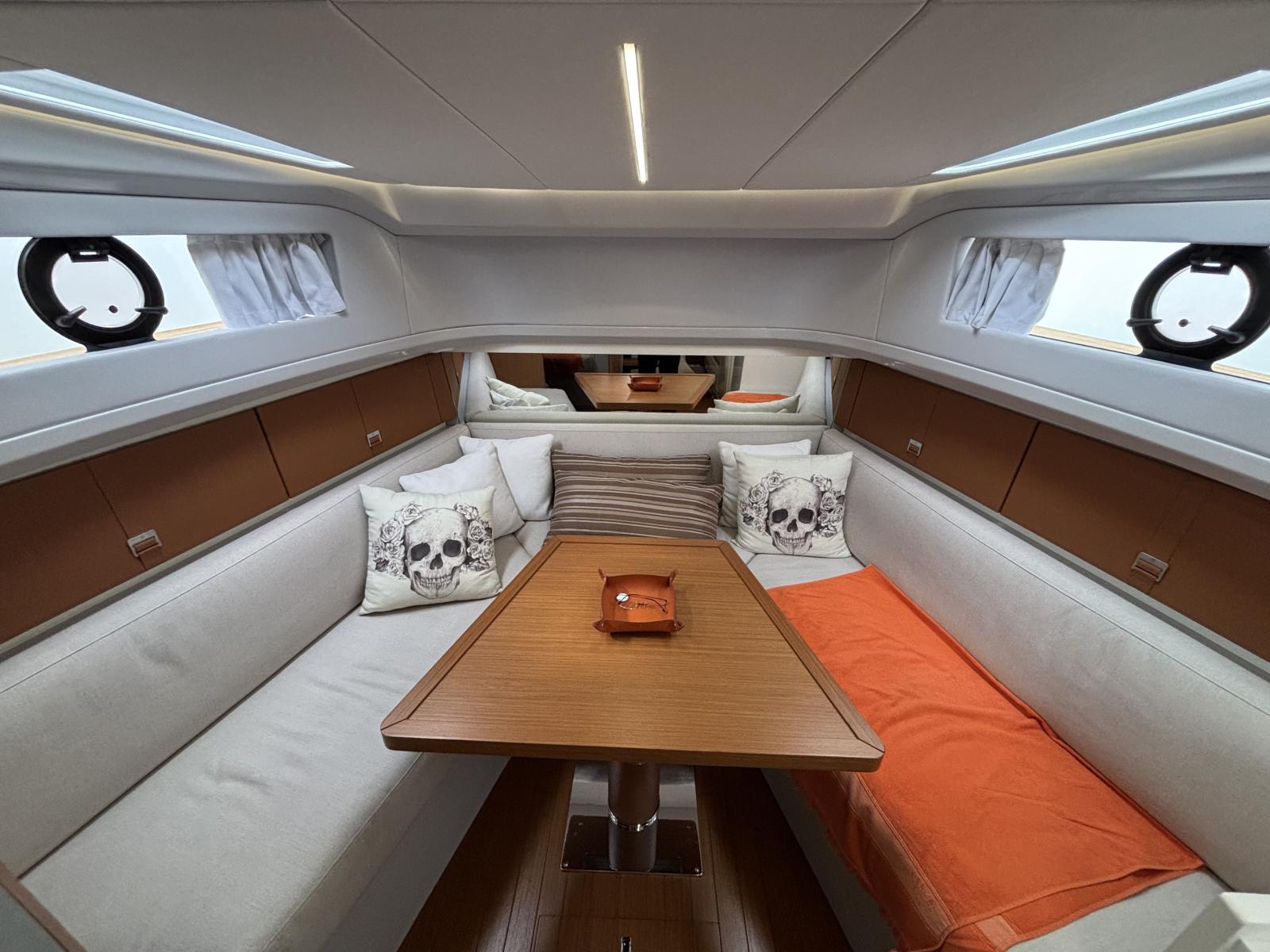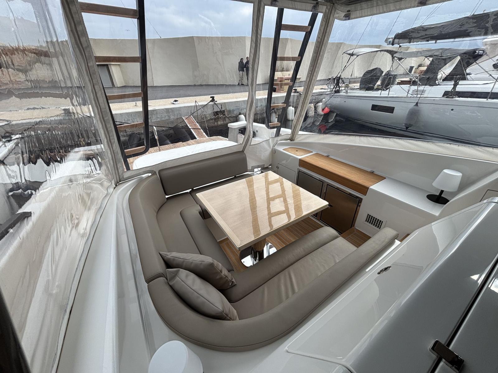 Cockpit et carré extérieur pensés pour vivre dehors : fermeture complète du carré par bâches vitres Crystal avec grandes fenêtres (2024) et toiles d’ombrage latérales (2024) pour un confort maximal au mouillage comme en navigation.