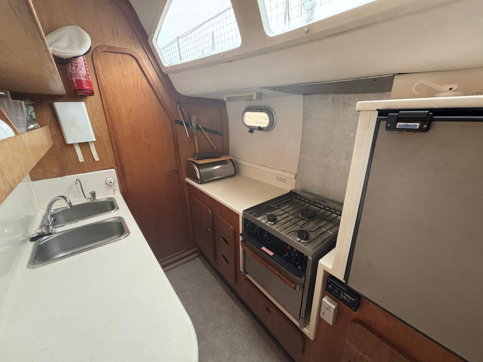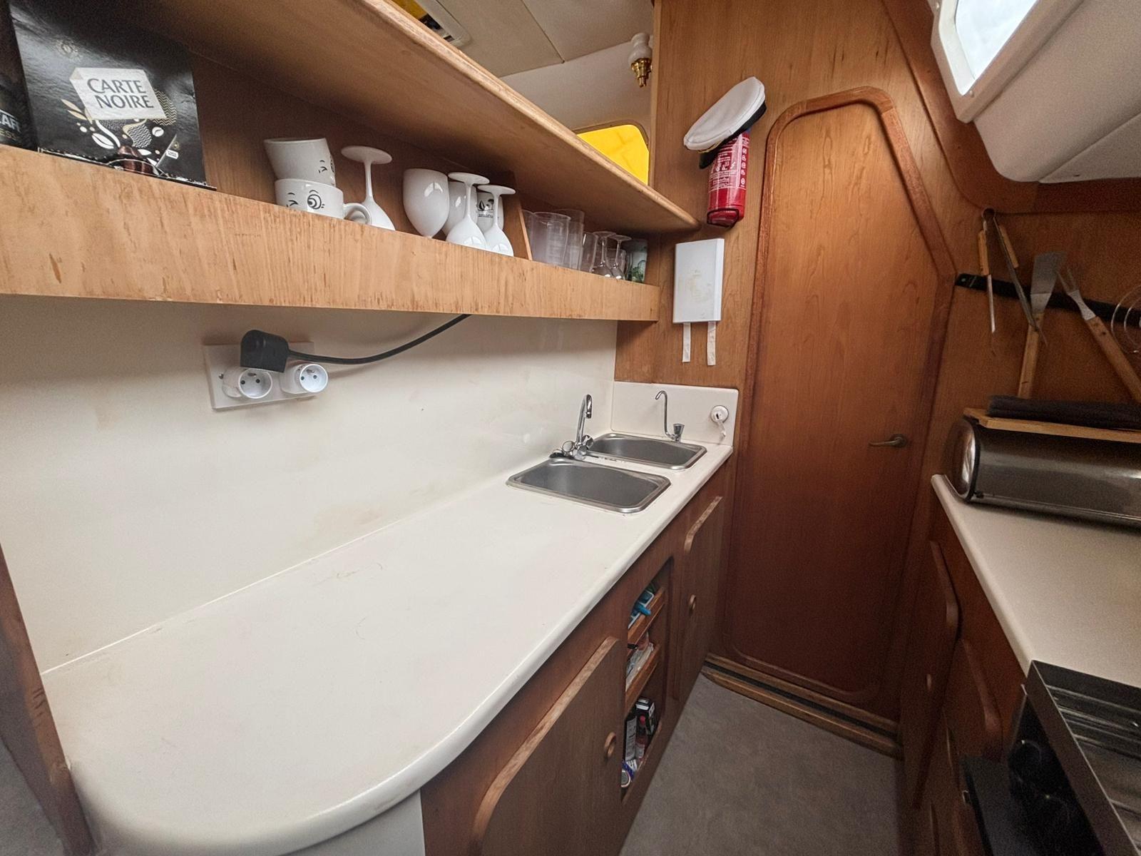 Équipement électronique complet (GPS, pilote automatique, VHF, sondeur…), convertisseur 12/220 V, panneaux solaires assurant une bonne autonomie énergétique, cuisine équipée avec réchaud, four, évier et réfrigérateur.