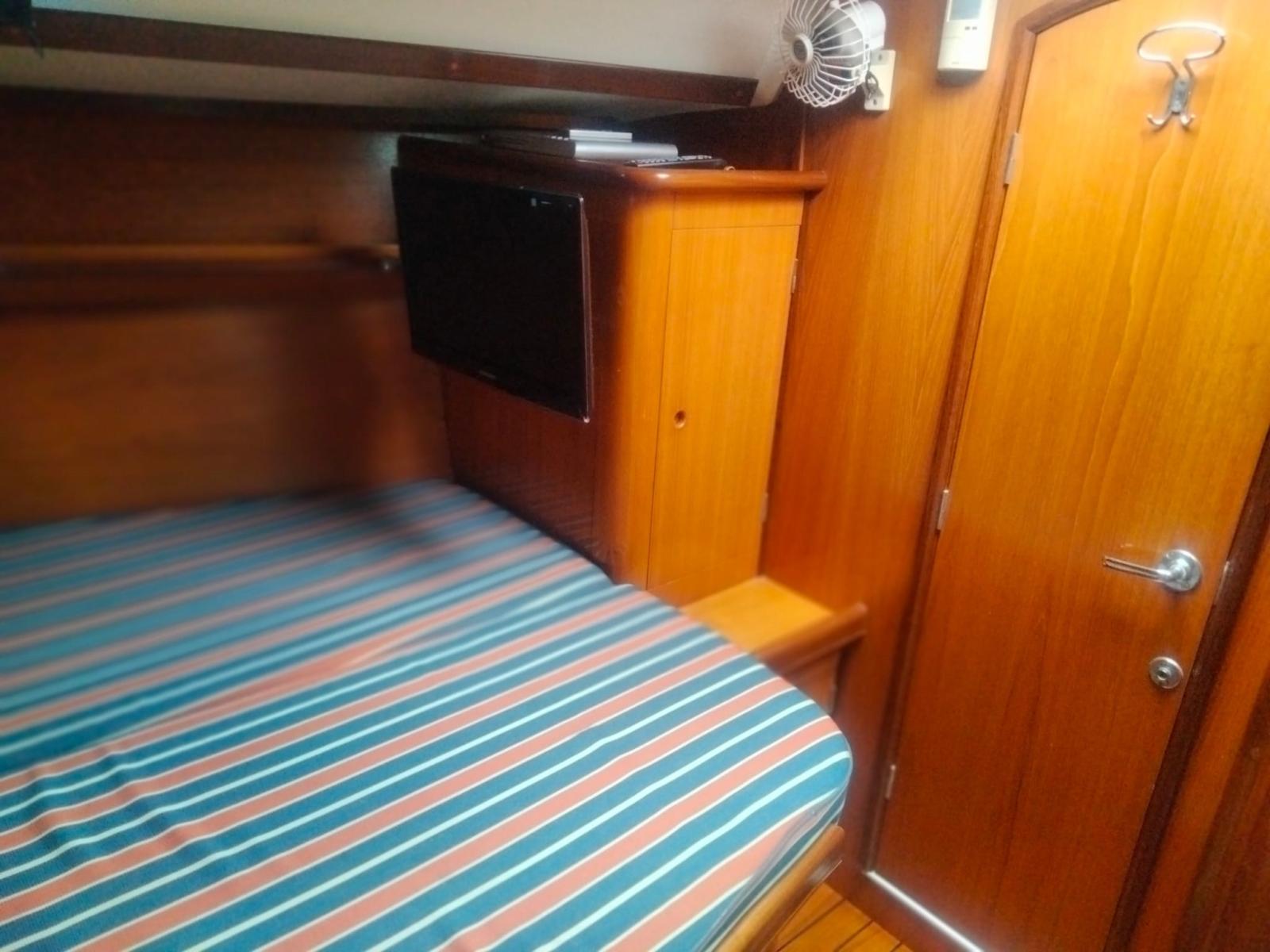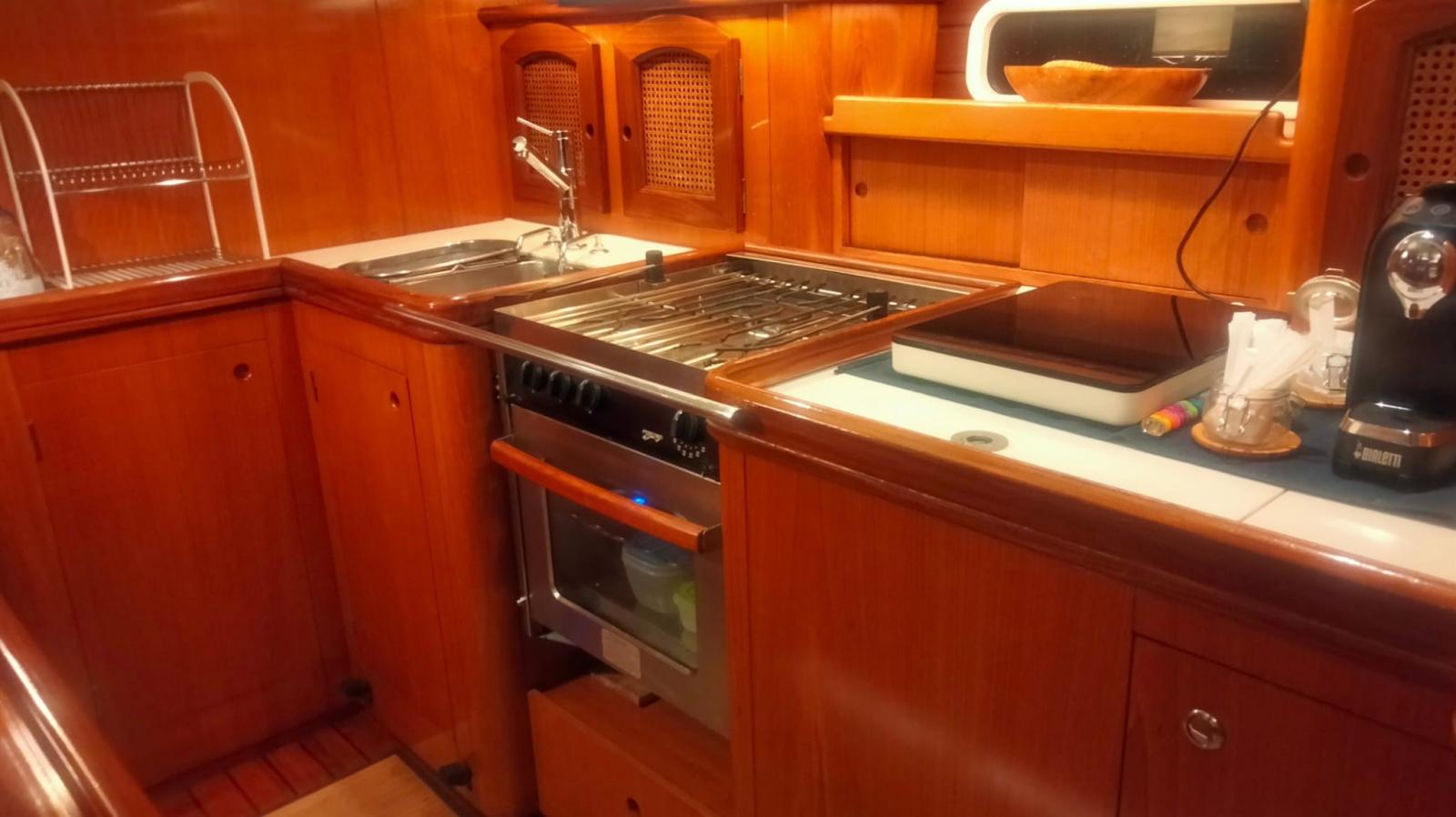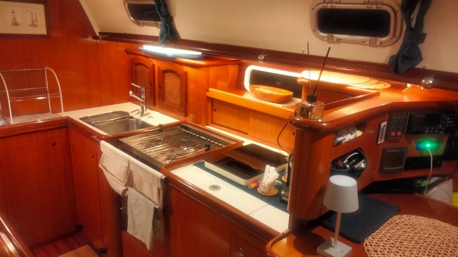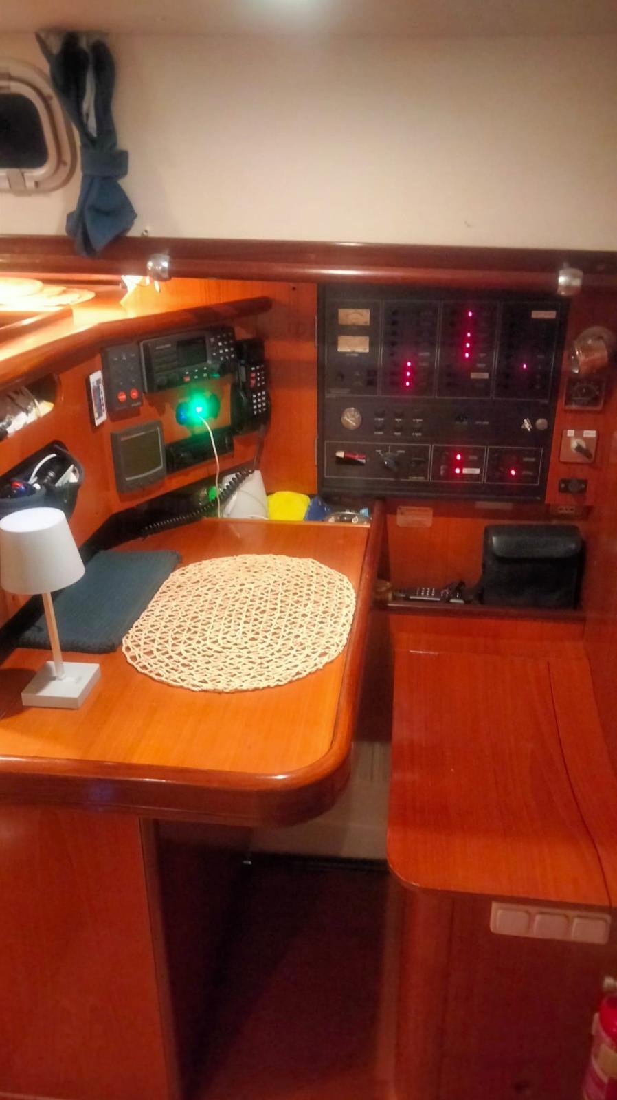 Alarme moteur, Ancre (con 70m di catena sostituita 2020), Eau sous pression, 7 Batteries (sostituite 2020), Passavant en teck (da rivedere), Couleur spéciale (scafo blu), Douche de cockpit, Double barre à roue, Propulseur d'étrave (Max Power), Éclairage de courtoisie, Pompe de cale manuelle, Porte latérale, Cockpit en teck (in buone condizioni), Prise de quai, Connexion eau sous pression à quai, Onduleur, Guindeau électrique, Gréement monotoron (sostituito nel 2010), Echelle de bain, Chaise support HB, table de cockpit, 2 Winch (da 44), 4 Winch électrique (2 da 66 e 2 da 44).