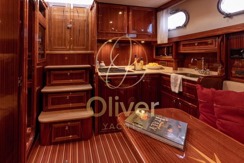 Les intérieurs du Sorrento 36' Hard Top conservent le style artisanal typique du chantier naval, avec des bois chauds, un parquet en bois et des finitions soignées