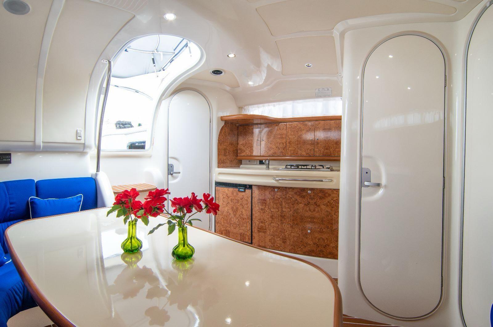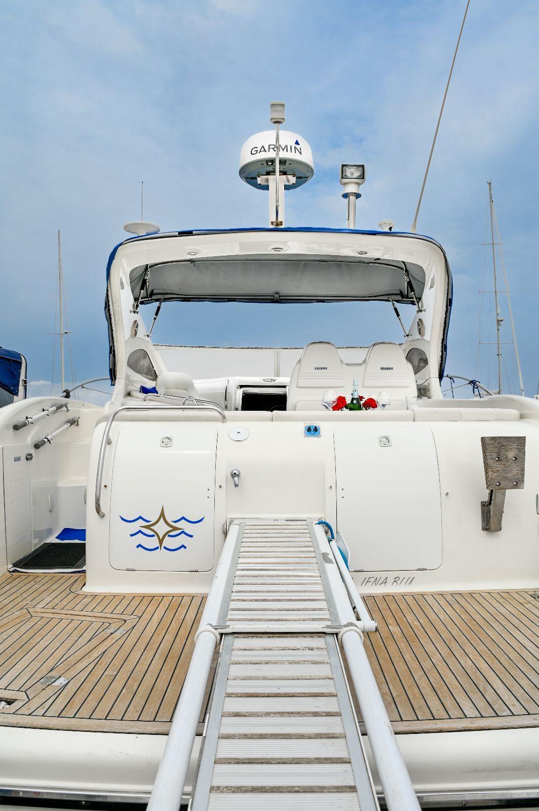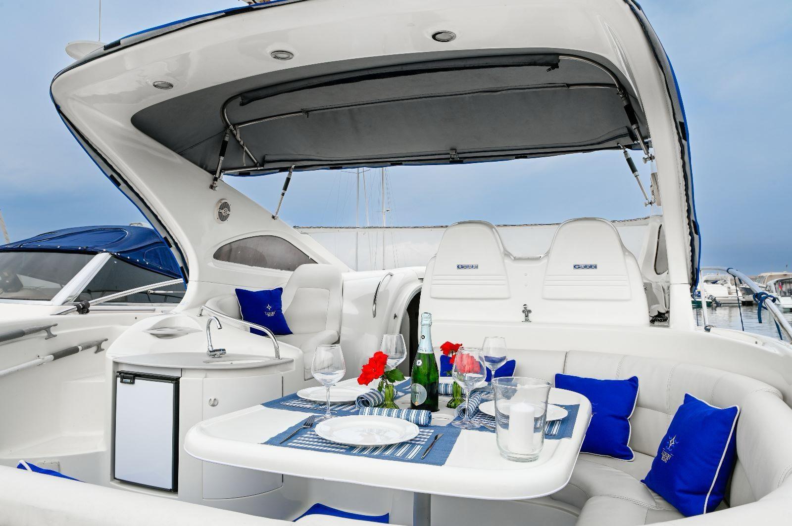 2 Alarme moteur, Alarme de pompe de cale, Alternateur, Eau sous pression, Douche de cockpit, Flaps hydrauliques, Extincteur(s) fixe(s), Indicateurs de flaps, Lavabo dans le cockpit, Éclairage de courtoisie, Passerelle, Plateforme arrière (elettro idraulica), Porte latérale, Prise de quai, Rollbar, Guindeau électrique, Echelle de bain, table de cockpit, Table pliante de salon, Corne.