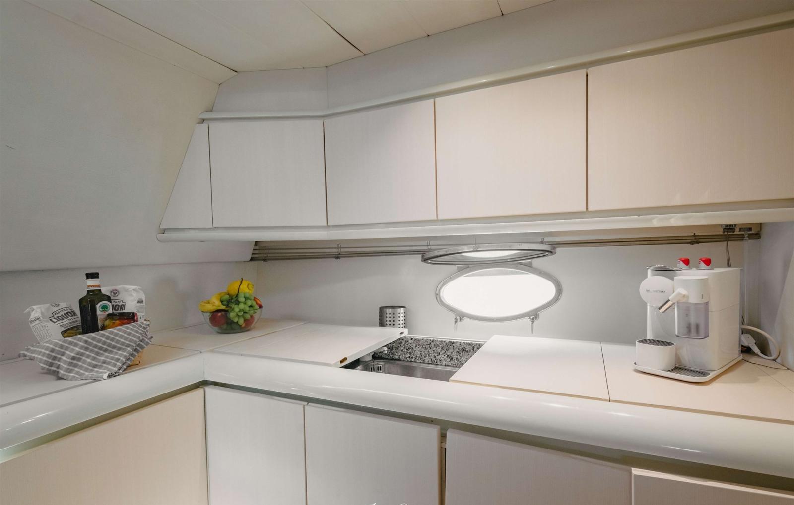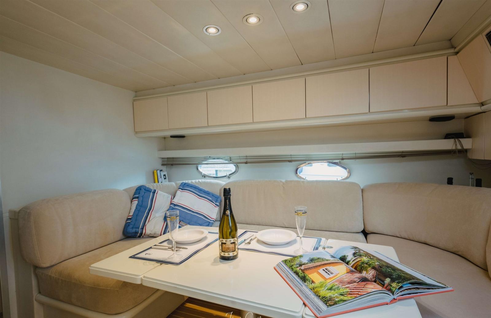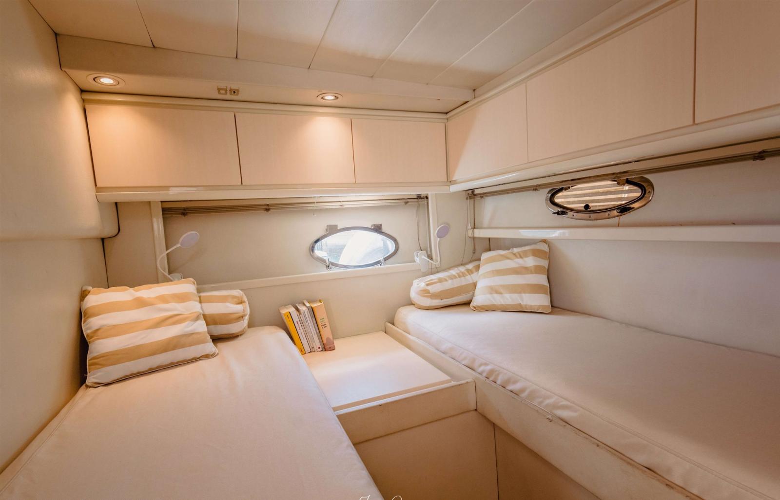 COQUE : entièrement repeint en blanc/gris COQUE : totalement révisé, l’ancien antifouling retiré, le contrôle d’osmose négative a été effectué, 3 couches de gelshid (apprêt) appliquées et 2 couches d’antifouling appliquées. FASCIAMI : Les différents gouverneurs ont été contrôlés. CALES : de toutes les cales, tout en arrière, salle des machines, partie centrale et proue. OPERA VIVA : polissage de toutes parties en PRV et aluminium, remplacement en 2021 du hublot au-dessus de la chambre du propriétaire et de la moitié du plafond intérieur. NETTOYAGE : Nettoyage intérieur, nettoyage des coussins, canapés, matelas et teinture à l’huile pour le teck et disposition des profils en teck HÉLICES ET ESSIEUX : Révisés et vérifiés pour une rotation parfaite. Transmission sur axe. GOUVERNAILS : Volet révisé : Pistons révisés PROPULSEUR BOW : CT125 Puissance maximale 115 kg de poussée installée, pour les bateaux de 13 à 26 mètres, cela permet d’avoir plus de puissance en cas de vents très forts. PIÈCES ÉLECTRIQUES : Un contrôle global de toutes les pièces électriques a été effectué, des feux de navigation aux instruments connectés au moteur tels que la température de l’eau, le carburant, l’huile, le tachhouset. 2 nouveaux compteurs d’heures ont été installés, le système d’éclairage LED a été modifié.