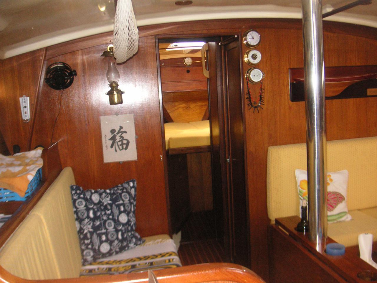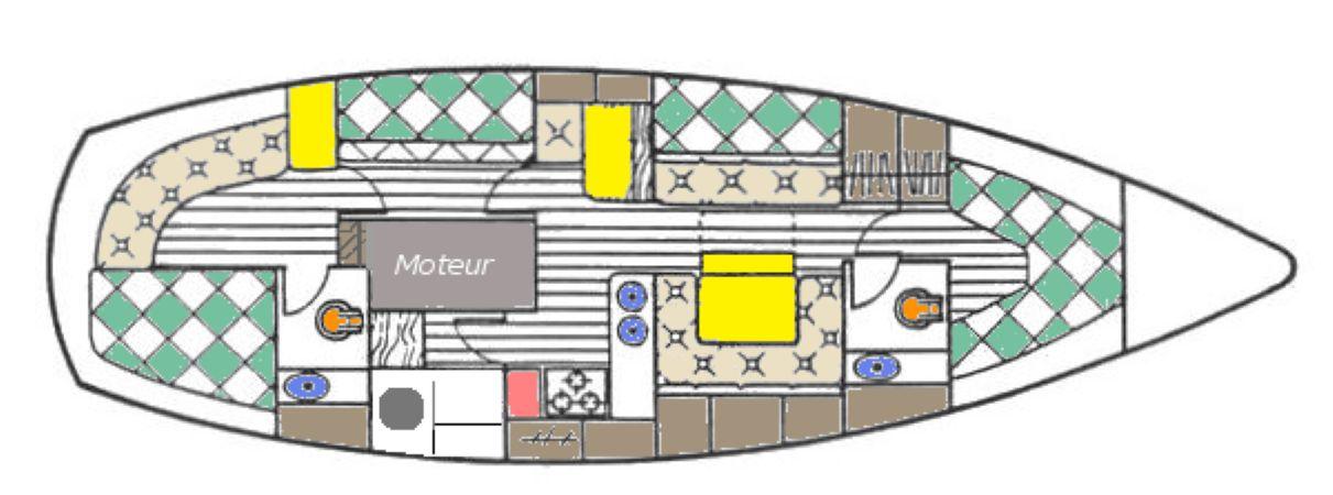 Carré avec table et banquette en U à tribord (couchage pour deux personnes) et bâbord