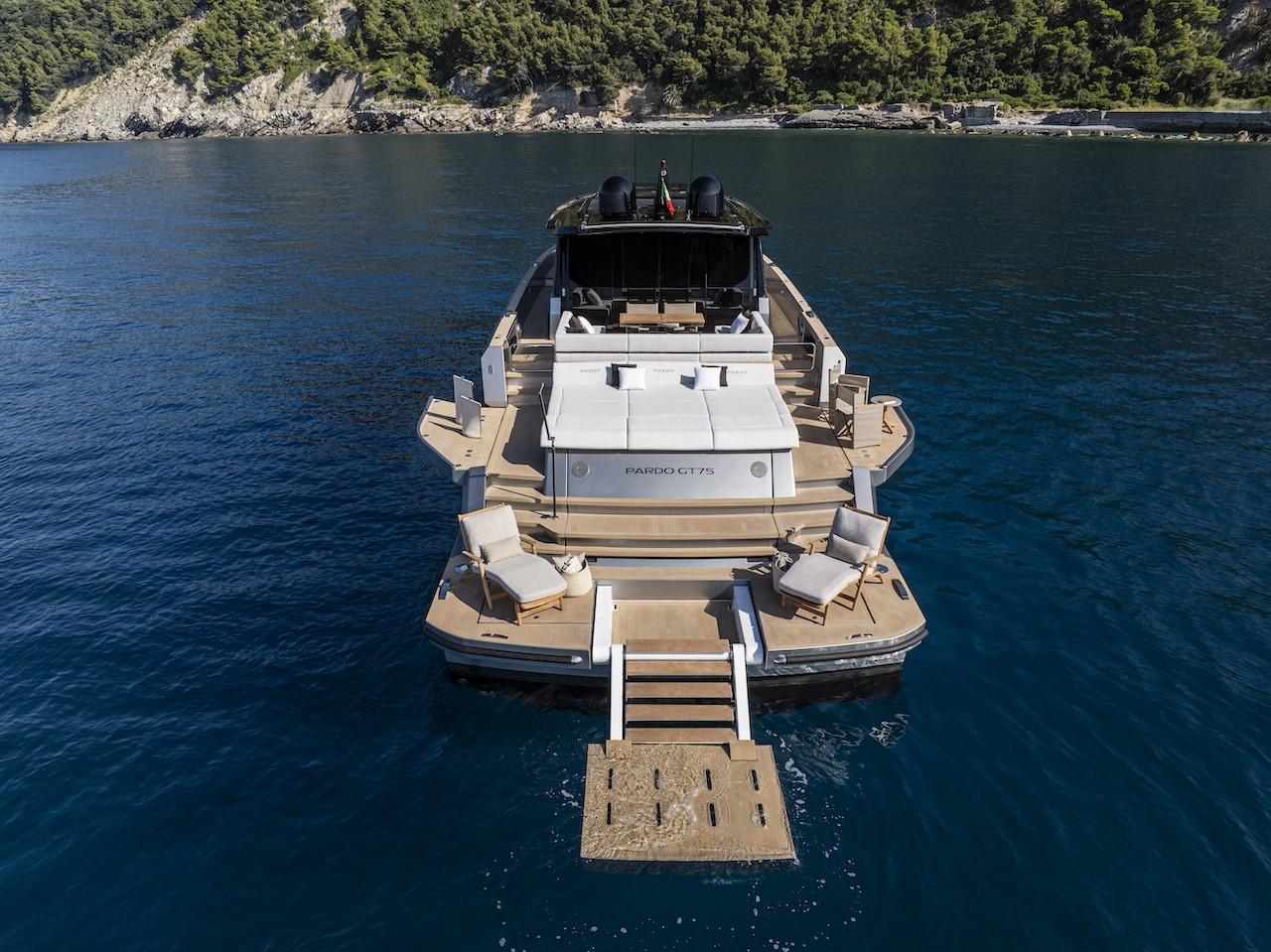 Dans le Pardo GT75 Tender Garage, l'aménagement du cockpit est conçu pour accueillir un très grand bain de soleil, à l'arrière de la banquette en forme de C : cette partie se soulève électriquement en cas de besoin, révélant un garage dédié à l'annexe. Cette solution reflète parfaitement l'approche typique du monde des superyachts, où le logement de l'annexe à bord est une caractéristique indispensable.