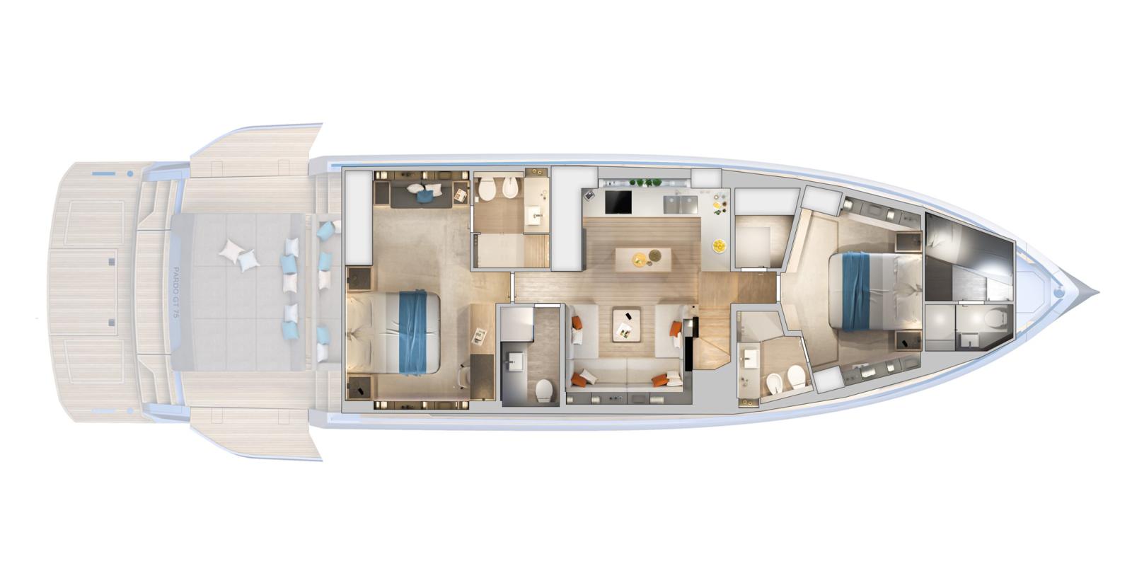 Dans la version Beach du Pardo GT75, toute la partie arrière peut être transformée en une terrasse étendue donnant sur la mer. Ceci est rendu possible par des ailes latérales à commande hydraulique qui permettent de façonner toute la zone selon les souhaits du propriétaire. Depuis cet espace extérieur ouvert, il est possible d'accéder directement à la cabine principale grâce à des vitres coulissantes électriques. Il s'agit d'une suite dédiée au propriétaire, meublée et conçue avec une extrême attention aux détails, avec des vues privilégiées vers des panoramas inestimables et des réveils à couper le souffle.