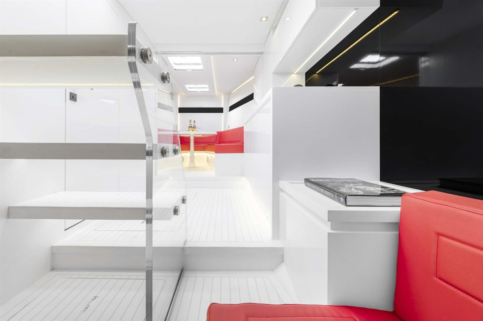 Alarme gaz, Alarme moteur, Alternateur, Ouverture du compartiment moteur électrique, Auto Dynamic Trim Interceptor, Eau sous pression, Trim hydraulique, Câble d’alimentation à quai, Couleur spéciale, Douche de cockpit, Fixation de l’ancre (Ketting), Extincteur(s) fixe(s), Indicateurs de flaps, Lavabo dans le cockpit, Éclairage de courtoisie, Spots sous-marins, Moniteur de batterie, Défenses, Passerelle, Plateforme arrière, Pompe de cale automatique, Pompe de Lavage du Pont, Pont en teck, Porte latérale, Cockpit en teck, Prise de quai, Guindeau électrique, Echelle de bain, table de cockpit.