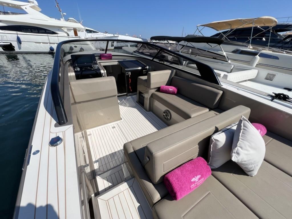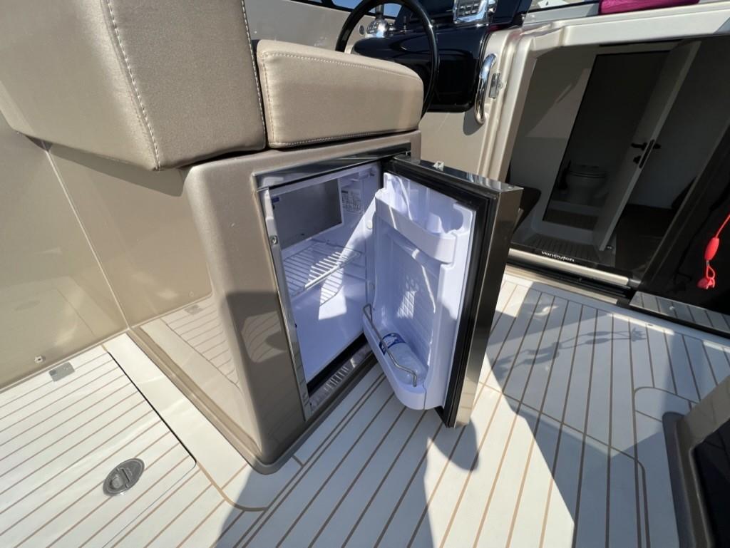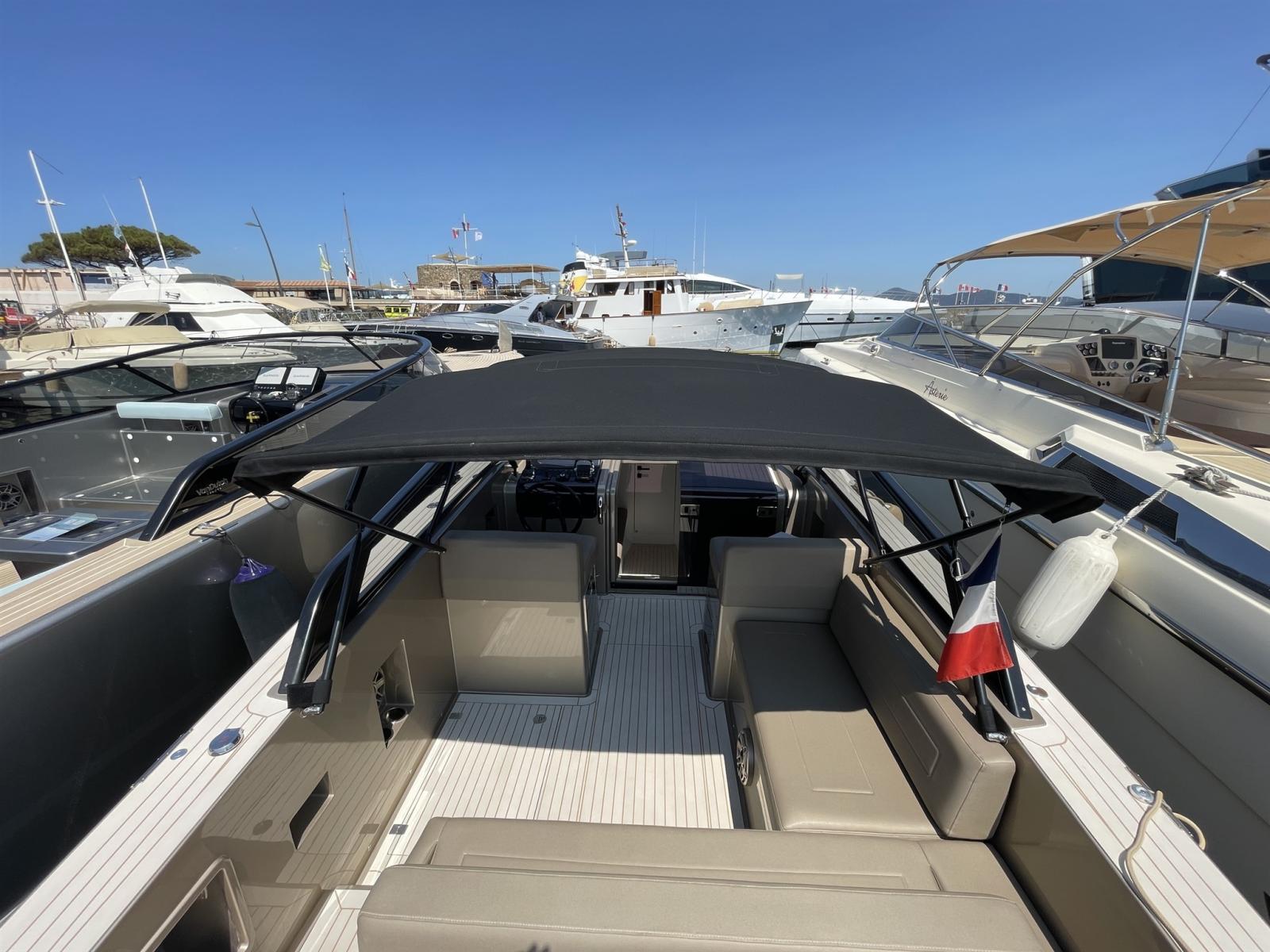 Alternateur, Trim hydraulique, 3 Batteries, Taquets pliants, Système de vidange, Câble d’alimentation à quai, Lavabo dans le cockpit, Spots sous-marins, Moniteur de batterie, Plateforme arrière, Pont en teck, Cockpit en teck, Prise de quai, Guindeau électrique, Echelle de bain, Corne.
