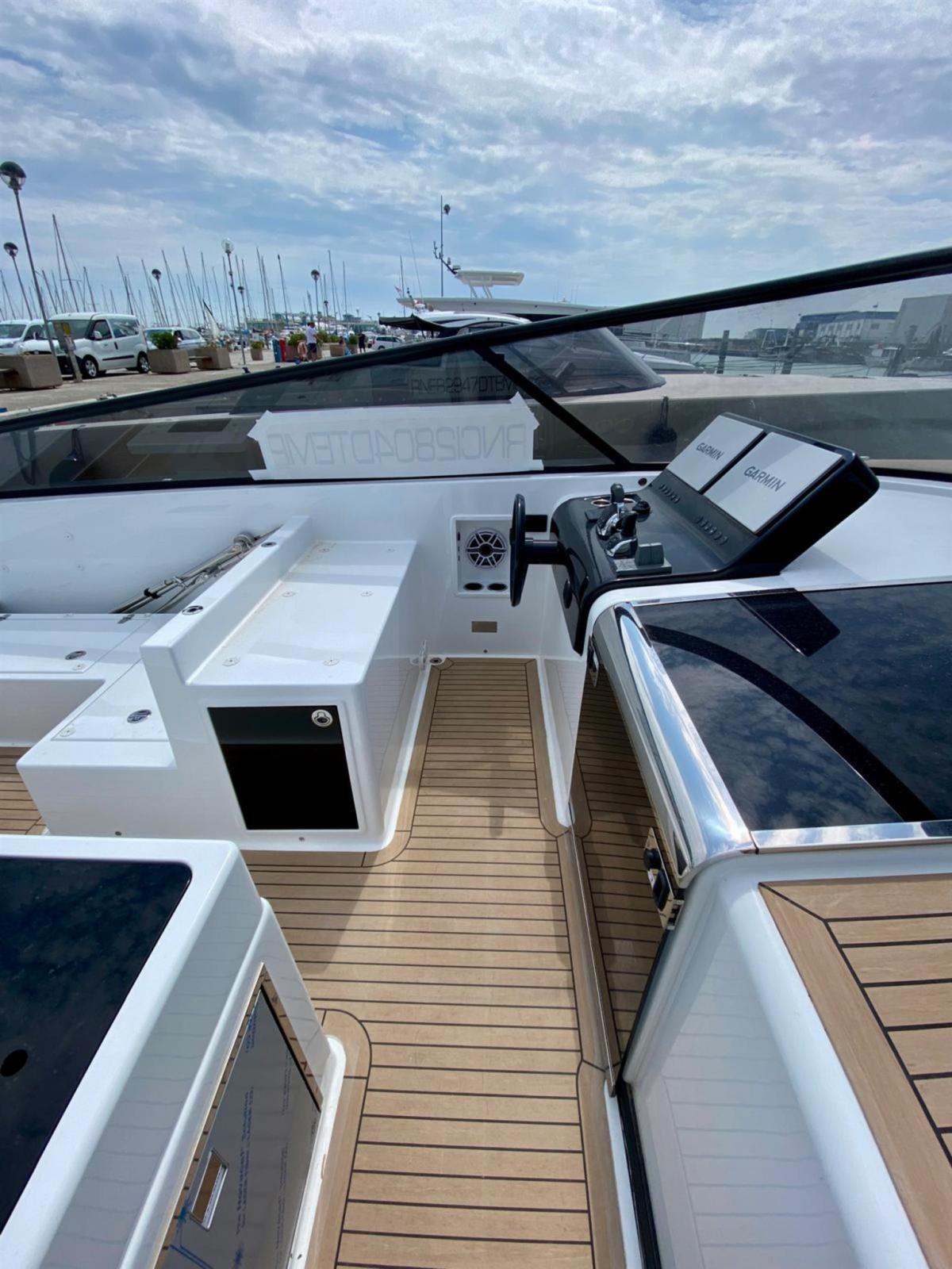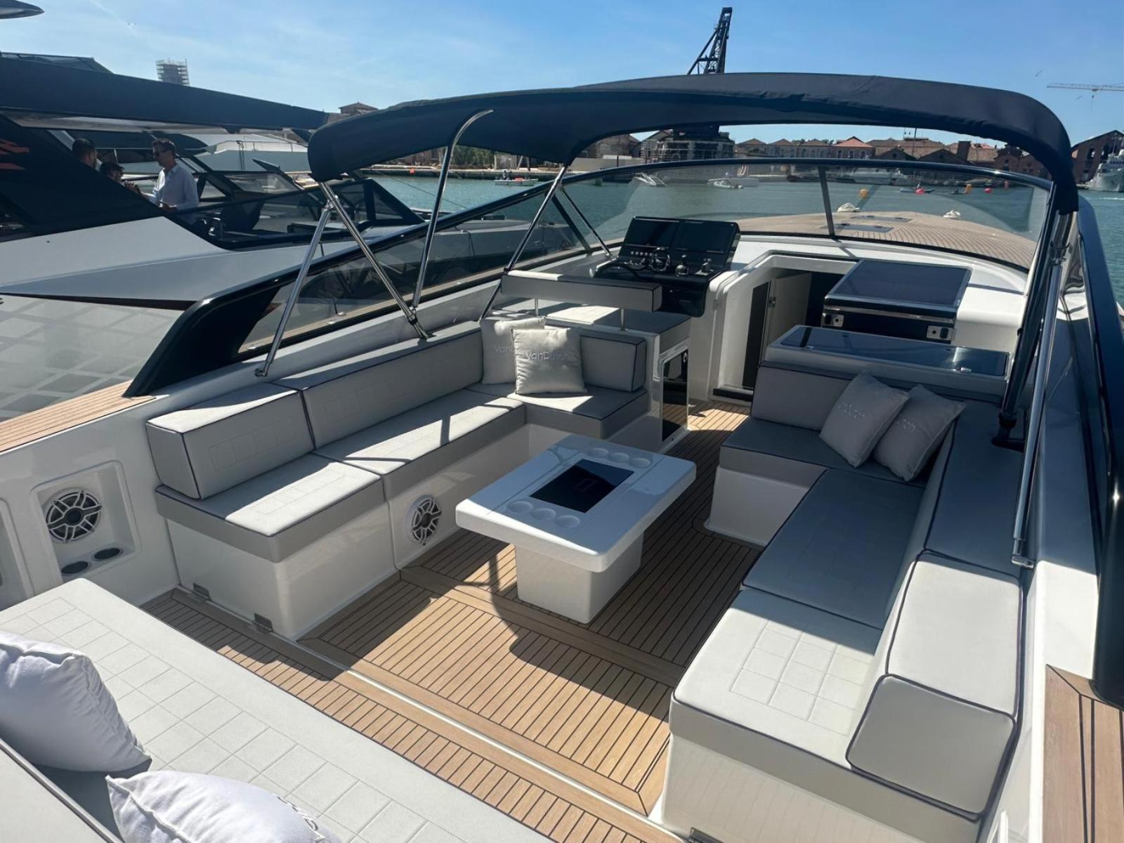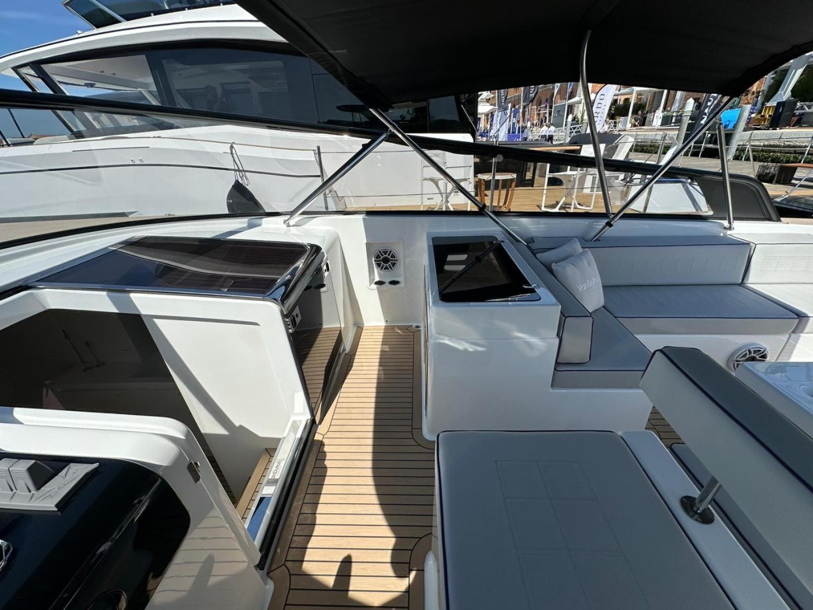 Alarme gaz, Alarme moteur, Alarme de pompe de cale, Alternateur, Auto Dynamic Trim Interceptor, Eau sous pression, Trim hydraulique, Taquets pliants, Câble d’alimentation à quai, Douche de cockpit, Fixation de l’ancre, Extincteur(s) fixe(s), Éclairage de courtoisie, Moniteur de batterie, Défenses, Plateforme arrière, Pompe de cale automatique, Pont en teck, Porte latérale, Cockpit en teck, Prise de quai, Echelle de bain, table de cockpit, Corne.