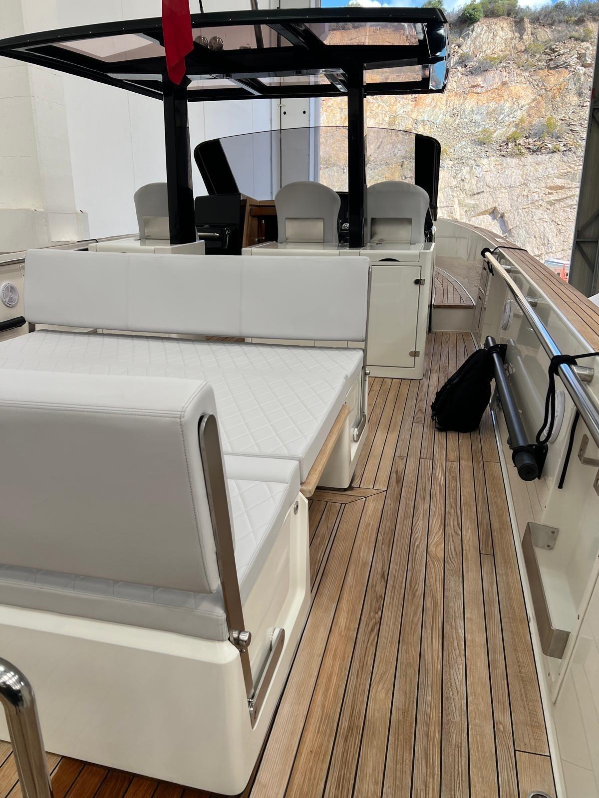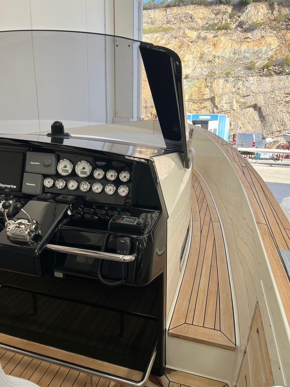 Alarme moteur, Ouverture du compartiment moteur électrique, Eau sous pression, Passavant en teck, Câble d’alimentation à quai, Douche de cockpit, Flaps électriques, Lavabo dans le cockpit, Éclairage de courtoisie, Passerelle, Cockpit en teck, Prise de quai, Guindeau électrique, Echelle de bain, table de cockpit, T-Top.