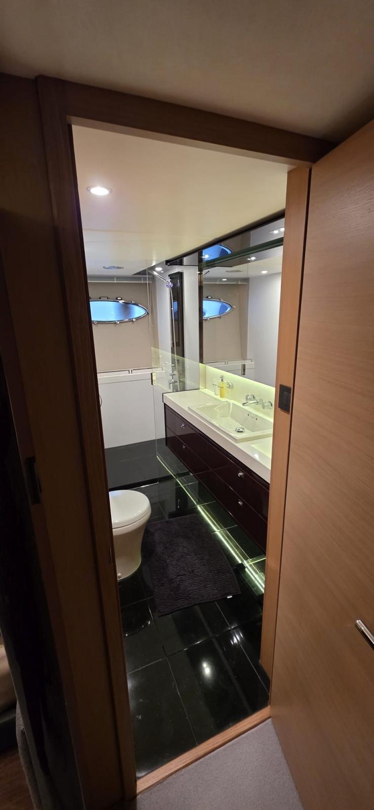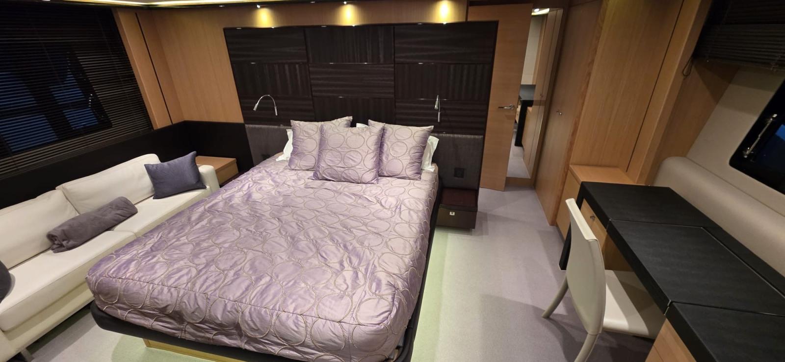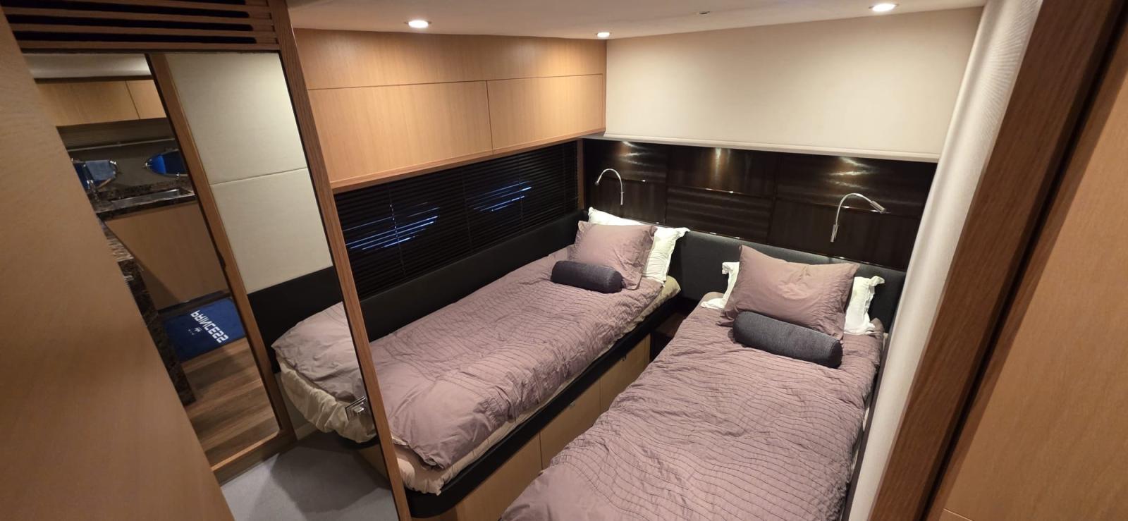 les garnitures extérieures ont été renouvelées en 2023, les écrans Raymarine ont été remplacés en 2016 et la climatisation complète a été entièrement révisée en 2022. Le bateau dispose de trois cabines spacieuses, chacune avec sa propre salle de bain attenante. La cabine principale occupe toute la largeur de la