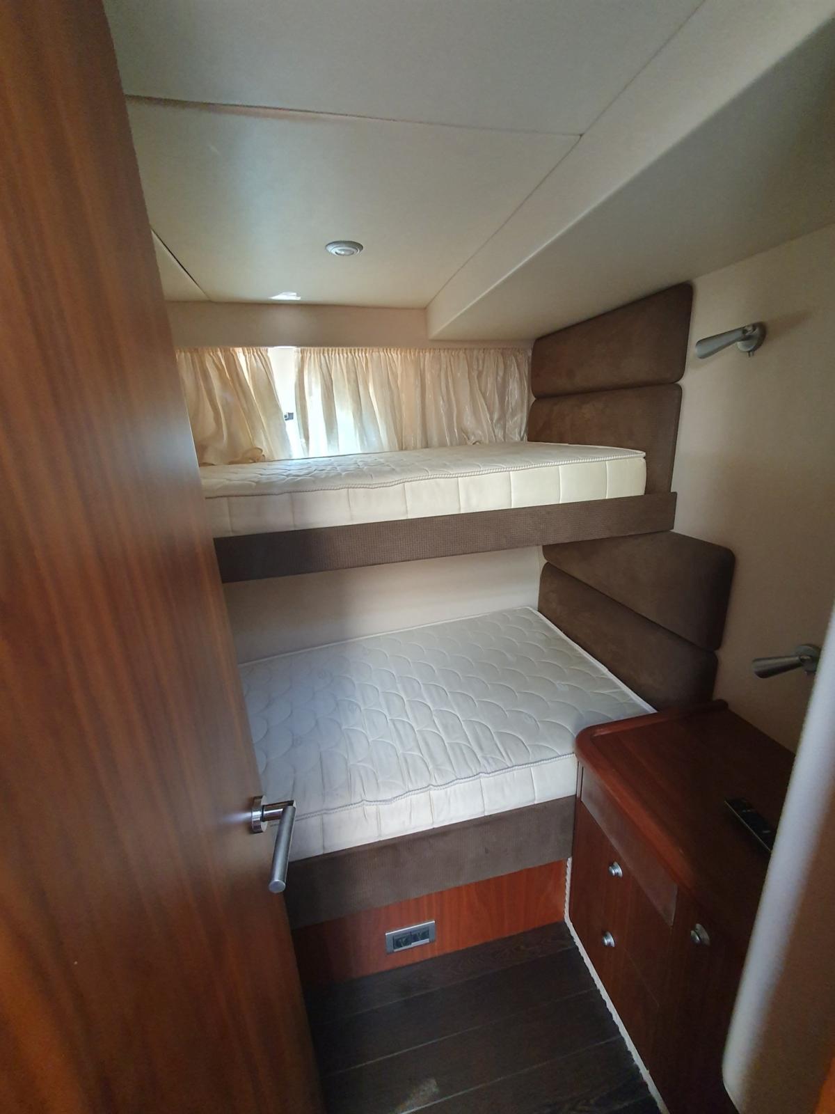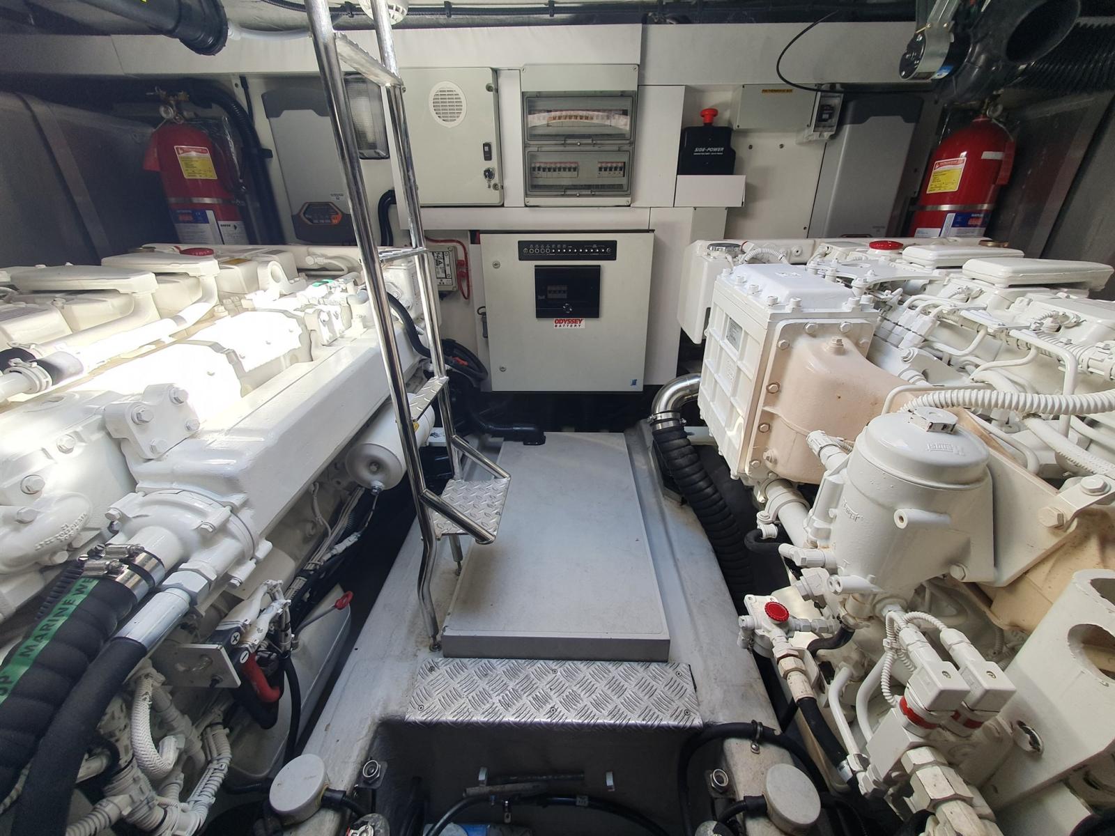 Alarme gaz, Alarme moteur, Alarme de pompe de cale, Douche de cockpit, Flaps hydrauliques, Extincteur(s) fixe(s), Lavabo dans le cockpit, Éclairage de courtoisie, Passerelle, Plateforme arrière (Tender lift system), Cockpit en teck, table de cockpit, 2 Winch électrique arrière.