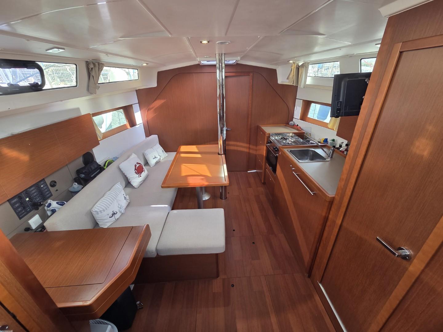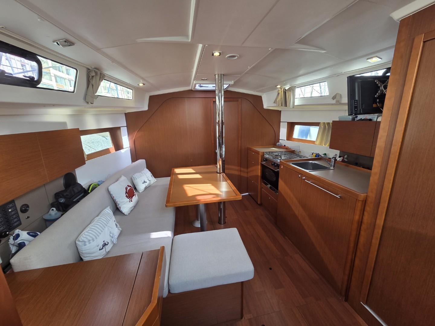 La cuisine, située sur tribord, est particulièrement fonctionnelle et bien équipée. Elle dispose d’un évier en inox avec eau chaude et eau froide, d’un grand réfrigérateur d’environ 130 litres, ainsi que de nombreux rangements facilitant la vie à bord.