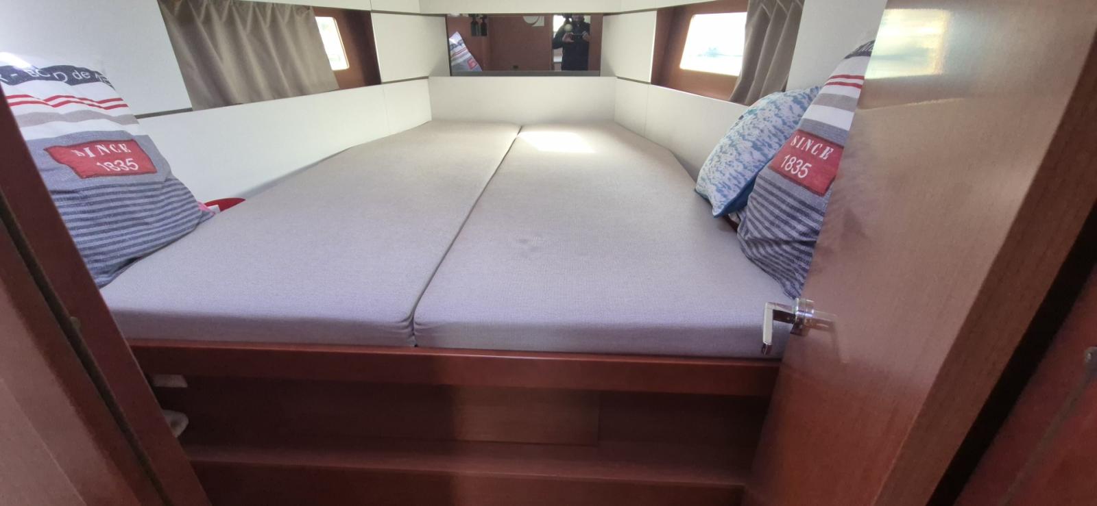 L’aménagement propose trois très belles cabines doubles, idéales pour la croisière en famille ou entre amis. Le bateau dispose également d’un WC séparé avec lavabo, ainsi que d’une véritable douche indépendante sur bâbord, un confort très appréciable à bord.
