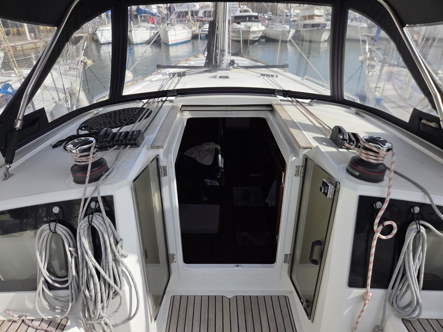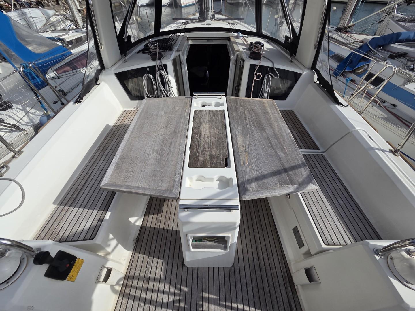 À l’extérieur, le cockpit est particulièrement spacieux, caractéristique des voiliers modernes qui offrent un volume remarquable et une grande convivialité en navigation comme au mouillage. Le bateau est protégé par une capote bimini neuve (2026) ainsi qu’une capote de descente également remplacée en 2026, assurant une excellente protection en navigation.