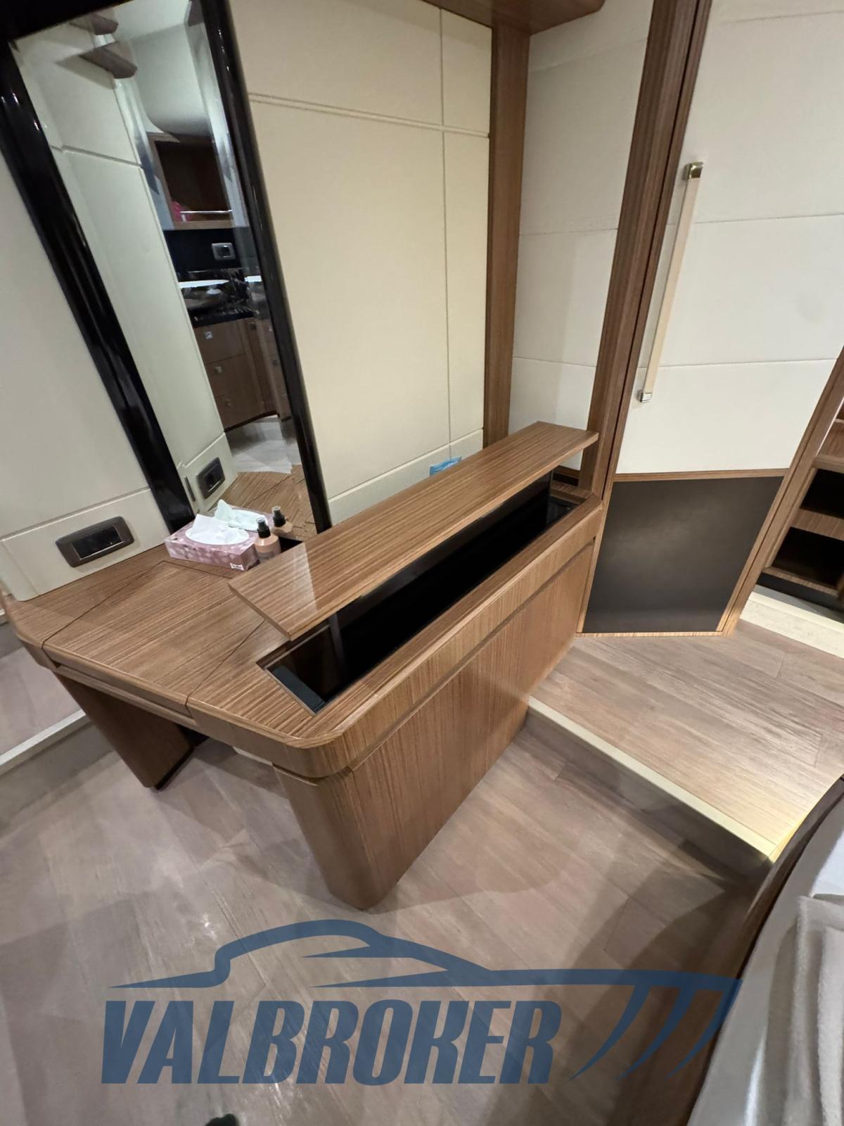 Trawler appréciait son équilibre entre confort, efficacité et maniabilité. Produite par le chantier naval italien, cette version se distingue par sa coque de planage qui permet une navigation sûre aussi bien à basse vitesse qu’en planage. Équipé de 2 Volvo Penta IPS 650 qui facilitent la manœuvre grâce au joystick. Cabines : Il dispose de 3 cabines (la principale au milieu du navire avec salle de bain attenante, la chambre VIP à la proue et une troisième cabine d’amis avec lits doubles).
