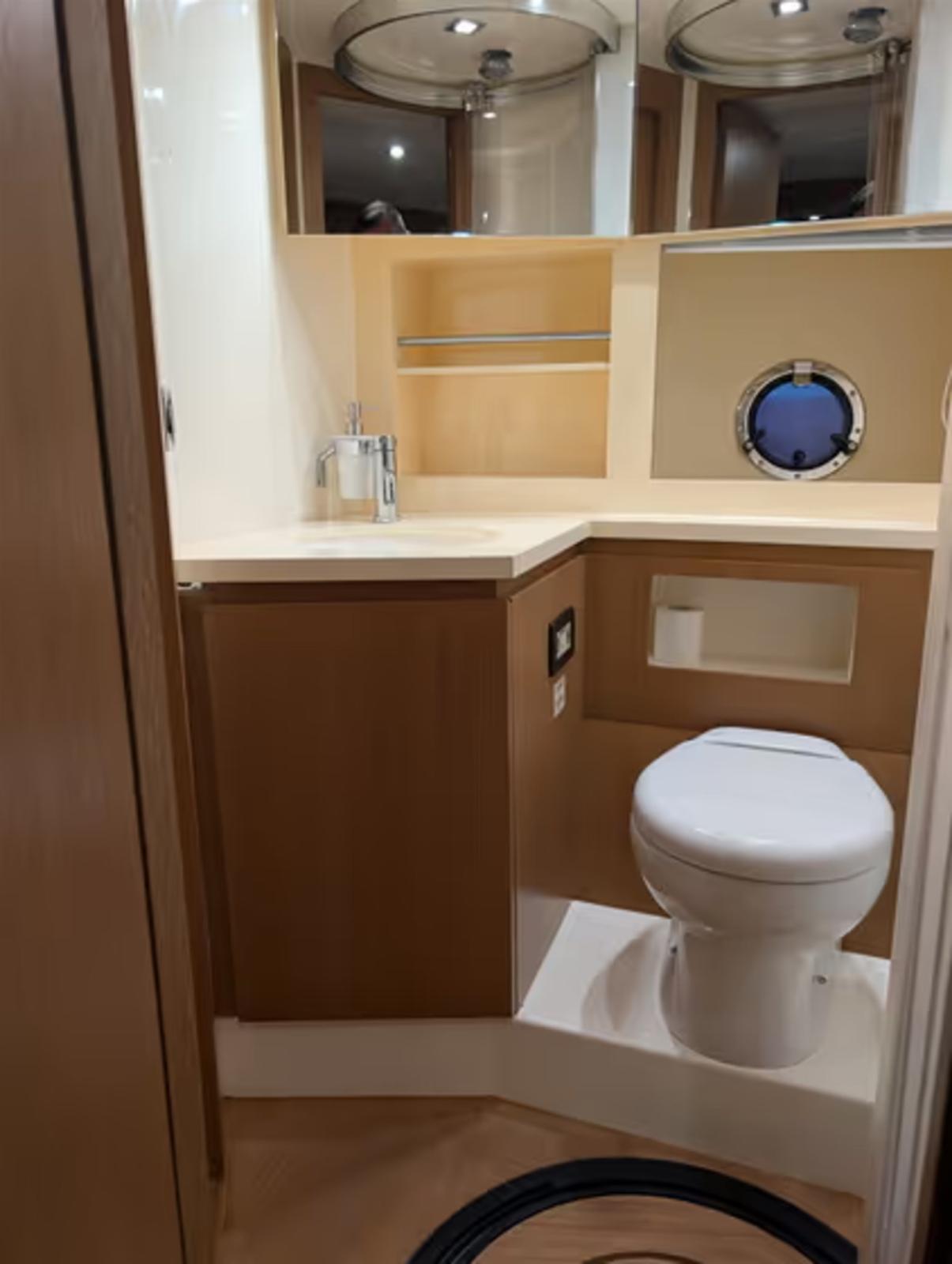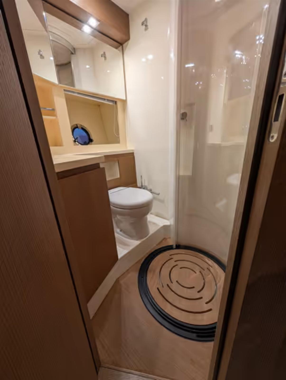 CABINE VIP À L’AVANT AVEC LIT DOUBLE ET SALLE DE BAIN ATTENANTE AVEC CABINE DE DOUCHE