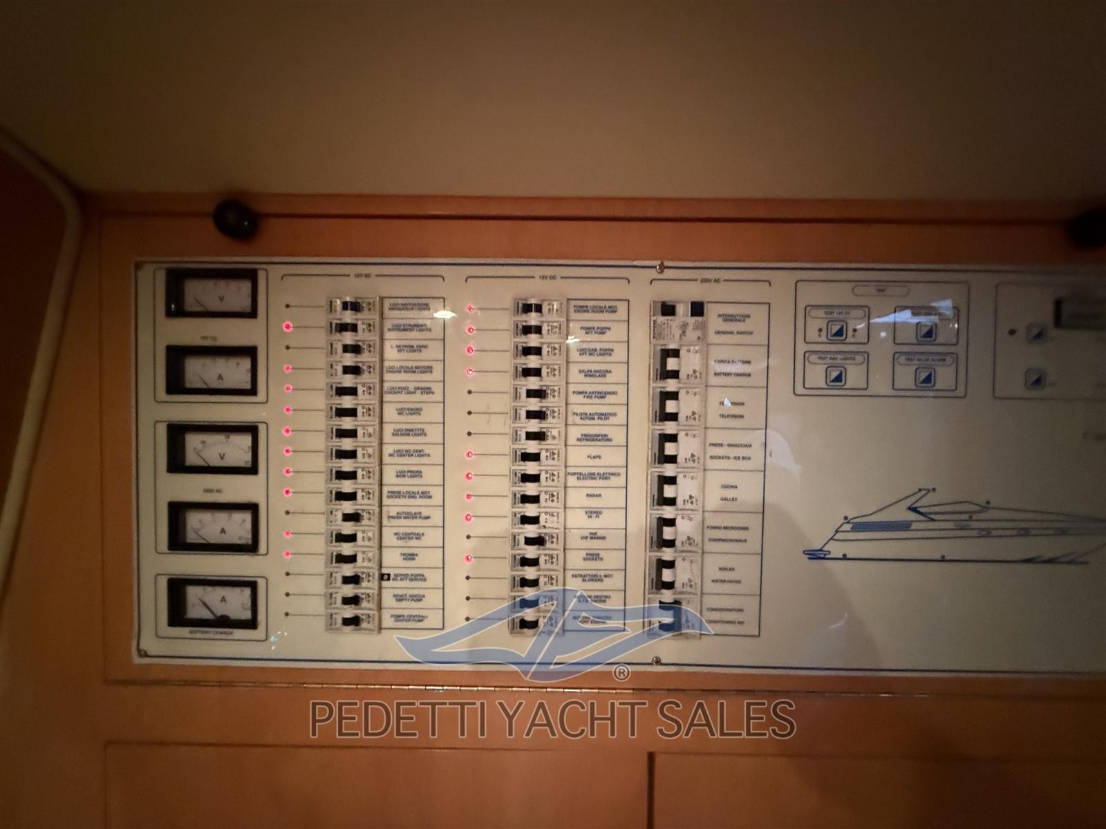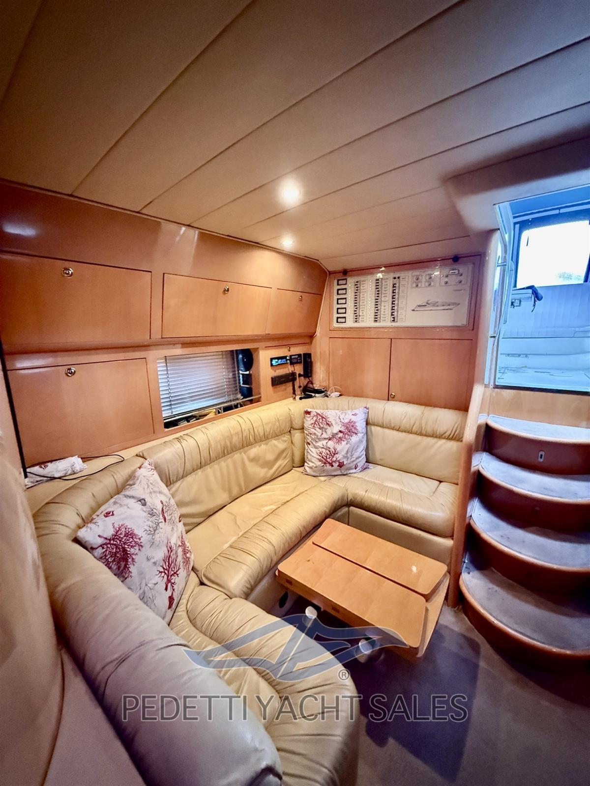 Alarme gaz, Alarme moteur, Alarme de pompe de cale, Alternateur, 2 Hélice de rechange, Phare de poursuite, Flaps électriques, Garage à annexe, Pompe de cale automatique, Pompe de cale manuelle, Porte latérale, Prise de quai, Guindeau électrique, table de cockpit, Table pliante de salon, Corne.