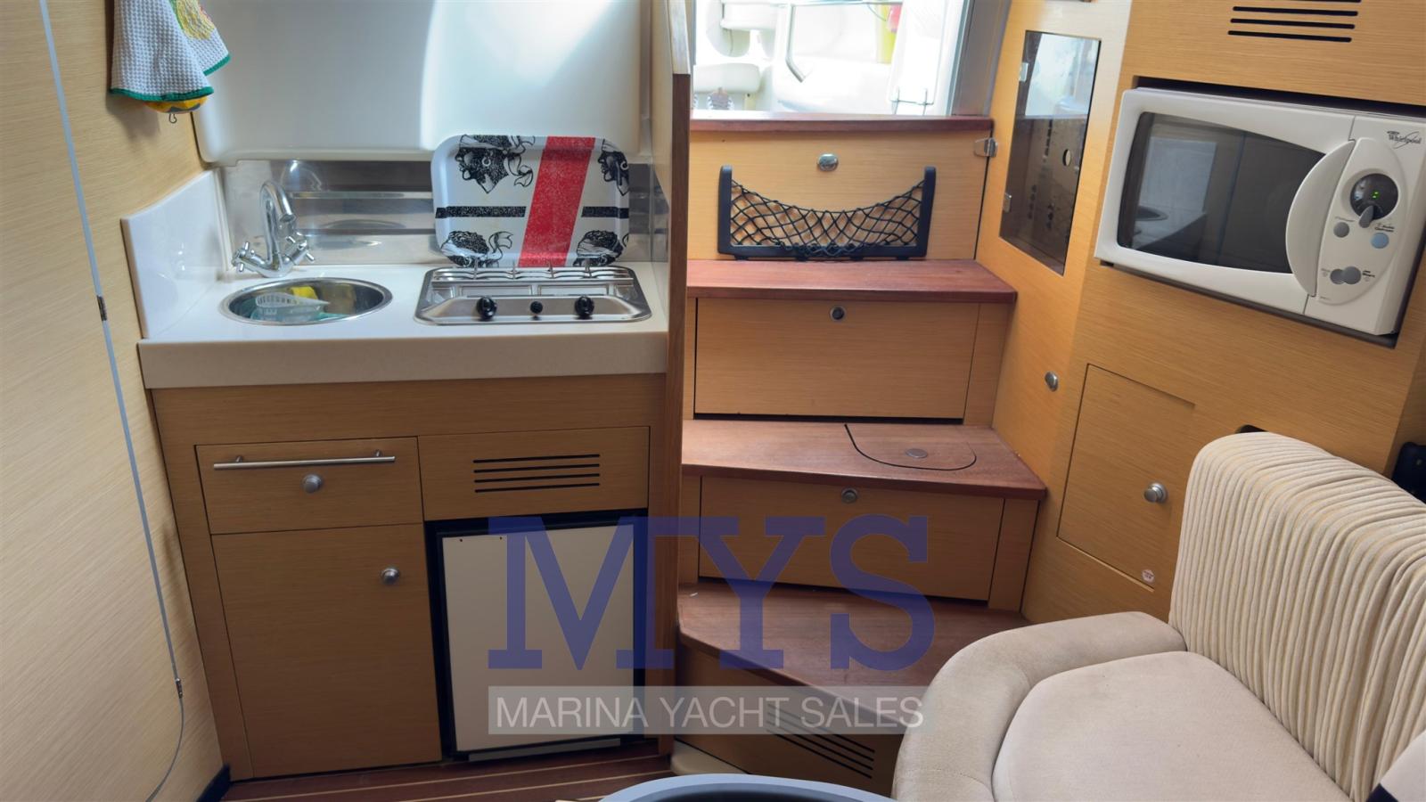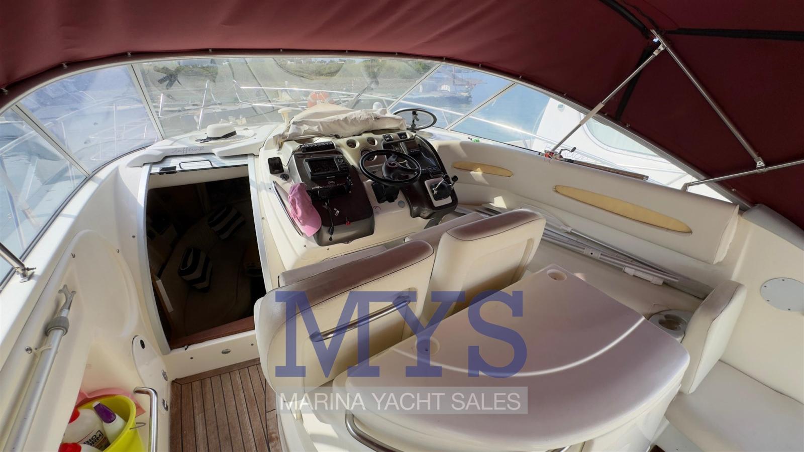 Alarme moteur, Eau sous pression, Douche de cockpit, Plateforme arrière, Pompe de cale automatique, Porte latérale, Prise de quai, Guindeau électrique, Echelle de bain, table de cockpit, Corne.