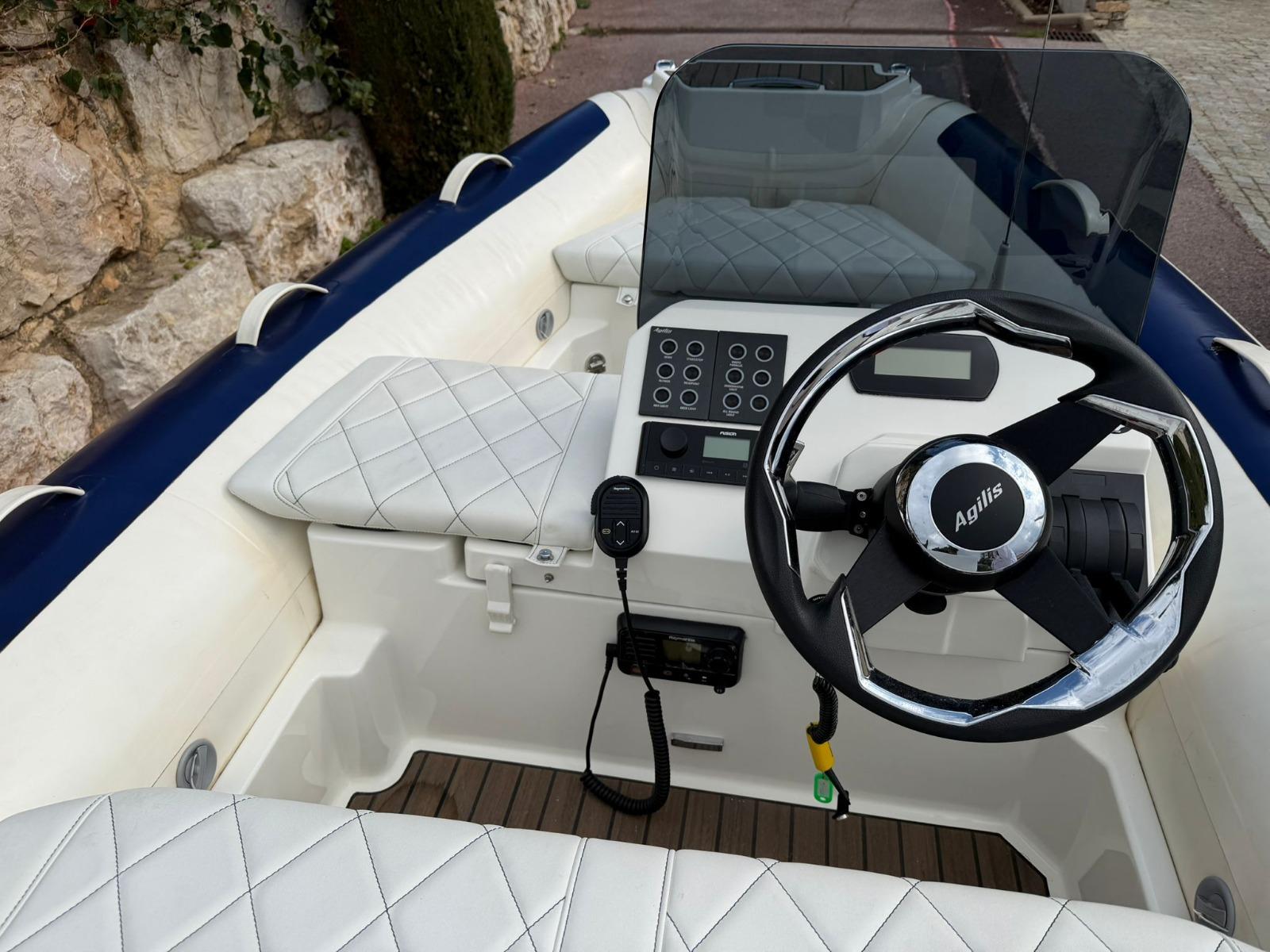 Le cockpit spacieux accueille confortablement 4 à 5 personnes avec une console de pilotage centralisée. Les boudins larges assurent stabilité et sécurité, avec des rangements optimisés sous les sièges.