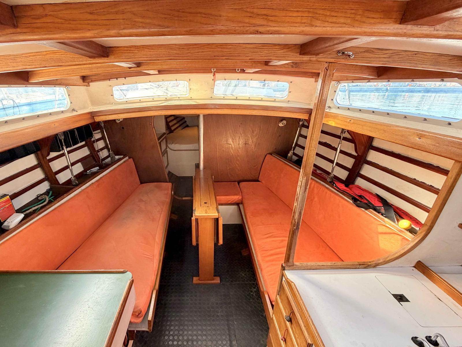 À l’intérieur, l’espace reste simple mais chaleureux, avec des boiseries apparentes rappelant l’authenticité des voiliers traditionnels. Le cockpit, intimiste, permet au chef de bord d’être au plus proche des sensations et de l’environnement marin.