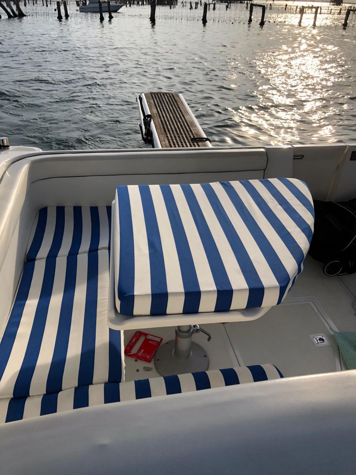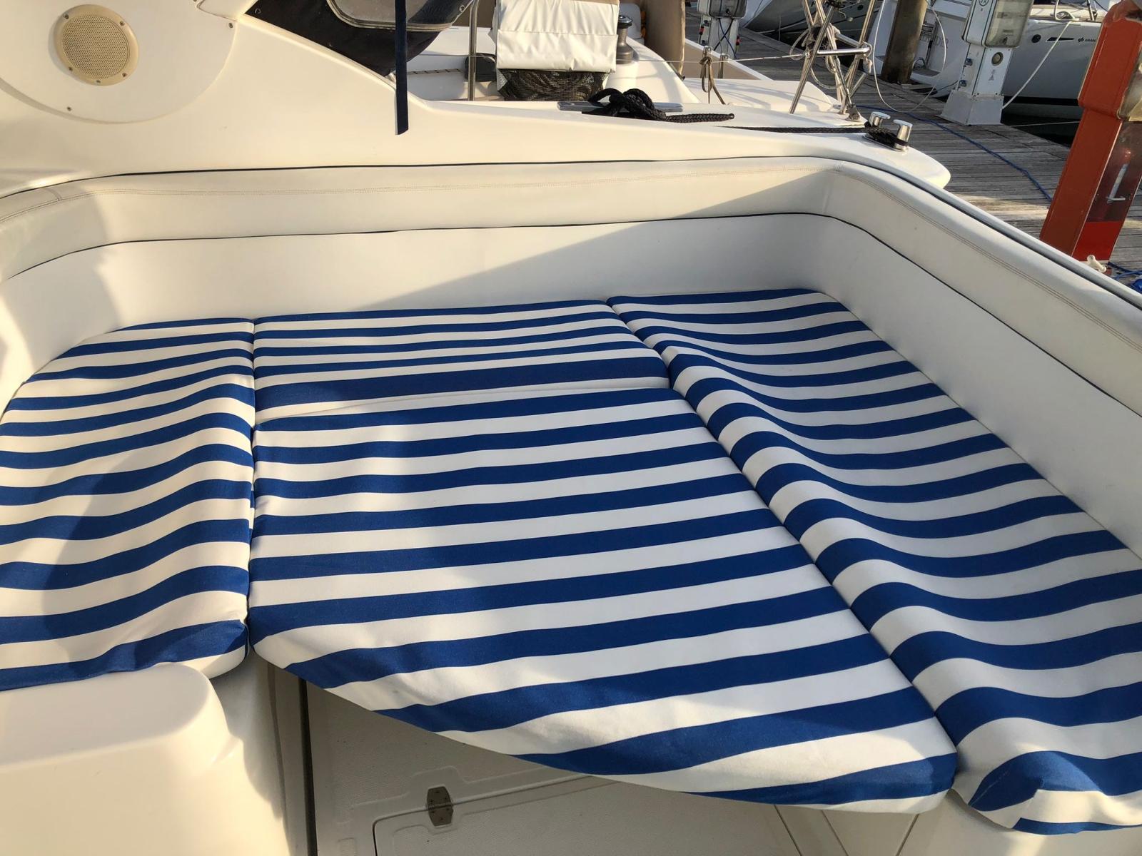 2025 NOUVEAU TISSU SYNTHÉTIQUE DE HAUTE QUALITÉ SUR LA PLATEFORME DE BAIN - NOUVELLE SELLERIE EXTÉRIEURE (SIÈGES DE COCKPIT, PONT ARRIÈRE ET PROUE) AVEC DOUBLE REMBOURRAGE « BLANC EN CUIR ÉCO COMME À L’ORIGINE PLUS LA SELLERIE EN MATÉRIAU OLEO HYDRO » - REMPLACEMENT DE LA POMPE ÉLECTRIQUE DU 2 WC - NOUVEAU CHARGEUR DE BATTERIE - NOUVEAUX MOTEURS DE TOILETTES -