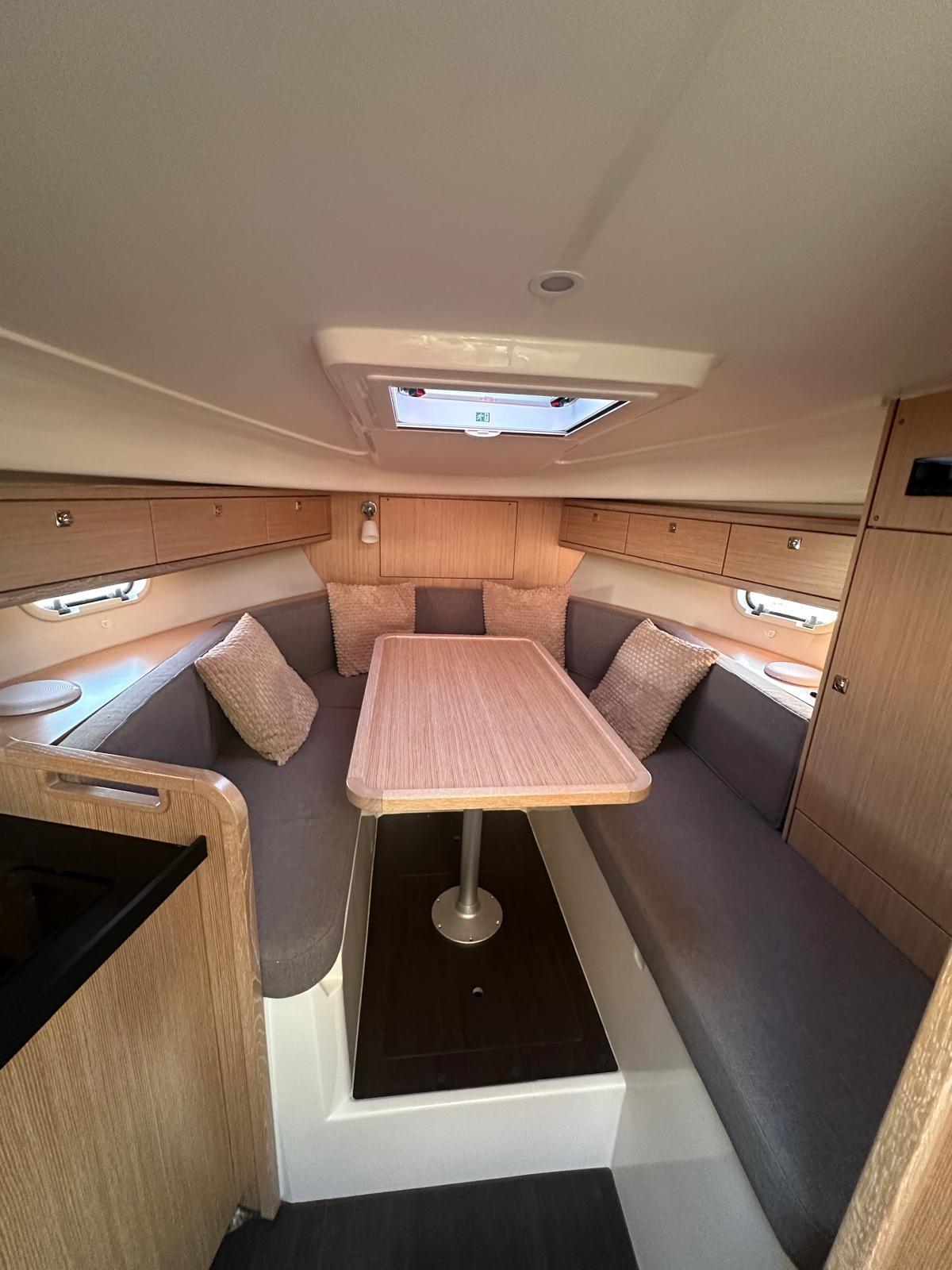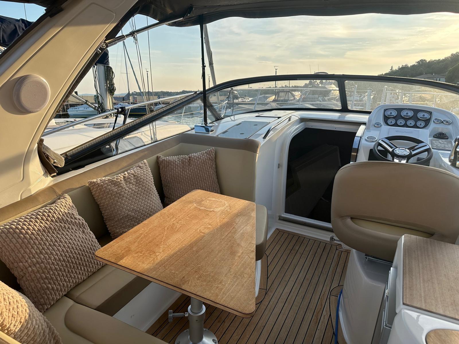 Alarme moteur, Ouverture du compartiment moteur électrique, Eau sous pression, Douche de cockpit, Flaps électriques, Extincteur(s) fixe(s), Lavabo dans le cockpit, Éclairage de courtoisie, Spots sous-marins, Défenses, Plateforme arrière, Cockpit en teck, Prise de quai, Rollbar, Guindeau électrique, Echelle de bain, table de cockpit, Table pliante de salon, Corne.