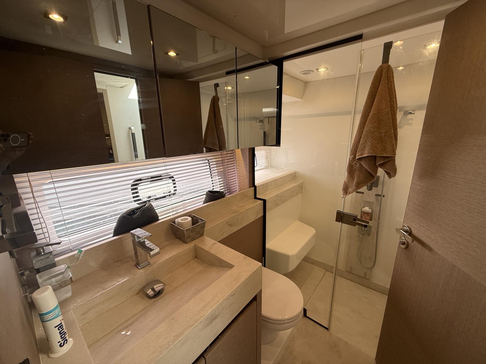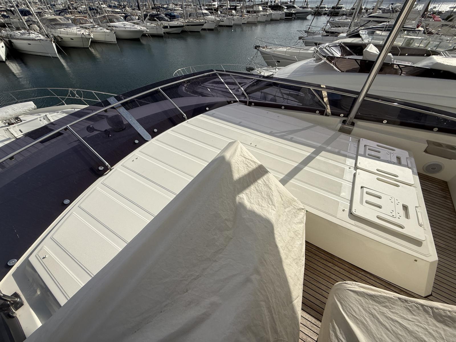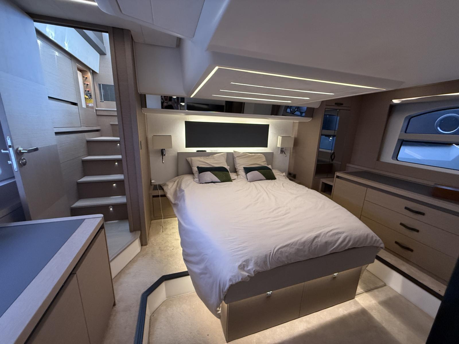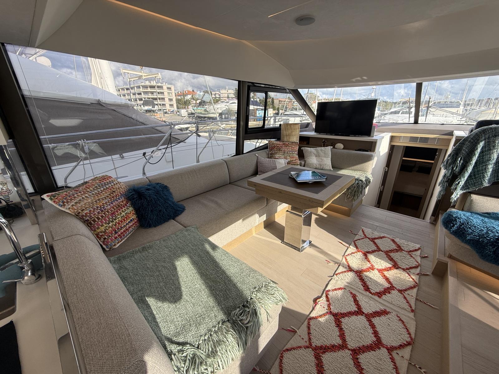 Extérieur & Confort : Sellerie Brittany taupe + micro-perforé noir pare-brise avant, antenne WiFi 4G routeur, interrupteurs pied guindeau, pressions inox baches, coussins sur-mesure cabines, pack éclairage courtoisie, store banne électrique cockpit, toile ombrage avant carbone, clips fixation pieds cabine skipper, hard top flybridge, passerelle hydraulique télescopique, plateforme bain hydraulique, table télescopique avant Abacos, rideaux extérieurs PVC/Sunworker.