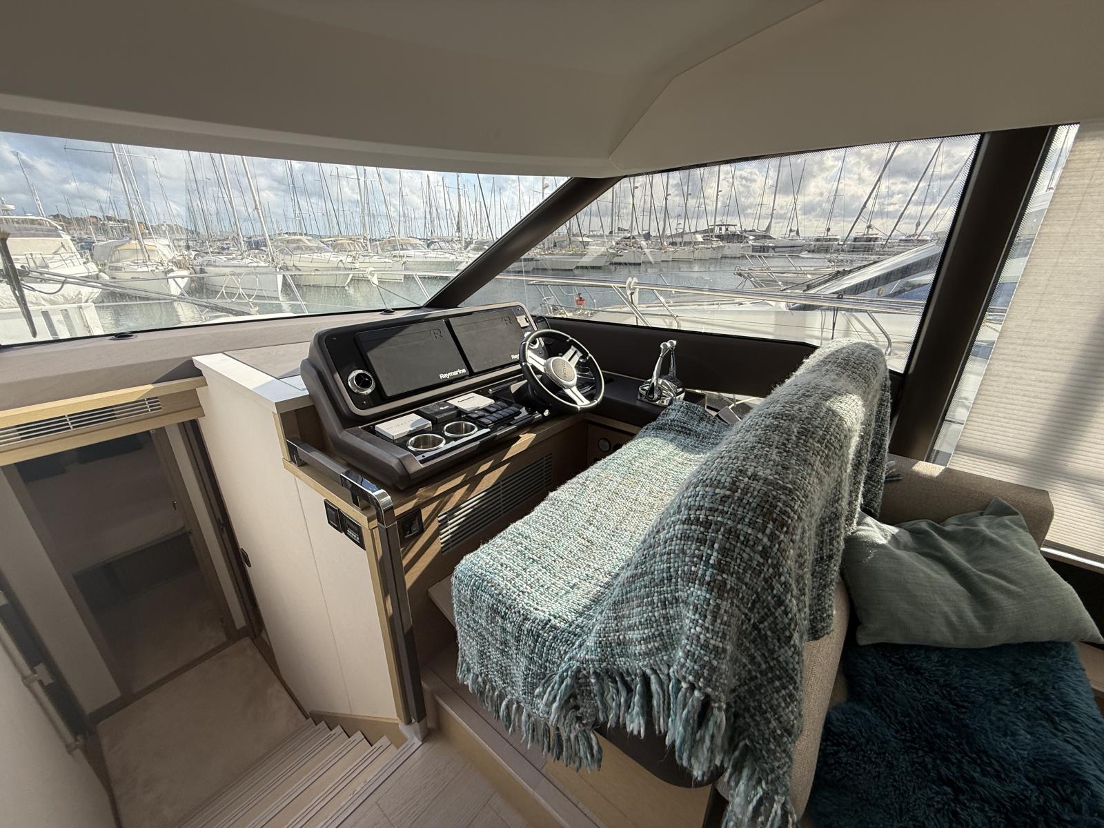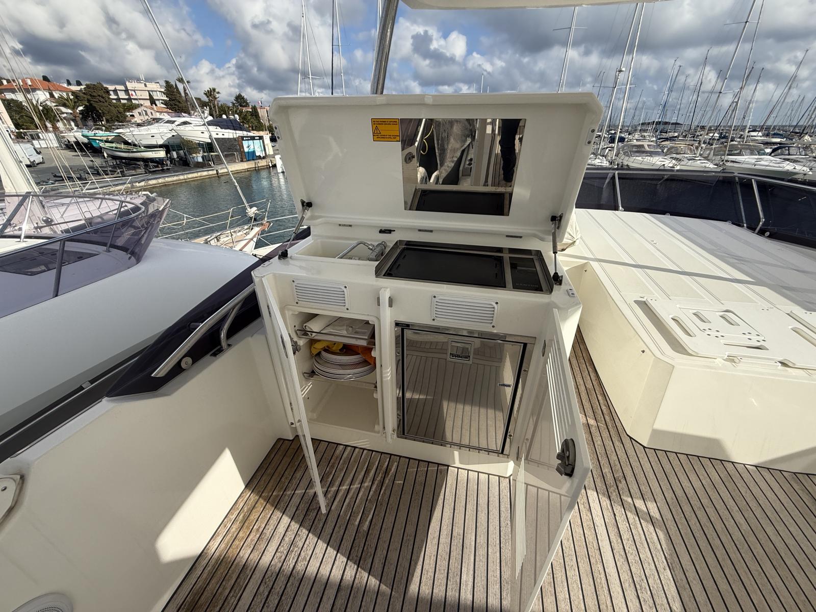 Options Haut de Gamme : Dessalinisateur 100L/h, monitoring batteries, Ship Control distant, 4 projecteurs sous-marin Lumishore bleu, projecteur pont/LED arrière, grill/réfrigérateur fly, machine glaçons cockpit, plancher fly teck, banquette relax Abacos, housses fly/cockpit.