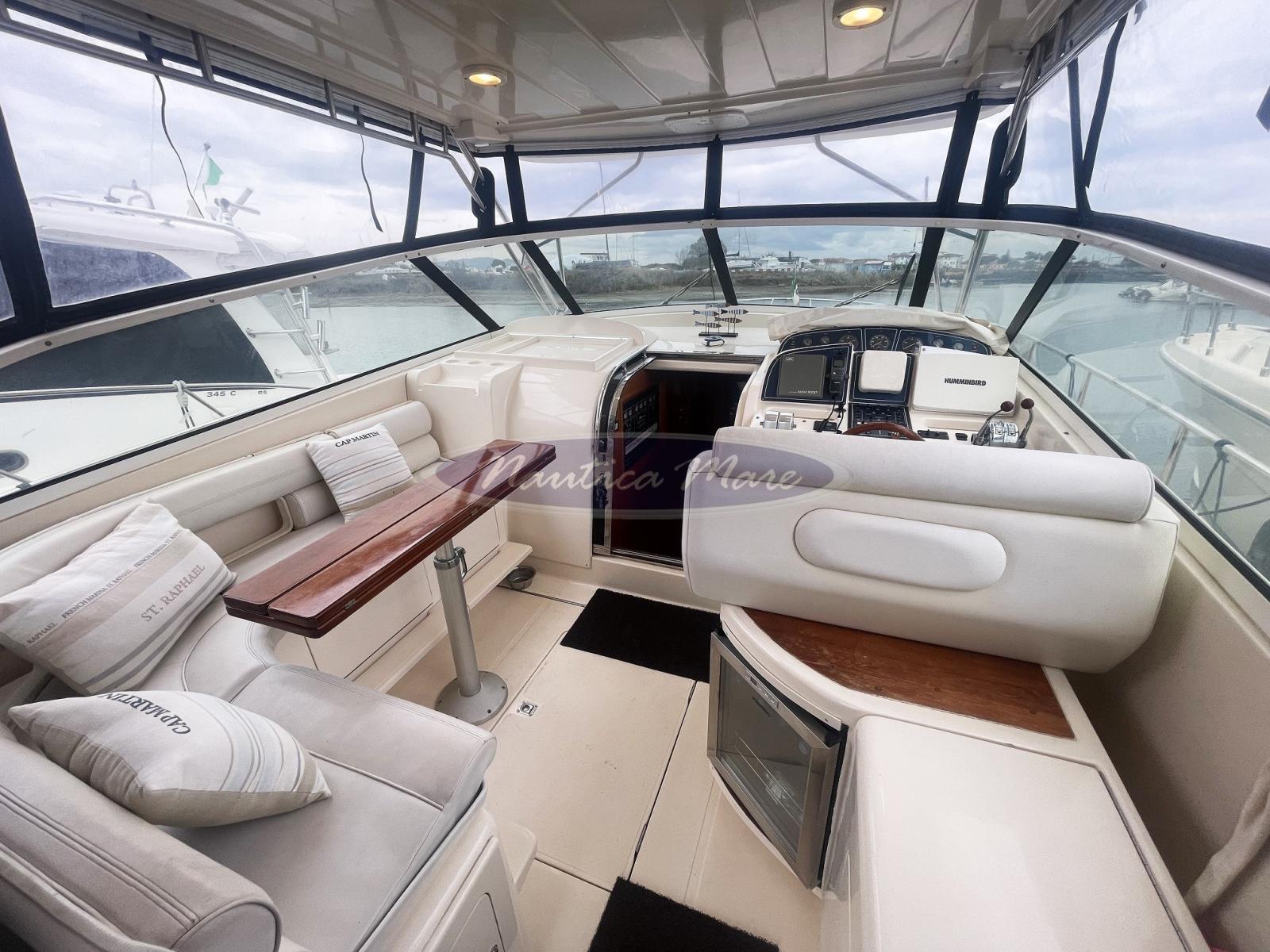 Alarme moteur, Alternateur, Ancre (con musone inox a prua), Ouverture du compartiment moteur électrique, Eau sous pression, Câble d’alimentation à quai, Douche de cockpit (a prua ed a poppa con miscelatore c/f), Propulseur d'étrave (Vetus), Phare de poursuite (di profondità sul tetto hard top), 2 Flaps hydrauliques (elettroidraulici con doppio pistone attuatore), Hard top (Vetroresina e acciaio con tendalini di chiusura), Extincteur(s) fixe(s), Lavage de chaine (a prua), Lavabo dans le cockpit, Éclairage de courtoisie, Défenses, Passerelle (acciaio e teak), Plateforme arrière (bagno a poppa con rivestimento in teak sintetico), Pompe de cale automatique, Pompe de cale manuelle, Porte latérale (tuna door a poppa), Cockpit en teck (sintetico), Prise de quai (con caricabatterie), Guindeau électrique, Echelle de bain (integrata nella piattaforma bagno a poppa), table de cockpit (doppio tavolo nel pozzetto e dinette esterna), Corne, T-Top (in acciaio inox), Winch électrique avant.