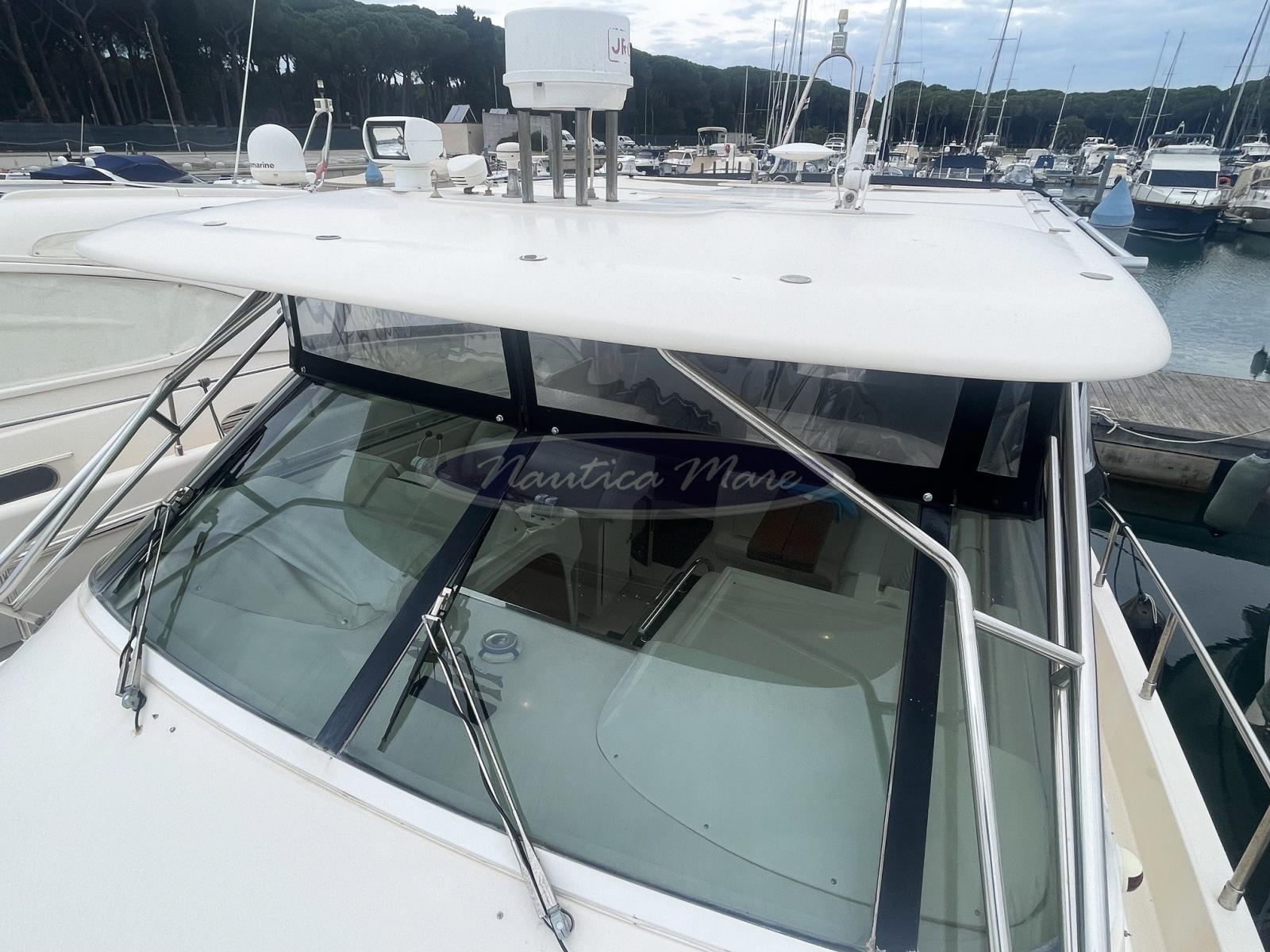 Indicateur d'angle de barre (sul pilota automatico), Antenne radar, Sondeur pêche (Furuno), GPS (Humminbird), Plotter GPS, Panneau de commande (completo con leve telecomando motori meccaniche Morse), Radar (JRC LCD Radar 1000), Radio VHF (Raymarine), Siège copilote (poltrona di comando doppia).