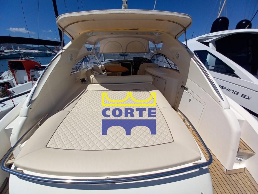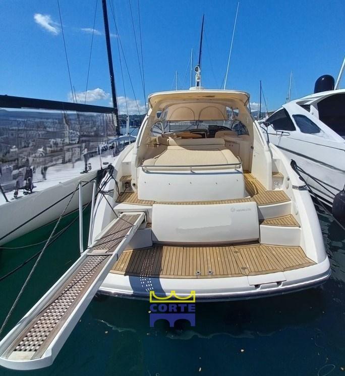 Alarme moteur, Alarme de pompe de cale, Eau sous pression, Douche de cockpit, Phare de poursuite, Flaps hydrauliques, Garage à annexe, Lavabo dans le cockpit, Passerelle (elettroidraulica a scomparsa), Plateforme arrière (di poppa in teak), Pompe de cale automatique, Porte latérale, Cockpit en teck, Prise de quai, Guindeau électrique, Echelle de bain, table de cockpit, Corne.
