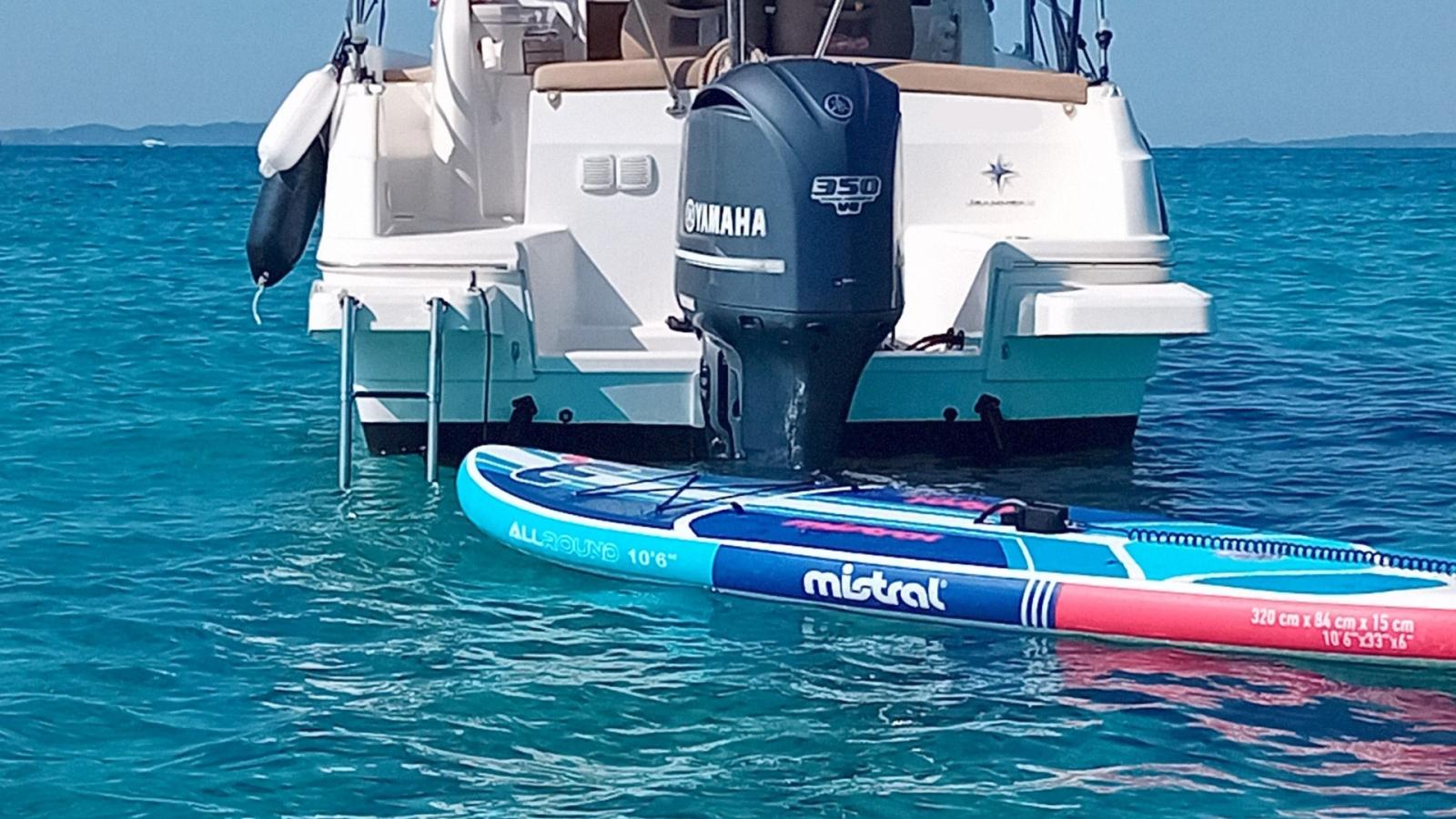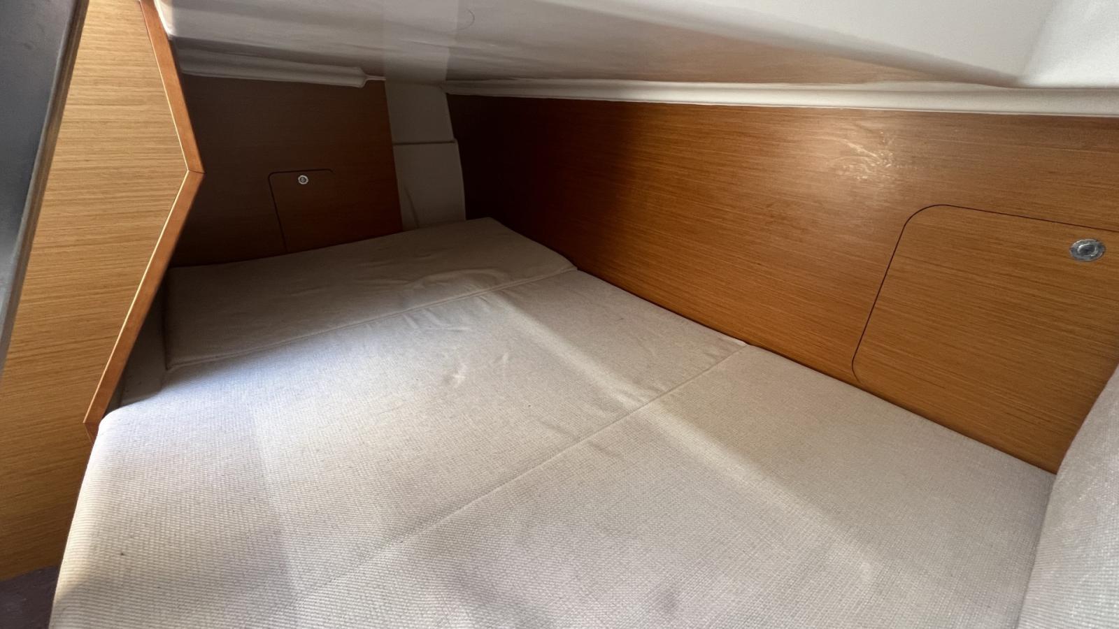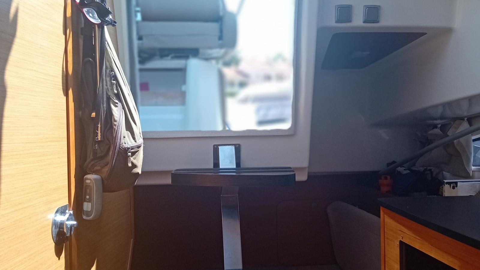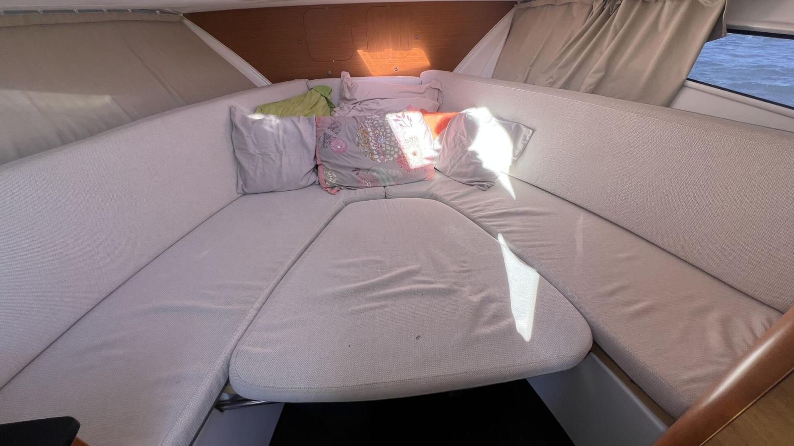Carré transformable extérieur sur-mesure, Bain de soleil avant refait (2021), Coussins cockpit, Bimini (arceaux inox), Taud de fermeture arrière micro-perforé sur-mesure (2021), Cabine avant, 2 couchettes doubles, Réfrigérateur, Chauffe-eau 30L (220V), Salle d’eau, Réservoir eaux noires, Karcher, Glacière.