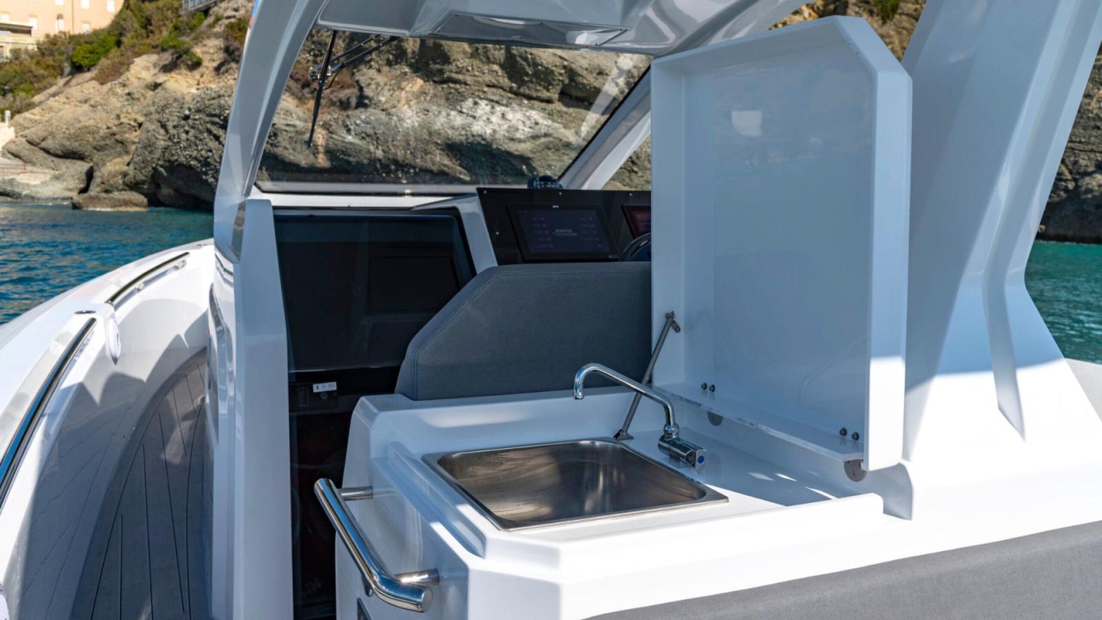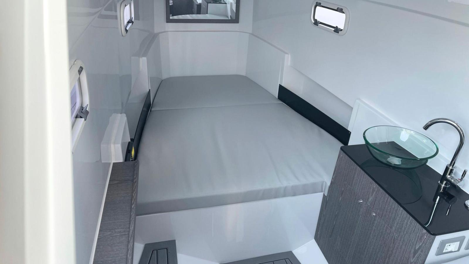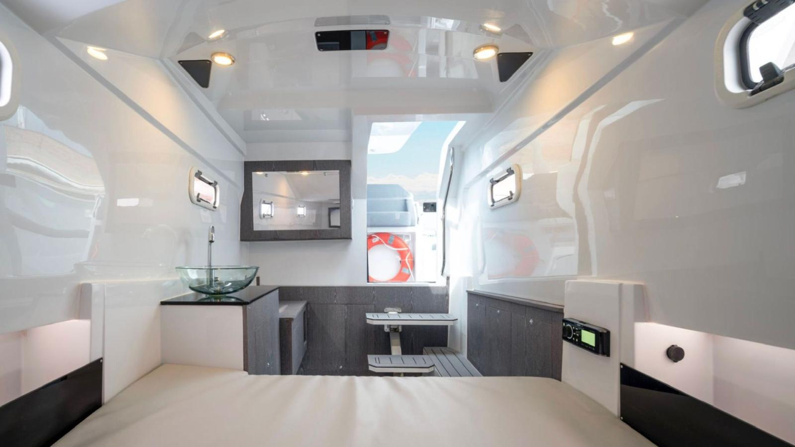 Sous le pont, la rare cabine double avec salle de bain offre intimité et capacité de nuit, rendant cette unité également adaptée pour de courtes croisières côtières, des excursions élégantes d'une journée, ou comme tender de luxe pour un yacht plus grand.