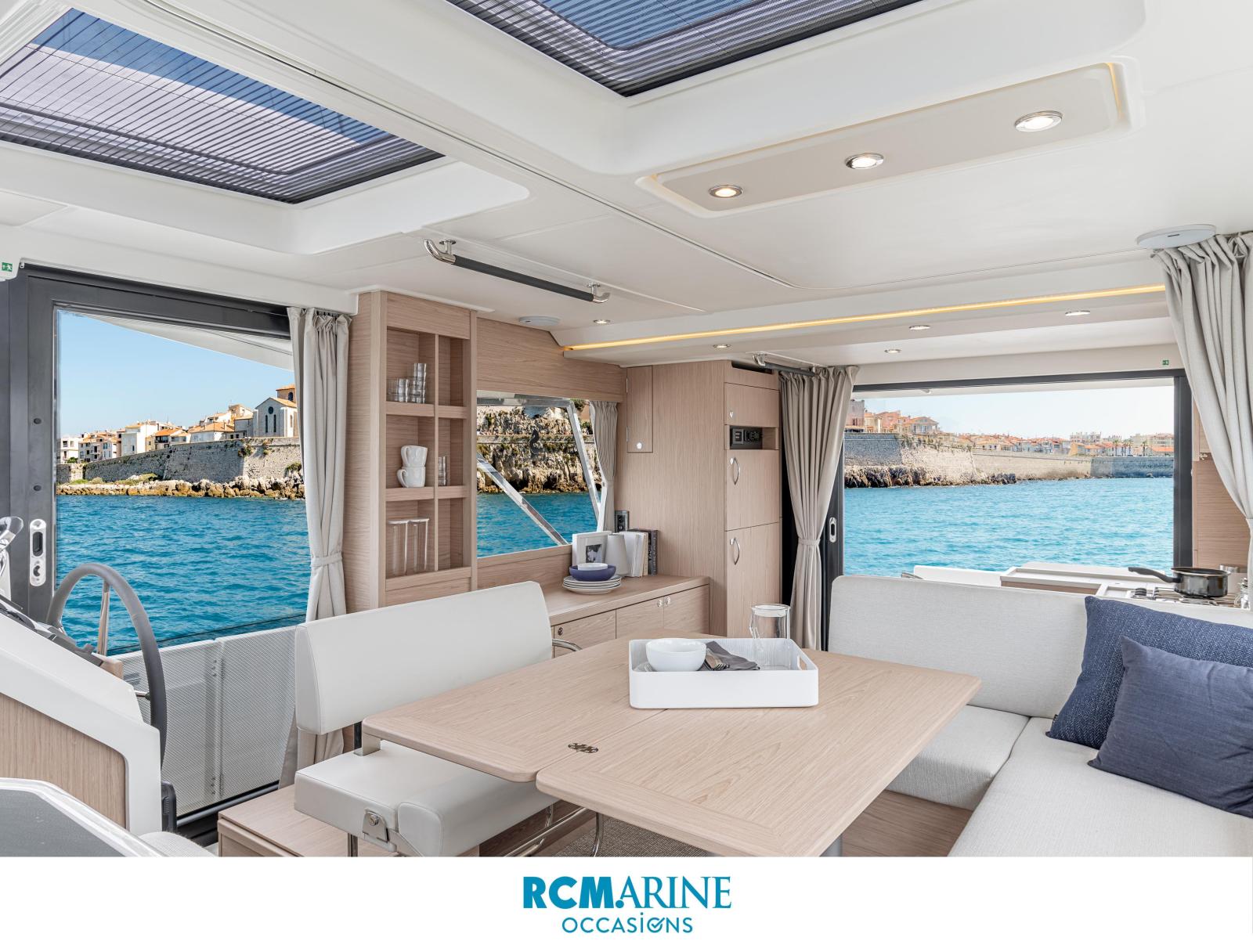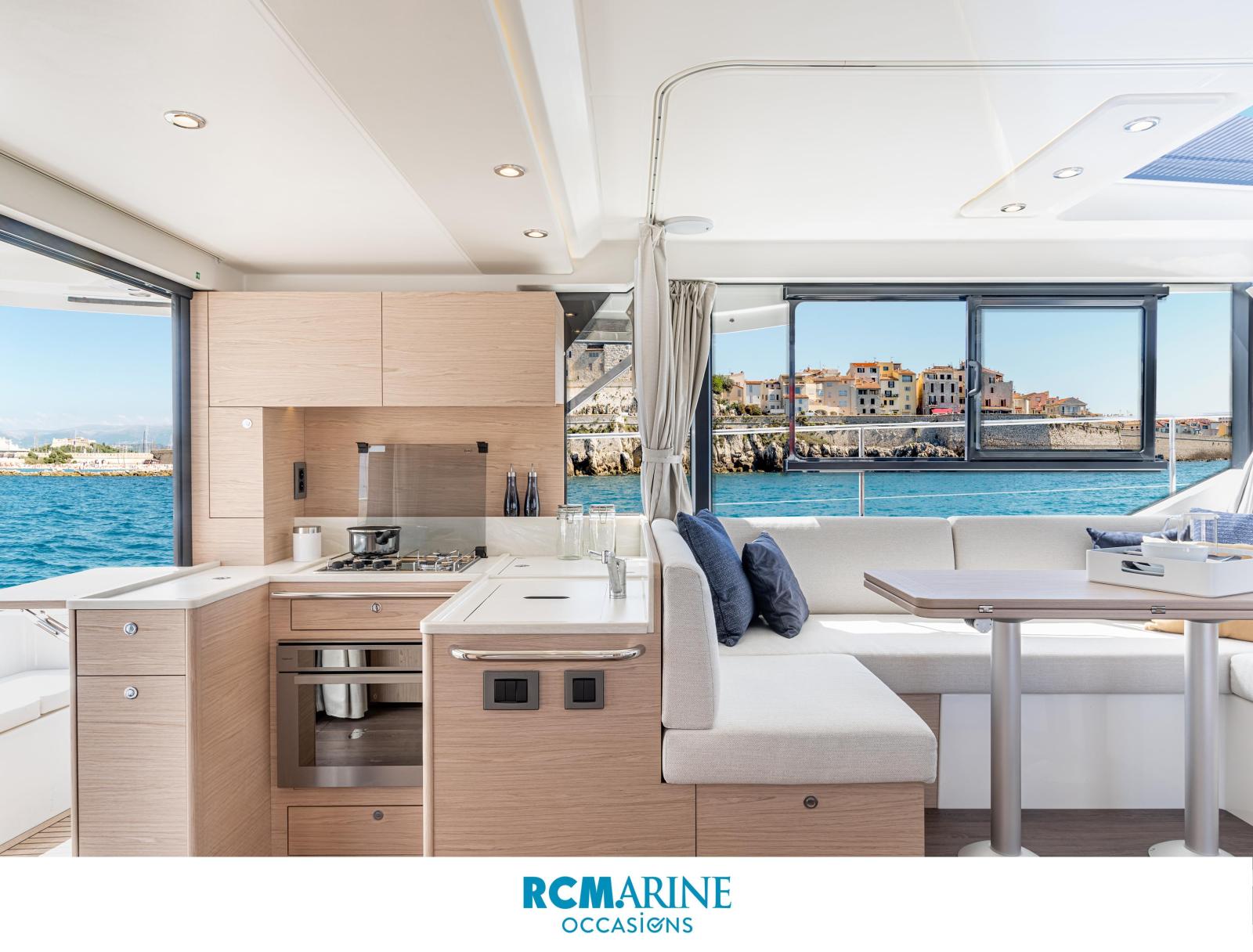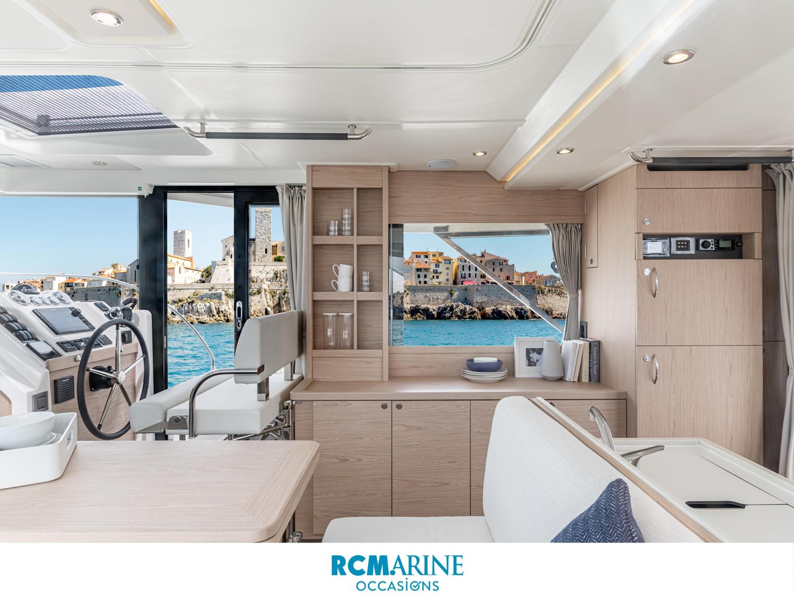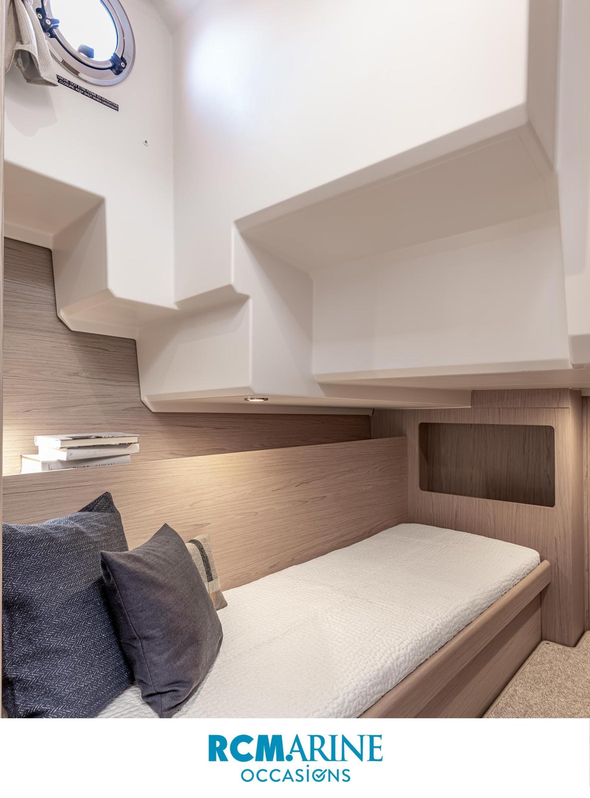 À bord, les volumes impressionnent immédiatement. Le vaste salon baigné de lumière naturelle crée une atmosphère chaleureuse et contemporaine, tandis que la cuisine parfaitement intégrée invite à prolonger les moments de convivialité. Les espaces nuit offrent un confort remarquable, avec des cabines pensées pour préserver intimité et sérénité lors des navigations au long cours.