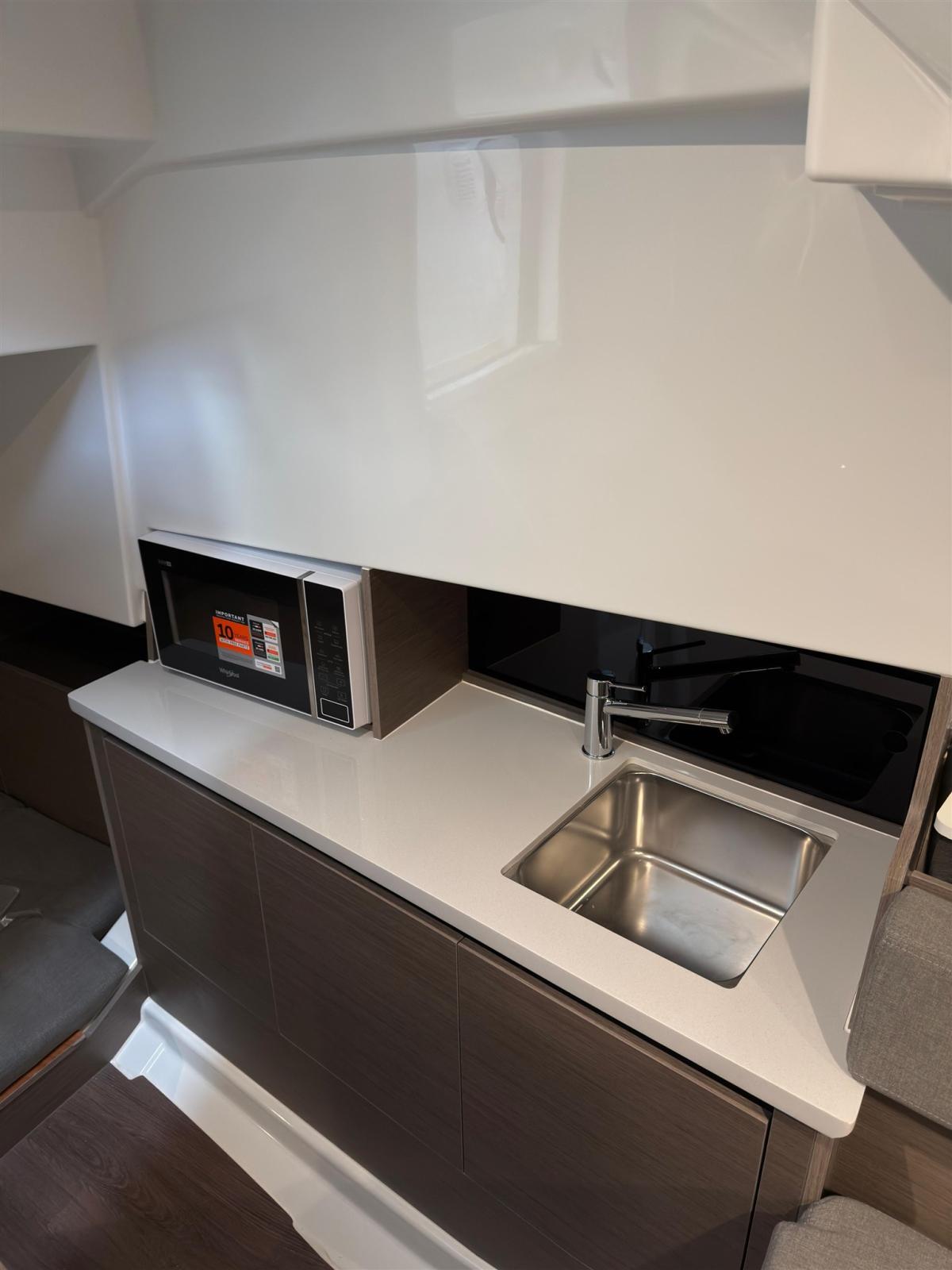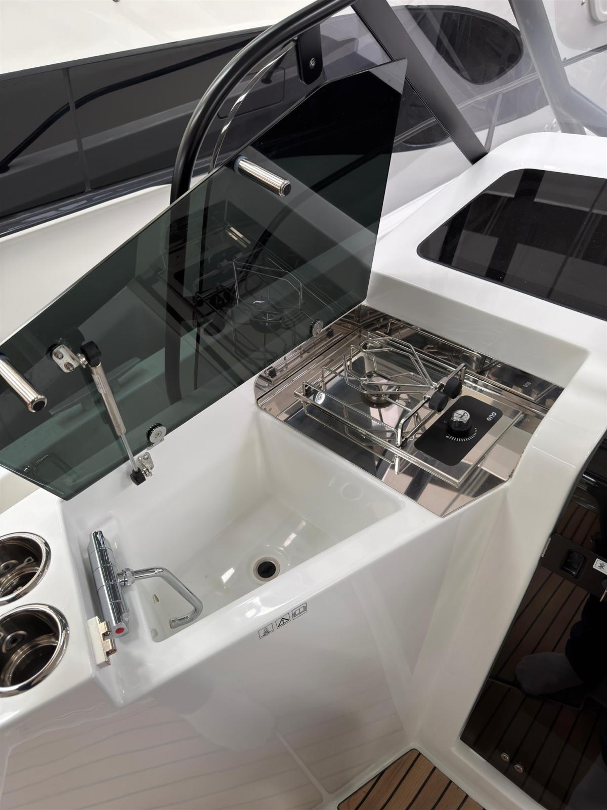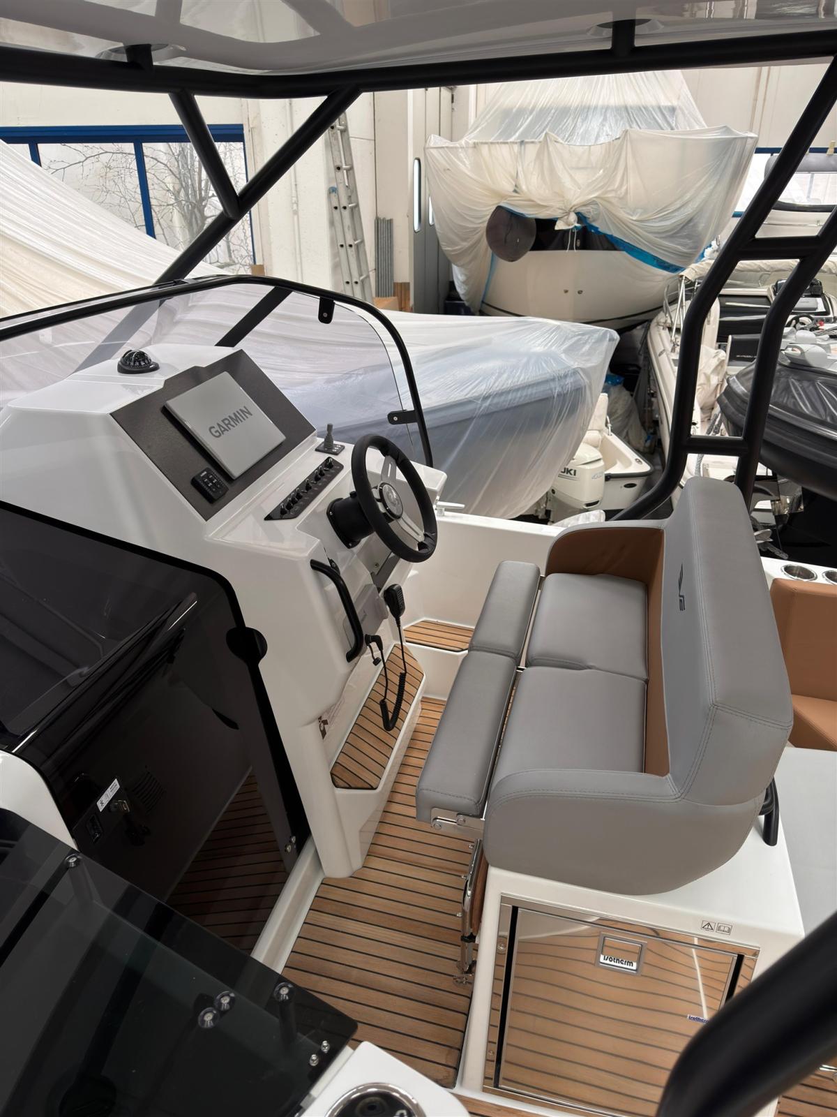 PILOT EDITION Décoration coque Pilot Edition Pilot Edition Balcons en acier inoxydable T laqué noir (toit en polyester et carré en acier inoxydable noir) décorations Lumières sous-marines bleues Linetex Glacier + Sellerie en craie - Siège de cockpit avec dossier convertible en plateforme de bain de soleil - Banc de pilote et copilote de soutien - Pont de proue avec dossier mobile - Banc pliant derrière le poteau pour s’incliner Trappe ouvrante Lumières de courtoisie LED dans le cockpit Table en bois avec pied télescopique pouvant être transformée en plateforme de bain de soleil