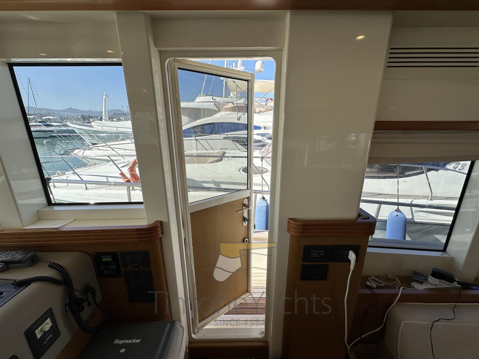 Le rouf est équipé de grandes fenêtres qui s’ouvrent verticalement et le pont principal abrite une confortable terrasse à l’avant, tandis que le flybridge abrite un deuxième bain de soleil et un coin dînette, avec canapé et table.