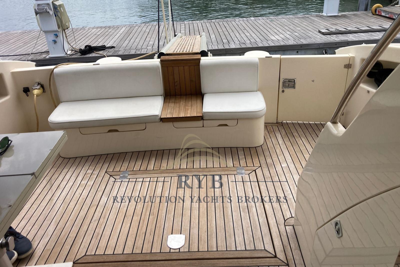 Eau sous pression, Douche de cockpit, Double barre à roue, Phare de poursuite, Flaps hydrauliques, Extincteur(s) fixe(s), Passerelle, Plateforme arrière, Pompe de cale automatique, Porte latérale, Cockpit en teck, Prise de quai, Rollbar, Guindeau électrique, Echelle de bain, Corne.
