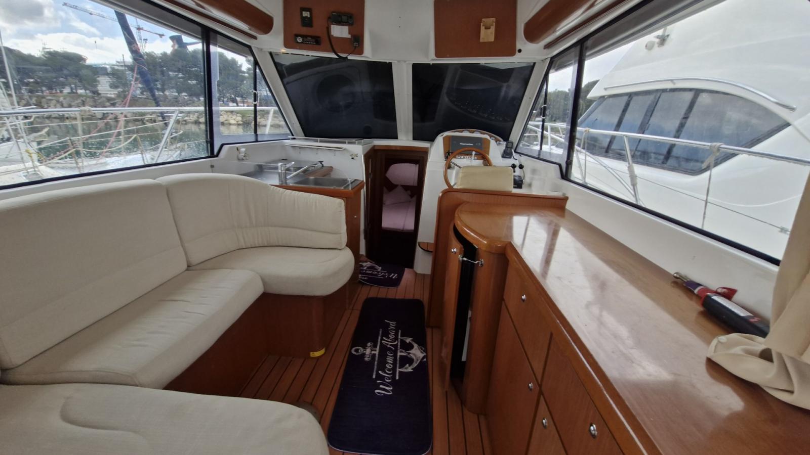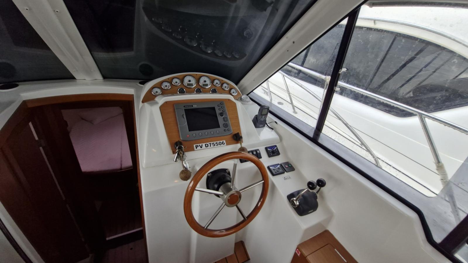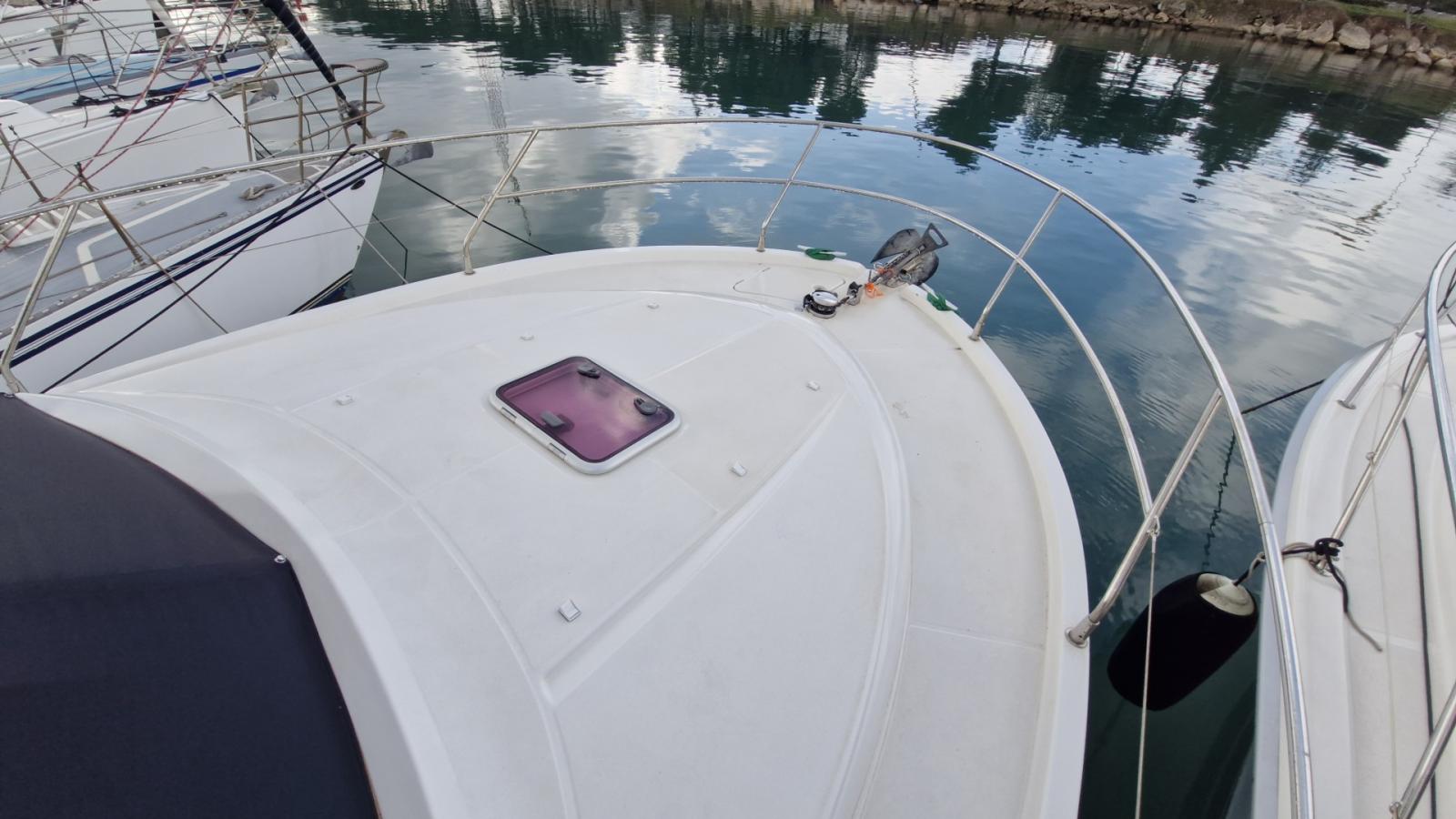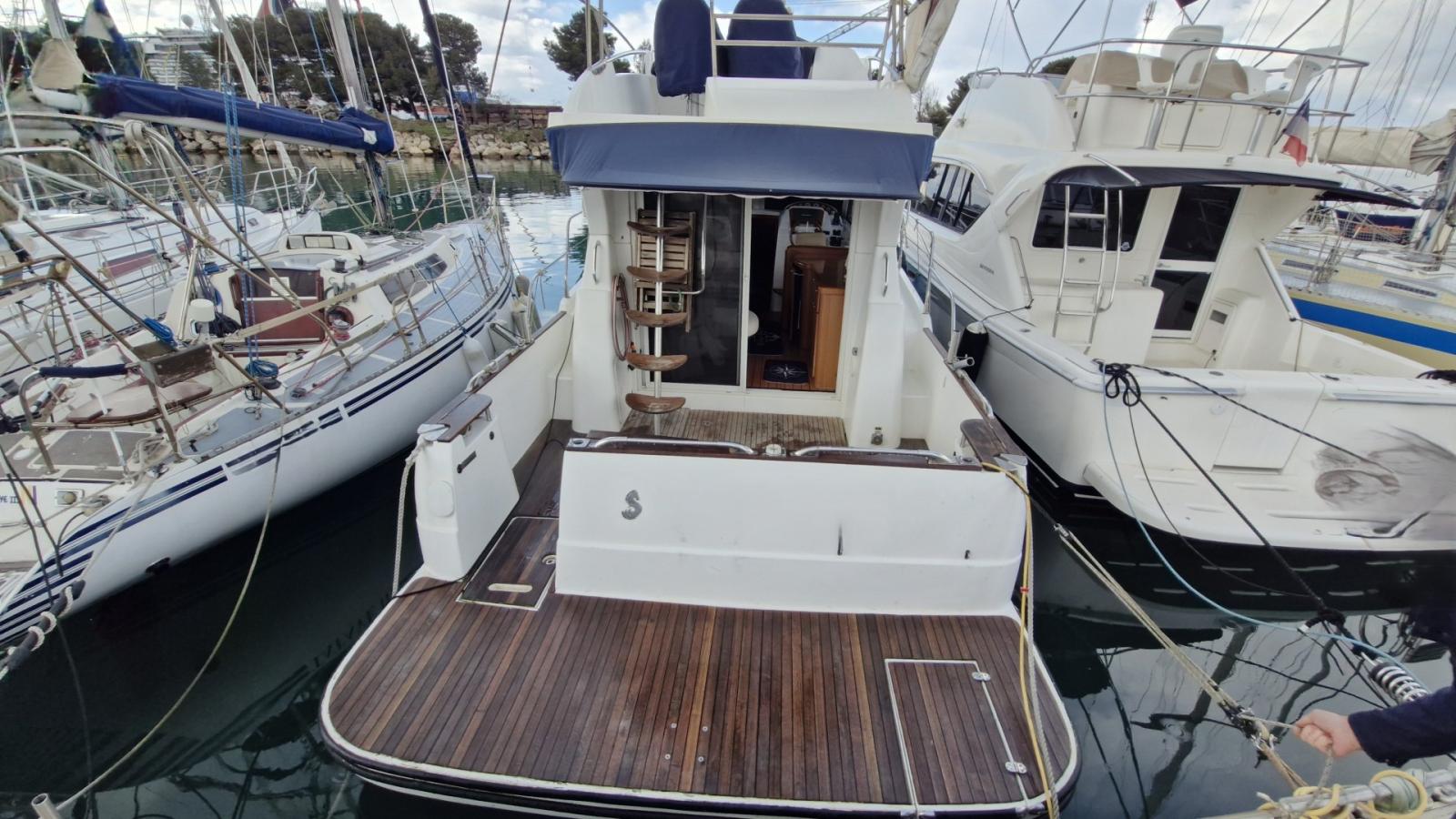 Flybridge, Cockpit teck, Éclairage cockpit, Plateforme de bain teck allongée, Carré transformable, 2 cabines, Couchettes simples et doubles, 7 couchages, Salle d’eau, Cuisine en long, Four / Micro-ondes combi, Chauffe-eau, Bain de soleil avant, Coussins cockpit, Bimini, Taud de camping microperforé, Taud de parebrise.