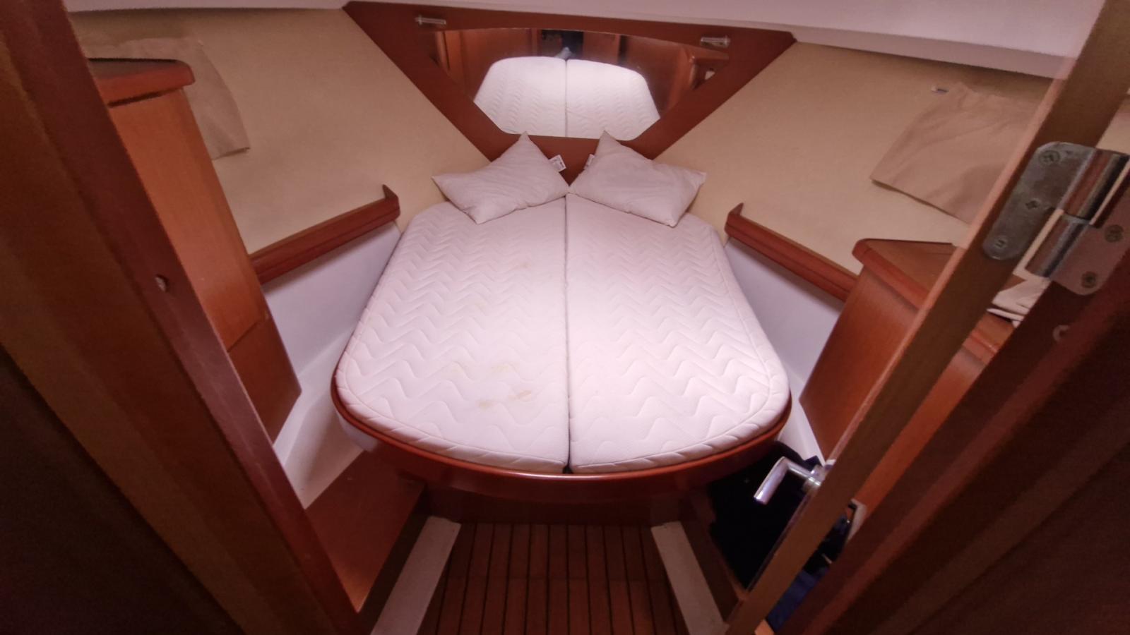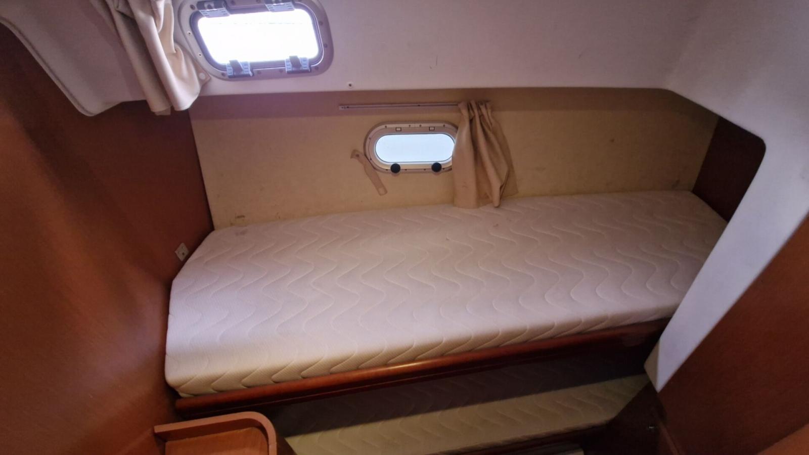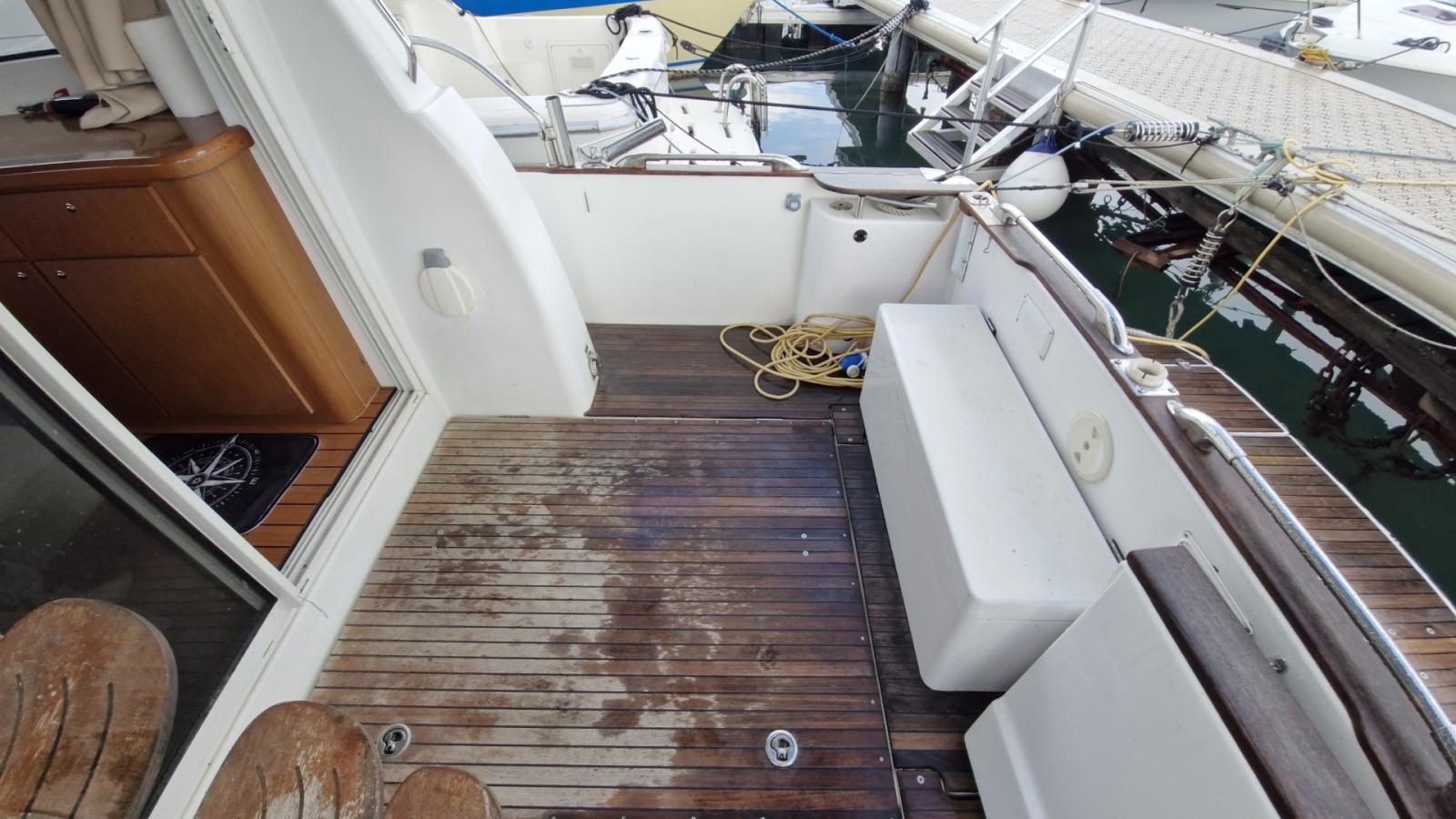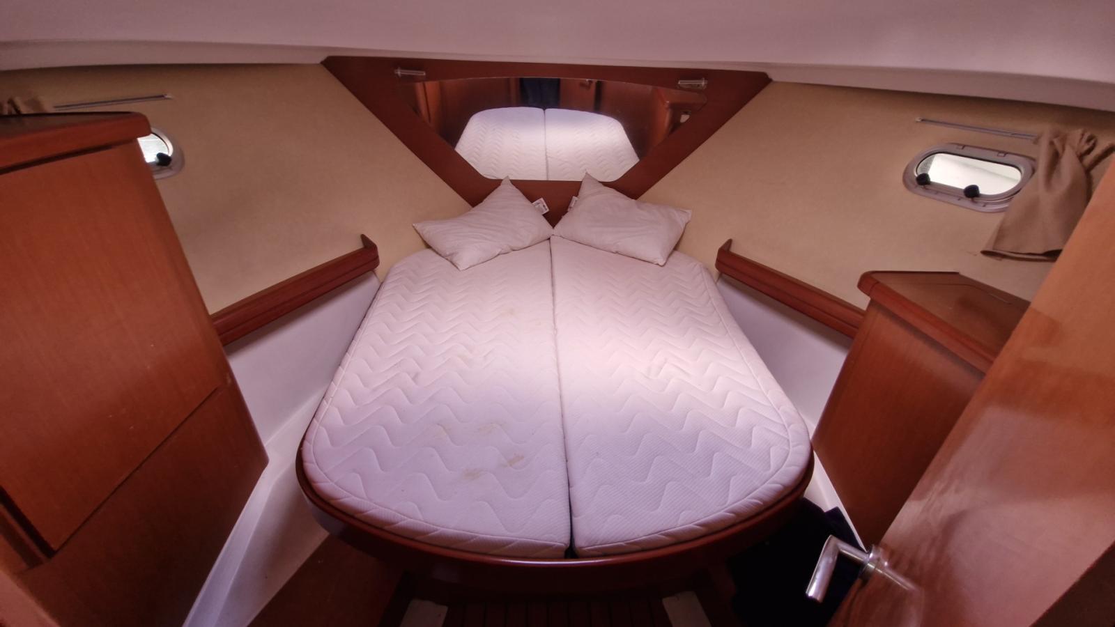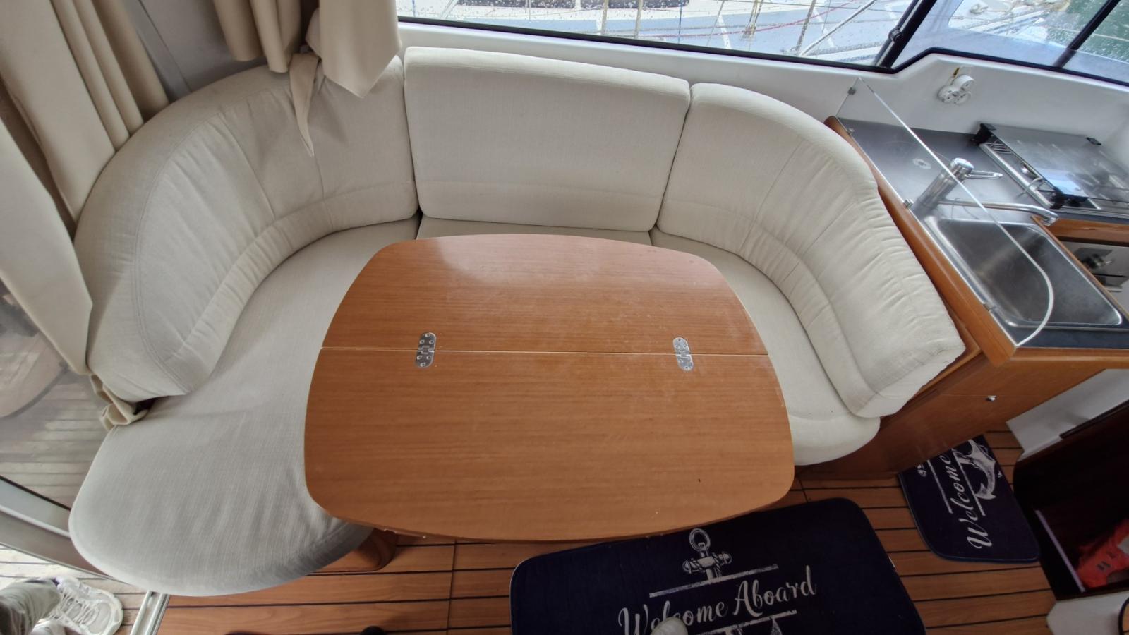 Flybridge, Cockpit teck, Éclairage cockpit, Plateforme de bain teck allongée, Carré transformable, 2 cabines, Couchettes simples et doubles, 7 couchages, Salle d’eau, Cuisine en long, Four / Micro-ondes combi, Chauffe-eau, Bain de soleil avant, Coussins cockpit, Bimini, Taud de camping microperforé, Taud de parebrise.