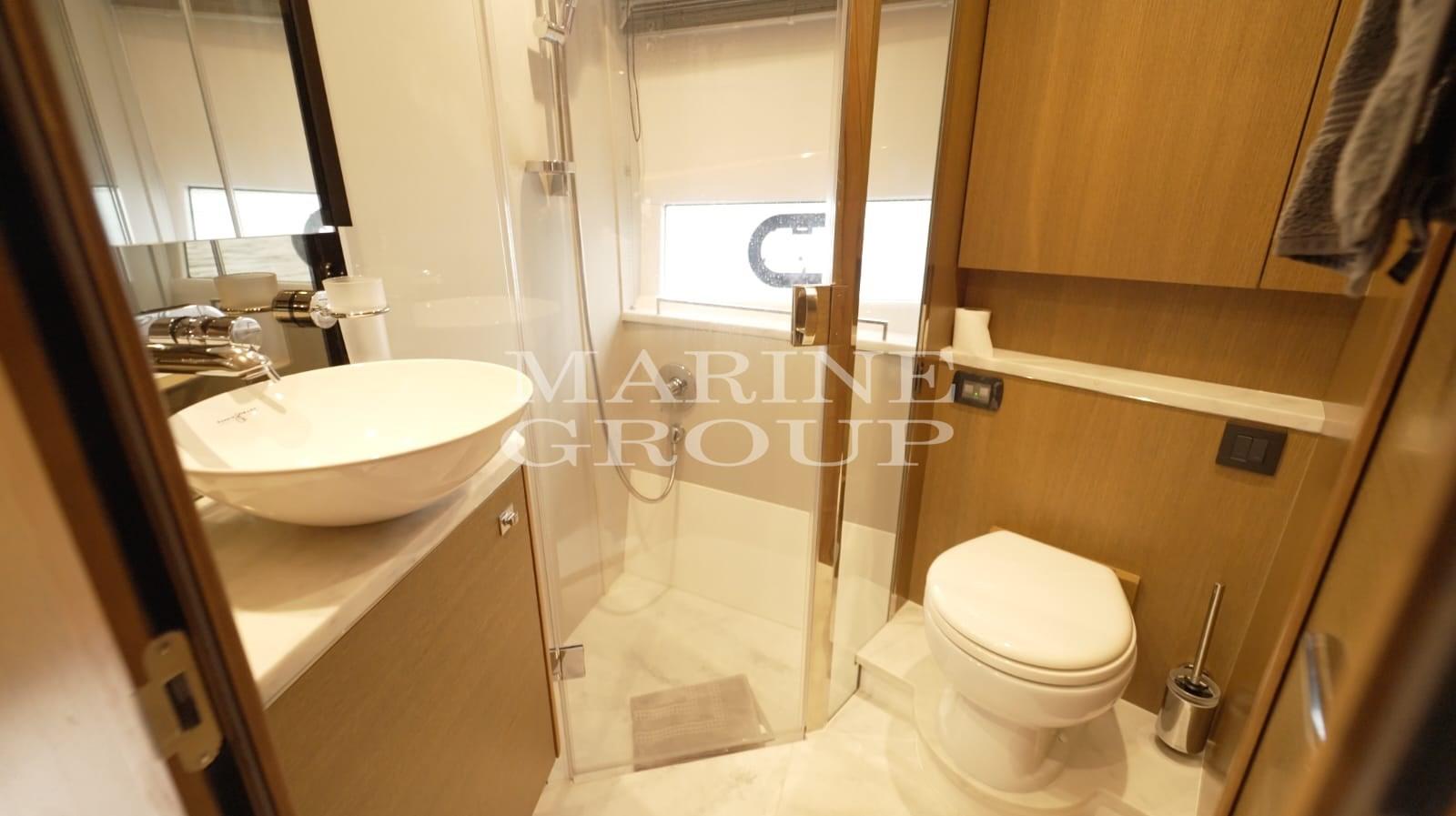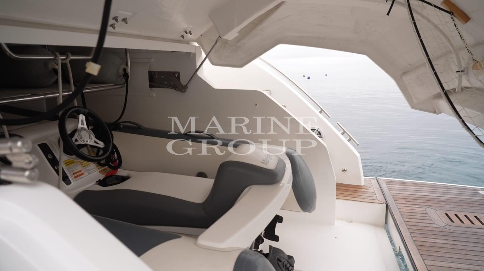 Douche de cockpit, Garage à annexe, Hard top, Lavabo dans le cockpit, Éclairage de courtoisie, Spots sous-marins, Passerelle (Elettro idraulica), Plateforme arrière (Affondante), Cockpit en teck, Prise de quai, Connexion eau sous pression à quai, Guindeau électrique, Echelle de bain, Stabilisateurs (Seakeeper), table de cockpit, Table pliante de salon, Corne.