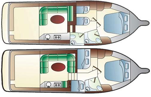 Cabine propriétaire à l’avant avec lit péninsule + salle de bain - Cabine d’invités avec lits plats + salle de bain