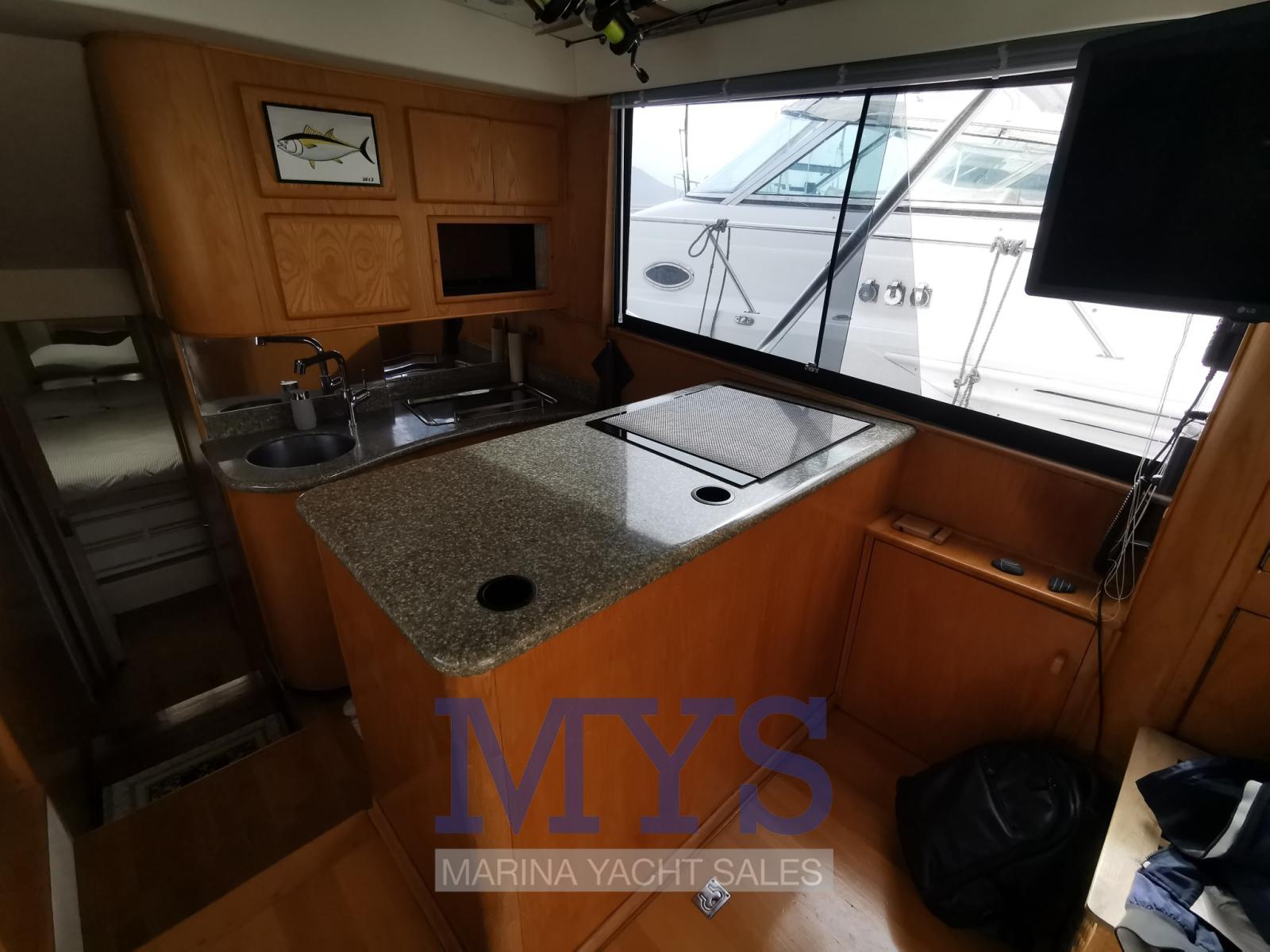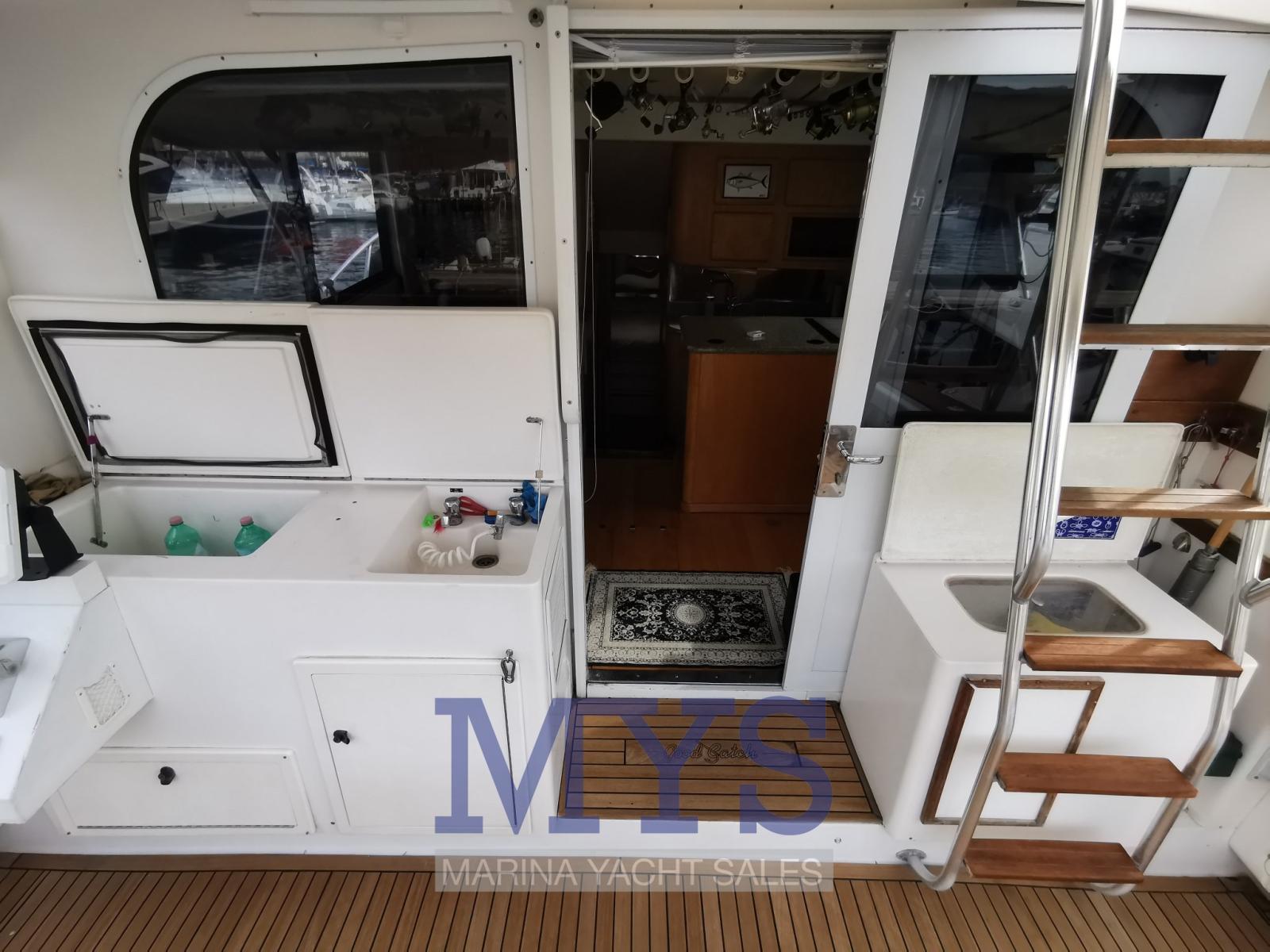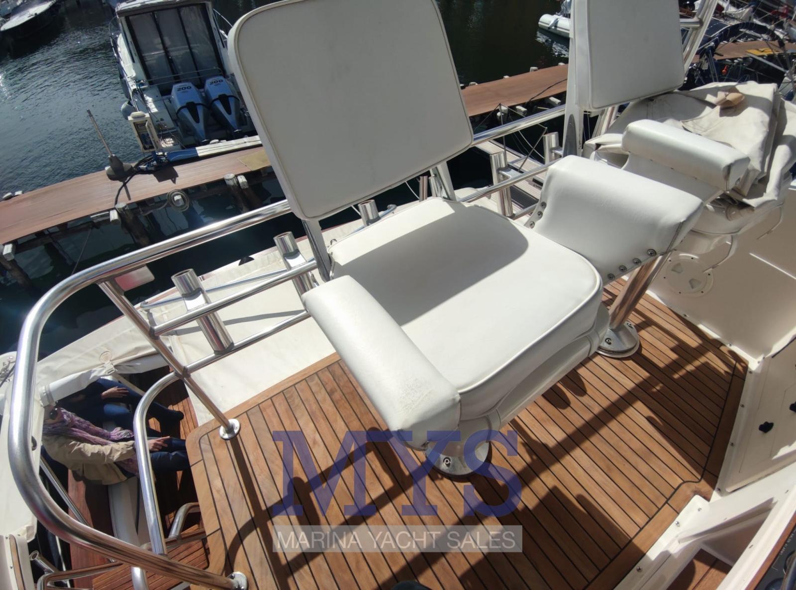 Alarme de pompe de cale, Eau sous pression, 13 Batteries, 3 Chargeur de batterie, Douche de cockpit (a prua e poppa caldo/freddo), Double barre à roue, 2 Flaps électriques, Extincteur(s) fixe(s), Compresseur de plongée, Indicateurs de flaps (solo sul Fly), Lavabo dans le cockpit, Éclairage de courtoisie, Plateforme arrière, 3 Pompe de cale automatique, 2 Pompe de cale manuelle, Porte latérale, Cockpit en teck, Prise de quai, Connexion eau sous pression à quai, Répétiteur électronique, Guindeau électrique, Echelle de bain, table de cockpit, Corne.