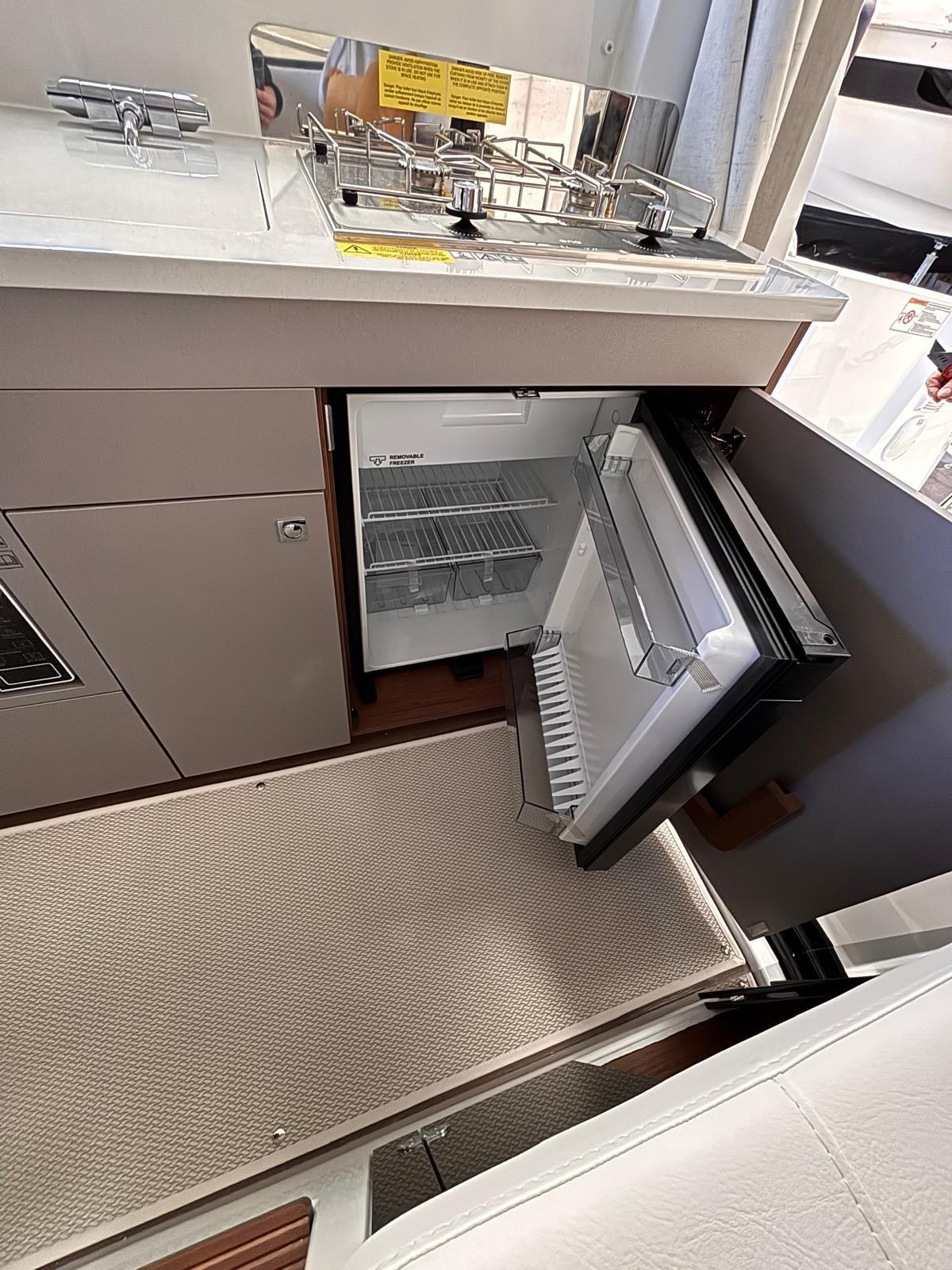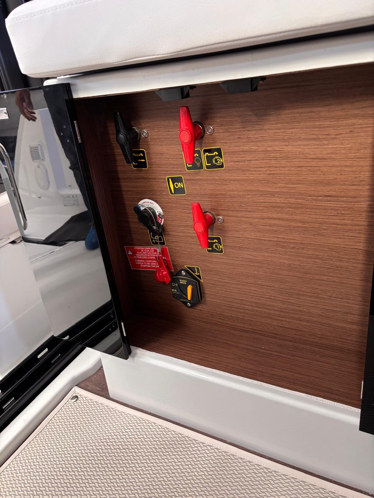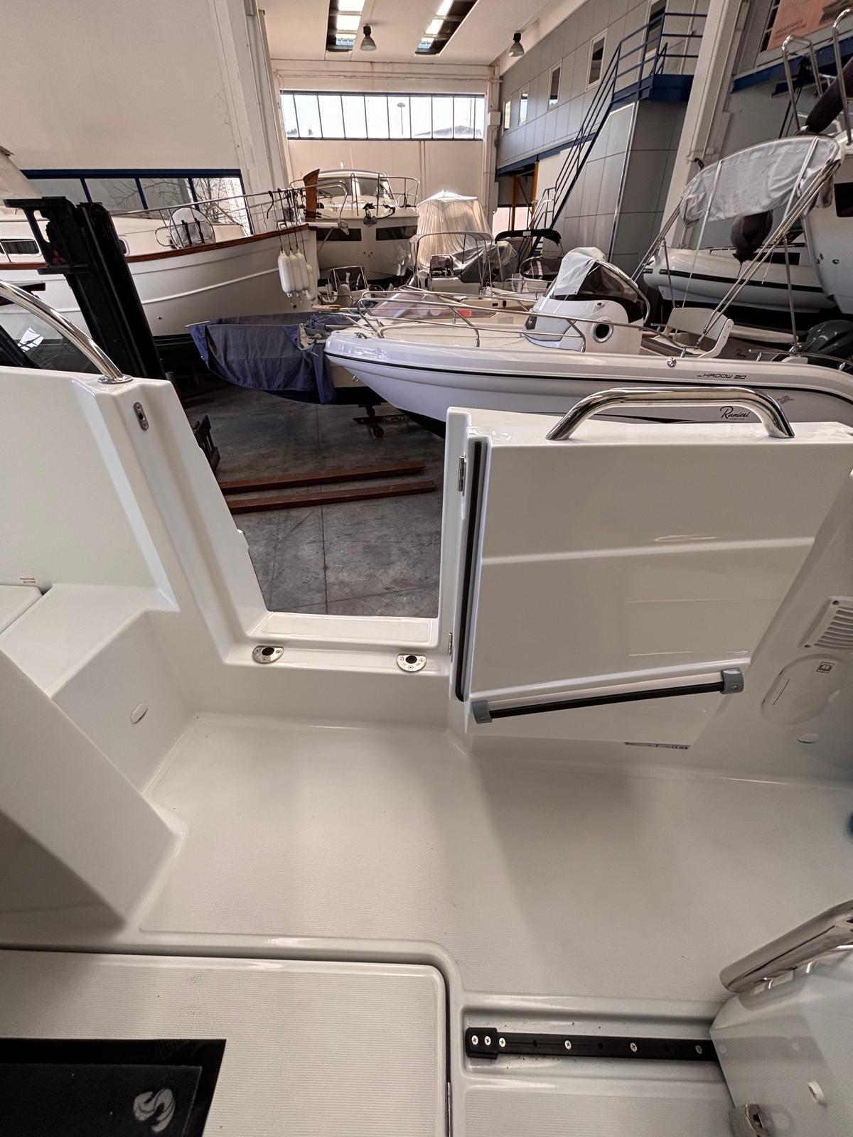 Alarme gaz, Alarme moteur, Alarme de pompe de cale, Eau sous pression, Douche de cockpit, Flaps hydrauliques, Hard top, Extincteur(s) fixe(s), Éclairage de courtoisie, Porte latérale, Porte latérale, Prise de quai, Guindeau électrique, table de cockpit, Table pliante de salon.